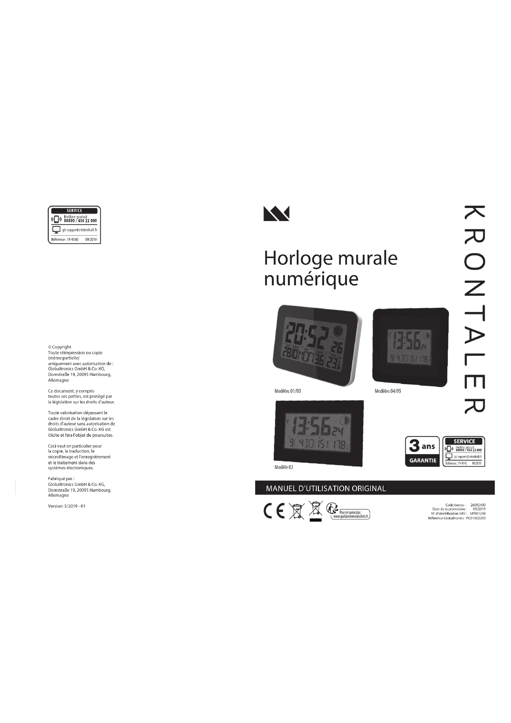 Code barres : 26095400 Date de la promotion : 09/2019 N° d’identification SAV : SIFR01248Référence Globaltronics : PO51002293 SERVICE Référence : 19-9540 09/2019Référence : 19-9540 09/2019Hotline gratuit00800 / 456 22 000Hotline gratuit00800 / 456 22 000 gt-support@teknihall.fr gt-support@teknihall.fr Modèles 01/03 Modèle 02 Modèles 04/0532 et de connaissances si ces personnes sont surveillées ou ont été instruites de l’utilisation sûre de l’horloge radiocommandée et des risques qui en résultent. Ne pas laisser les enfants jouer avec l’horloge radiocommandée. Le nettoyage et l’entretien d’utilisation ne doivent pas être eectués par des enfants sans surveillance.