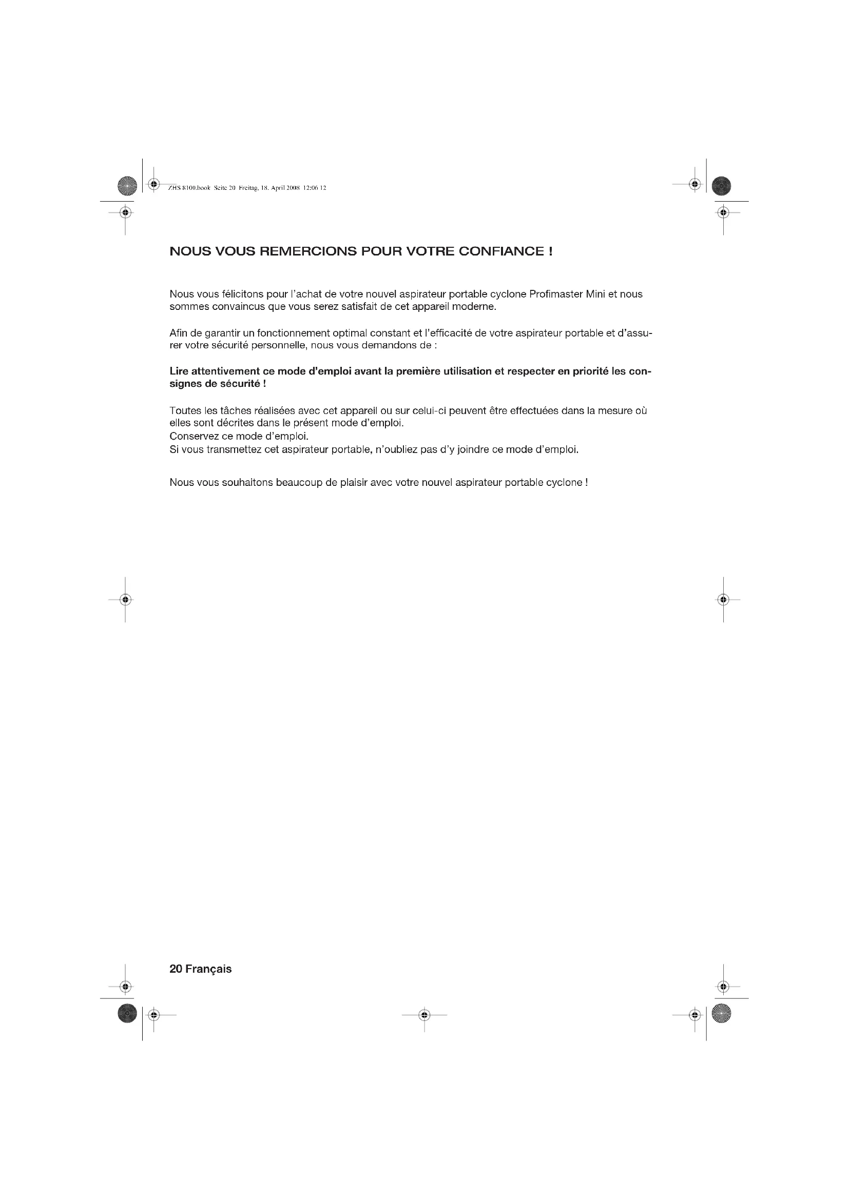 - 13. BON DE GARANTIE ZHS 8100.book Seite 19 Freitag, 18. April 2008 12:06 1220 Français NOUS VOUS REMERCIONS POUR VOTRE CONFIANCE ! Nous vous félicitons pour l’achat de votre nouvel aspirateur portable cyclone Profimaster Mini et nous sommes convaincus que vous serez satisfait de cet appareil moderne. Afin de garantir un fonctionnement optimal constant et l’efficacité de votre aspirateur portable et d’assu- rer votre sécurité personnelle, nous vous demandons de : Lire attentivement ce mode d’emploi avant la première utilisation et respecter en priorité les con- signes de sécurité ! Toutes les tâches réalisées avec cet appareil ou sur celui-ci peuvent être effectuées dans la mesure où elles sont décrites dans le présent mode d’emploi. Conservez ce mode d’emploi. Si vous transmettez cet aspirateur portable, n’oubliez pas d’y joindre ce mode d’emploi. Nous vous souhaitons beaucoup de plaisir avec votre nouvel aspirateur portable cyclone ! ZHS 8100.book Seite 20 Freitag, 18. April 2008 12:06 12Français 21 p. 31
