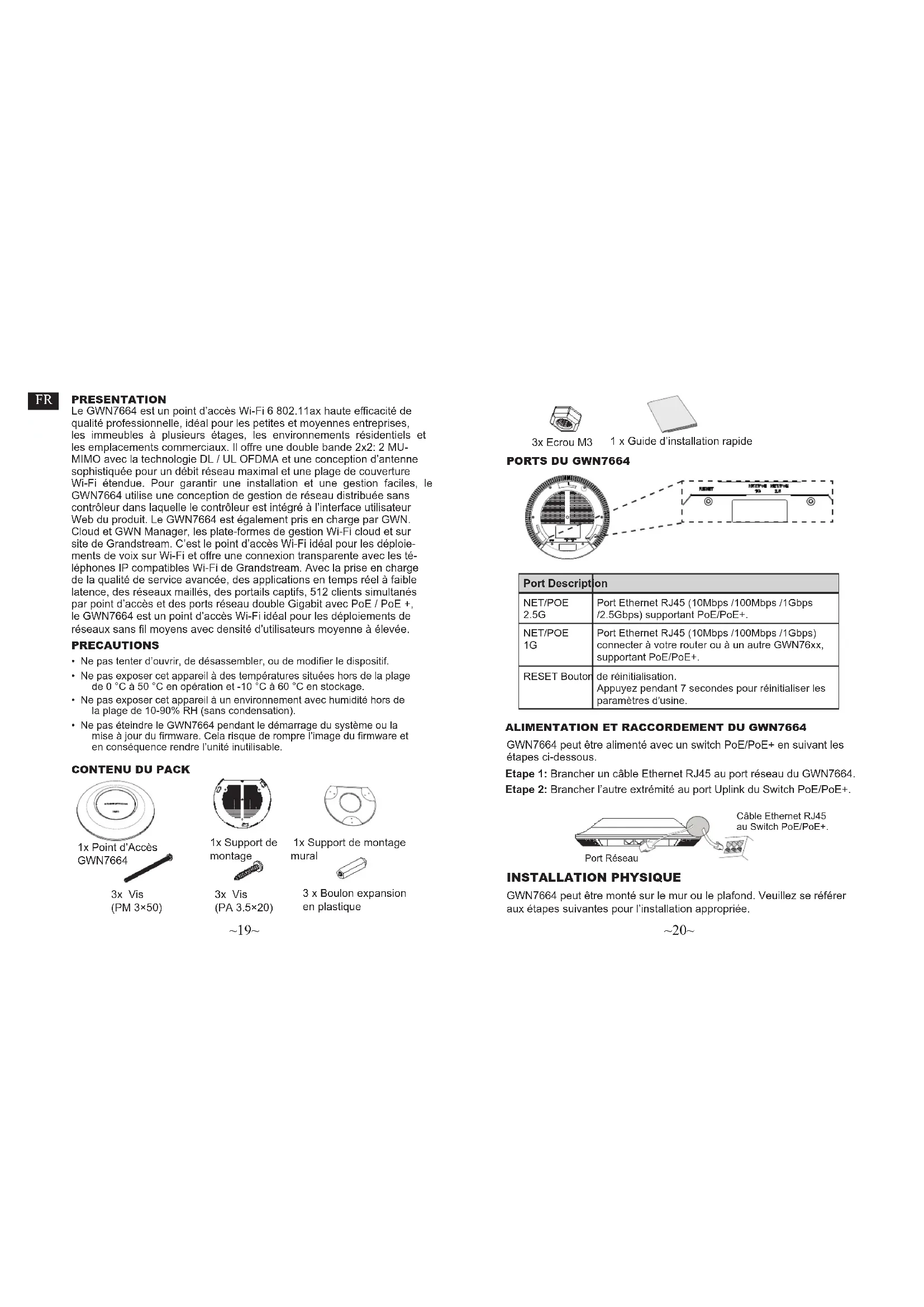 rectamente a la interfaz de conguración de la GWN7664, o escriba manualmente la dirección IP que se muestra en su navegador. This device complies with part 15 of the FCC rules. Operation is subject to the following two conditions: (1) this device may not cause harmful interference, and (2) this device must accept any interference received, including interference that may cause undesired operation. CAN ICES-3(B)/NMB-3(B)IC: 11964A-GWN7664FCC ID: YZZGWN7664 Model: GWN7664 Input: 48V 0.5A PoE~19~ ~20~ PRESENTATION Le GWN7664 est un point d’accès Wi-Fi 6 802.11ax haute ecacité de qualité professionnelle, idéal pour les petites et moyennes entreprises, les immeubles à plusieurs étages, les environnements résidentiels et les emplacements commerciaux. Il ore une double bande 2x2: 2 MU- MIMO avec la technologie DL / UL OFDMA et une conception d’antenne sophistiquée pour un débit réseau maximal et une plage de couverture Wi-Fi étendue. Pour garantir une installation et une gestion faciles, le GWN7664 utilise une conception de gestion de réseau distribuée sans contrôleur dans laquelle le contrôleur est intégré à l’interface utilisateur Web du produit. Le GWN7664 est également pris en charge par GWN. Cloud et GWN Manager, les plate-formes de gestion Wi-Fi cloud et sur site de Grandstream. C’est le point d’accès Wi-Fi idéal pour les déploie- ments de voix sur Wi-Fi et ore une connexion transparente avec les té- léphones IP compatibles Wi-Fi de Grandstream. Avec la prise en charge de la qualité de service avancée, des applications en temps réel à faible latence, des réseaux maillés, des portails captifs, 512 clients simultanés par point d’accès et des ports réseau double Gigabit avec PoE / PoE +, le GWN7664 est un point d’accès Wi-Fi idéal pour les déploiements de réseaux sans l moyens avec densité d’utilisateurs moyenne à élevée. PRECAUTIONS