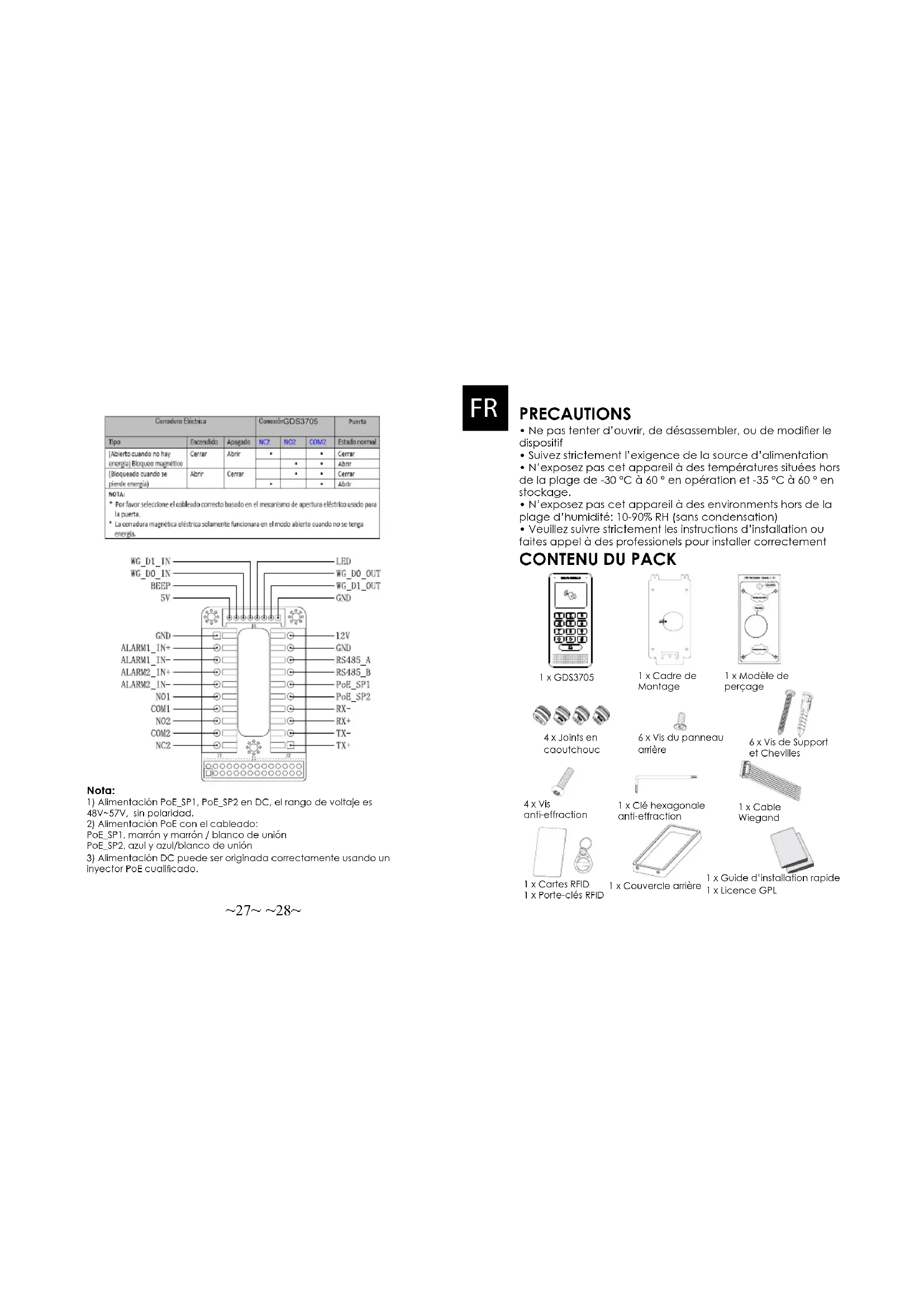 - Veuillez suivre strictement les instructions d’installation ou faites appel à des professionels pour installer correctement 1 x GDS37051 x Guide d’installation rapide1 x Licence GPL1 x Cadre de Montage1 x Cartes RFID1 x Porte-clés RFID4 x Joints en caoutchouc6 x Vis de Support et Chevilles6 x Vis du panneau arrière4 x Vis anti-effraction1 x Clé hexagonale anti-effraction1 x Modèle de perçage1 x Cable Wiegand1 x Couvercle arrière