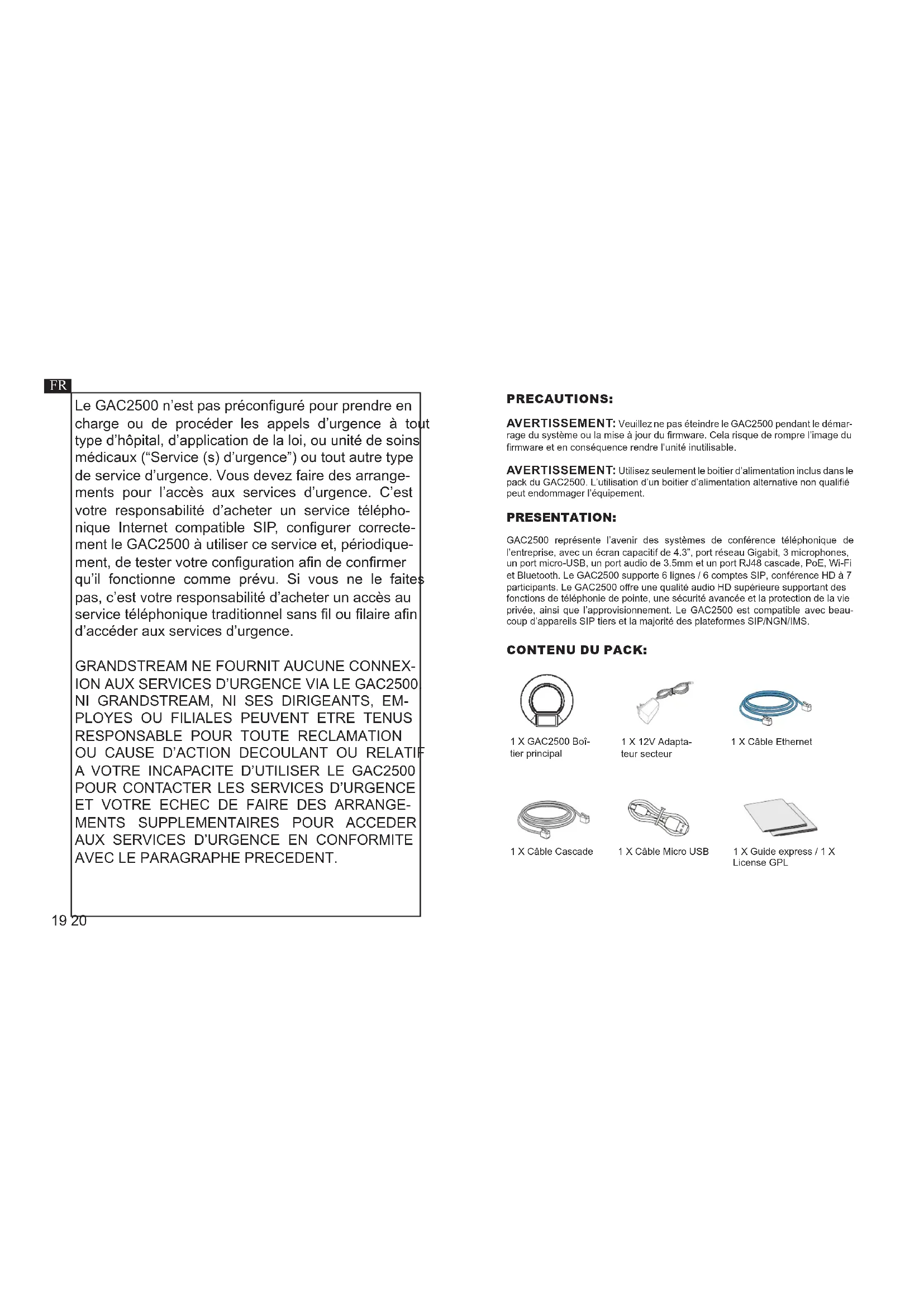 1 X Câble Cascade 1 X Câble Micro USB GAC2500 représente l’avenir des systèmes de conférence téléphonique de l’entreprise, avec un écran capacitif de 4.3”, port réseau Gigabit, 3 microphones, un port micro-USB, un port audio de 3.5mm et un port RJ48 cascade, PoE, Wi-Fi et Bluetooth. Le GAC2500 supporte 6 lignes / 6 comptes SIP, conférence HD à 7 participants. Le GAC2500 ore une qualité audio HD supérieure supportant des fonctions de téléphonie de pointe, une sécurité avancée et la protection de la vie privée, ainsi que l’approvisionnement. Le GAC2500 est compatible avec beau- coup d’appareils SIP tiers et la majorité des plateformes SIP/NGN/IMS. PRECAUTIONS: PRESENTATION: CONTENU DU PACK: 1 X GAC2500 Boî- tier principal 1 X 12V Adapta- teur secteur 1 X Câble Ethernet 1 X Guide express / 1 X License GPL