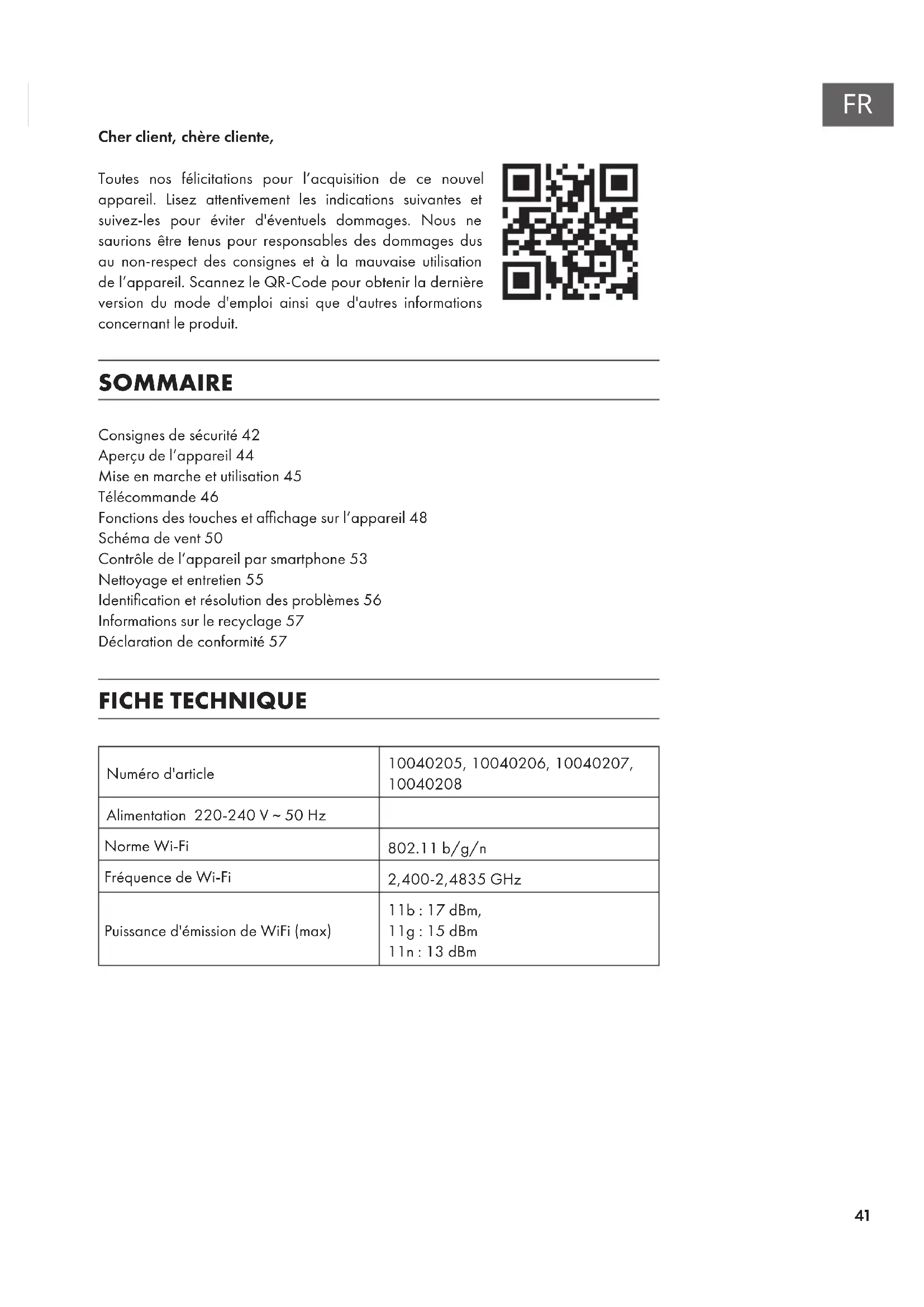 Cher client, chère cliente, Toutes nos félicitations pour l’acquisition de ce nouvel appareil. Lisez attentivement les indications suivantes et suivez-les pour éviter d'éventuels dommages. Nous ne saurions être tenus pour responsables des dommages dus au non-respect des consignes et à la mauvaise utilisation de l’appareil. Scannez le QR-Code pour obtenir la dernière version du mode d'emploi ainsi que d'autres informations concernant le produit. SOMMAIRE Consignes de sécurité 42 Aperçu de l’appareil 44 Mise en marche et utilisation 45 Télécommande 46 Fonctions des touches et afchage sur l’appareil 48 Schéma de vent 50 Contrôle de l’appareil par smartphone 53 Nettoyage et entretien 55 Identication et résolution des problèmes 56 Informations sur le recyclage 57 Déclaration de conformité 57 FICHE TECHNIQUE Numéro d'article 10040205, 10040206, 10040207,