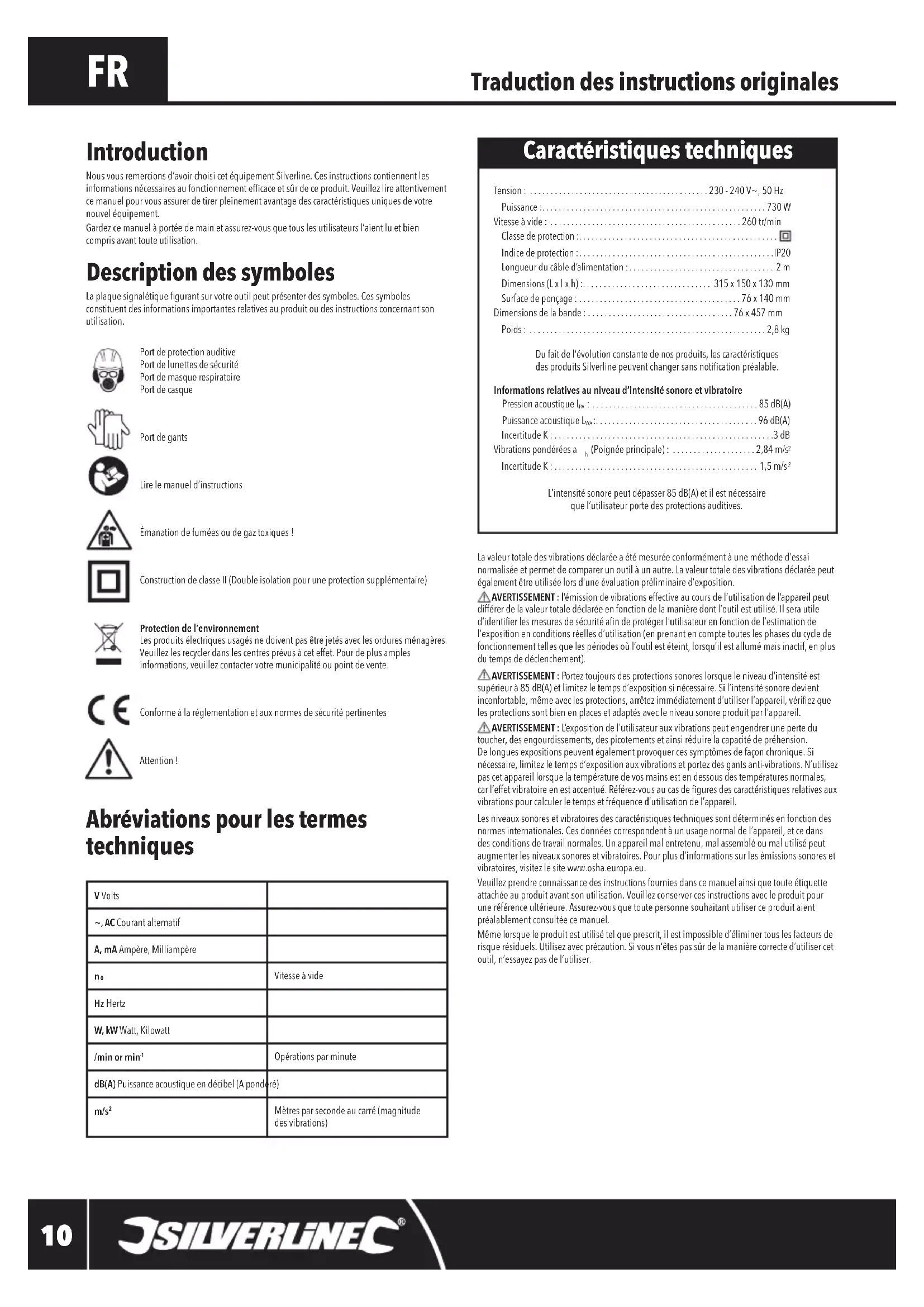 toucher, des engourdissements, des picotements et ainsi réduire la capacité de préhension. Delonguesexpositionspeuventégalementprovoquercessymptômesdefaçonchronique.Sinécessaire,limitezletempsd’expositionauxvibrationsetportezdesgantsanti-vibrations.N’utilisezpascetappareillorsquelatempératuredevosmainsestendessousdestempératuresnormales,carl’effetvibratoireenestaccentué.Référez-vousaucasdeguresdescaractéristiquesrelativesauxvibrationspourcalculerletempsetfréquenced’utilisationdel’appareil.Lesniveauxsonoresetvibratoiresdescaractéristiquestechniquessontdéterminésenfonctiondesnormesinternationales.Cesdonnéescorrespondentàunusagenormaldel’appareil,etcedansdes conditions de travail normales. Un appareil mal entretenu, mal assemblé ou mal utilisé peut augmenterlesniveauxsonoresetvibratoires.Pourplusd’informationssurlesémissionssonoresetvibratoires,visitezlesitewww.osha.europa.eu.Veuillezprendreconnaissancedesinstructionsfourniesdanscemanuelainsiquetouteétiquetteattachée au produit avant son utilisation. Veuillez conserver ces instructions avec le produit pour uneréférenceultérieure.Assurez-vousquetoutepersonnesouhaitantutiliserceproduitaientpréalablement consultée ce manuel.Mêmelorsqueleproduitestutilisételqueprescrit,ilestimpossibled’éliminertouslesfacteursderisquerésiduels.Utilisezavecprécaution.Sivousn’êtespassûrdelamanièrecorrected’utilisercetoutil,n’essayezpasdel’utiliser. Abréviations pour les termes techniques Description des symboles Laplaquesignalétiquegurantsurvotreoutilpeutprésenterdessymboles.Cessymbolesconstituent des informations importantes relatives au produit ou des instructions concernant son utilisation.Port de protection auditive Port de lunettes de sécurité Portdemasquerespiratoire PortdecasquePort de gantsLirelemanueld’instructionsÉmanationdefuméesoudegaztoxiques!Construction de classe II (Double isolation pour une protection supplémentaire)Protection de l’environnement Lesproduitsélectriquesusagésnedoiventpasêtrejetésaveclesorduresménagères.Veuillez les recycler dans les centres prévus à cet effet. Pour de plus amples informations, veuillez contacter votre municipalité ou point de vente.Conforme à la réglementation et aux normes de sécurité pertinentes Attention ! Introduction Nousvousremercionsd’avoirchoisicetéquipementSilverline.Cesinstructionscontiennentlesinformationsnécessairesaufonctionnementefcaceetsûrdeceproduit.Veuillezlireattentivementcemanuelpourvousassurerdetirerpleinementavantagedescaractéristiquesuniquesdevotrenouveléquipement.Gardezcemanuelàportéedemainetassurez-vousquetouslesutilisateursl’aientluetbiencompris avant toute utilisation. Traduction des instructions originales
