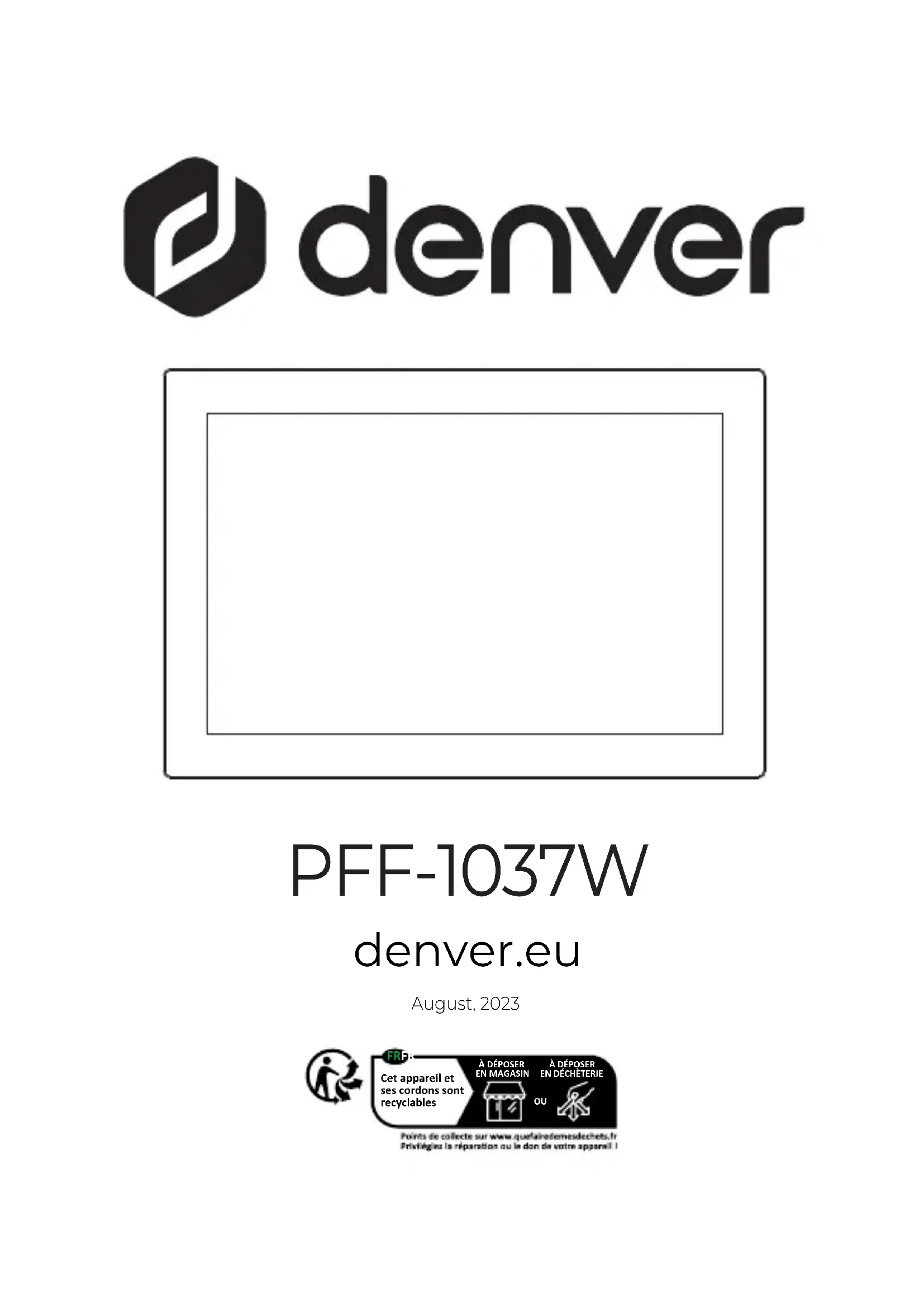 Confidentialité Pour obtenir plus d’informations concernant la confidentialité, rendez-vous sur http://privacy.frameo.net Assistance Rendez-vous sur https://support.frameo.net/hc pour lire la FAQ, obtenir de l’aide et nous faire part de vos commentaires. Garantie, respect des normes, assistance et informations de sécurité Pour obtenir plus d’informations concernant la garantie, le respect des normes matérielles, l’assistance et la sécurité, consultez la documentation incluse dans la boîte.Remarque - Tous les produits sont susceptibles d’être modifiés sans préavis. Ce document est établi sous toute réserve d’erreur et d’omission. TOUS DROITS RÉSERVÉS, COPYRIGHT DENVER A/S Les équipements électriques et électroniques contiennent des matériaux, composants et substances qui peuvent nuire à votre santé et à l’environnement si ces déchets (appareils électriques et électroniques) ne sont pas traités de façon appropriée. Les équipements électriques et électroniques sont marqués du symbole d’une poubelle barrée, comme illustré ci-dessus. Ce symbole indique que les appareils électriques et électroniques doivent être triés et jetés séparément des ordures ménagères. Toutes les municipalités disposent de points de collecte dans lesquels les appareils électriques et électroniques peuvent être déposés sans frais en vue de leur recyclage, ou offrent des services de ramassage des déchets. Vous pouvez obtenir des informations supplémentaires auprès des services de votre municipalité. Par la présente, PFF-1037B est conforme à la directive 2014/53/EU. Denver A/S déclare que l’équipement radioélectrique du type Le texte intégral de la déclaration de conformité UE est disponible à l’adresse Internet suivante : denver.eu, et cliquez sur l’icône de recherche située en haut de la page. Numéro de modèle : PFF-1037B. Entrez dans la page produit, la directive RED se trouve dans Téléchargements/Autres téléchargements. Plage de fréquence de fonctionnement : 2412 - 2472 MHz Puissance de sortie maximale : 17 dbm