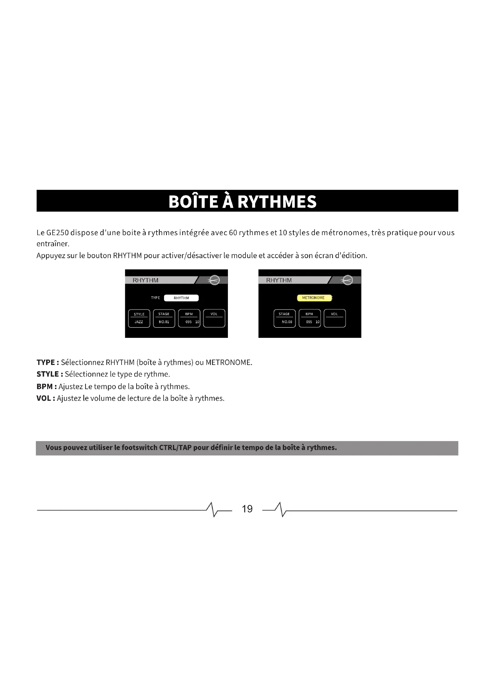 LeGE250disposed'uneboiteàrythmesintégréeavec60rythmeset10stylesdemétronomes,trèspratiquepourvous entraîner. AppuyezsurleboutonRHYTHMpouractiver/désactiverlemoduleetaccéderàsonécrand'édition. RHYTHM METRONOMETYPE RHYTHM TYPE NO.01095 10 BPM VOL STAGEJAZZNO.08095 10 BPM VOL STAGE TYPE:SélectionnezRHYTHM(boîteàrythmes)ouMETRONOME. STYLE:Sélectionnezletypederythme. BPM:AjustezLetempodelaboîteàrythmes. VOL:Ajustezlevolumedelecturedelaboîteàrythmes. VouspouvezutiliserlefootswitchCTRL/TAPpourdéfinirletempodelaboîteàrythmes.20 LOOPER LeGE250disposed'unLooperintégrécompletde70secondesaveceffets. AppuyezsimultanémentsurlesfootswitchsBetCpouraccéderàl'écranduLooper. LOOPER REC: 100P025 MOOER GE250OFF 00.0SPLAY: 100REVERSE: OFF HALF SPEED: OFF PRESET VouspouvezutiliserlamoletteVALUEpourajusterlesparamètressuivants: PLAY:VolumedelectureduLooper. REC:Volumed'enregistrementduLooper PRESET:Presetsélectionné Remarque:Lamémoiredulooperesteffacéequandl'appareilestmishorstension. UtilisezlesfootswitchsA,BetCpourcontrôlerleLooper. A:Appuyezpouractiver/désactiverl'effetdelectureinversée(REVERSE). B:Appuyezpouractiver/désactiverl'effetdevitessedelecturediviséepardeux(HALFSPEED).