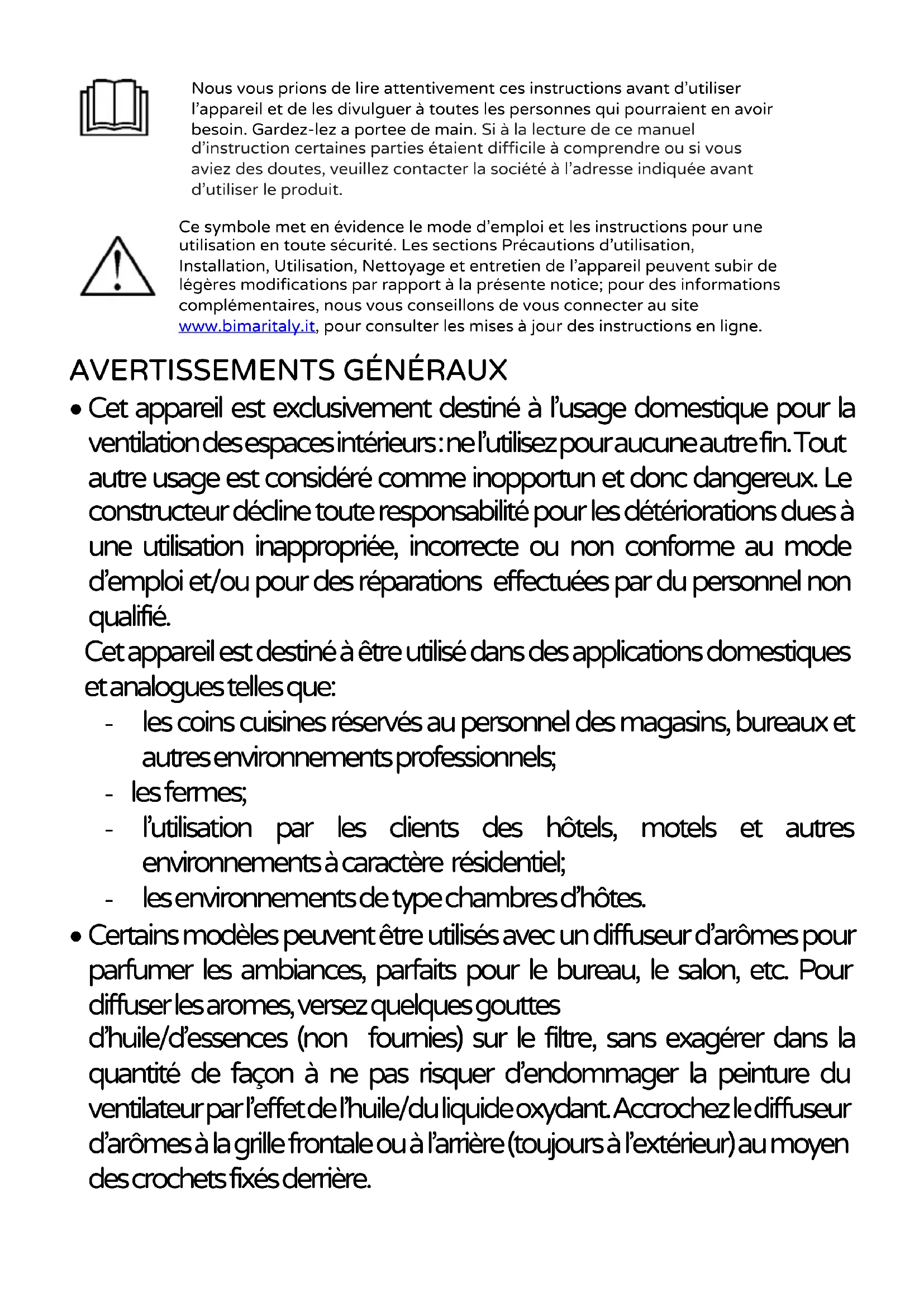 Ce symbole met en évidence le mode d’emploi et les instructions pour une utilisation en toute sécurité. Les sections Précautions d’utilisation, Installation, Utilisation, Nettoyage et entretien de l’appareil peuvent subir de légères modifications par rapport à la présente notice; pour des informations complémentaires, nous vous conseillons de vous connecter au site www.bimaritaly.it, pour consulter les mises à jour des instructions en ligne.