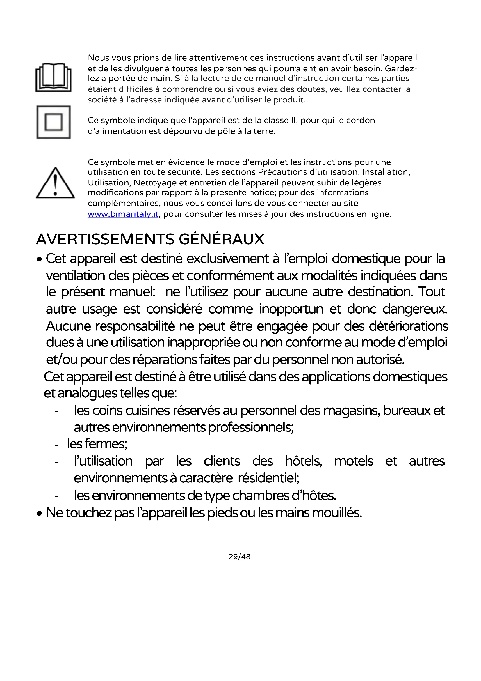 Ce symbole met en évidence le mode d’emploi et les instructions pour une utilisation en toute sécurité. Les sections Précautions d’utilisation, Installation, Utilisation, Nettoyage et entretien de l’appareil peuvent subir de légères modifications par rapport à la présente notice; pour des informations complémentaires, nous vous conseillons de vous connecter au site www.bimaritaly.it, pour consulter les mises à jour des instructions en ligne.