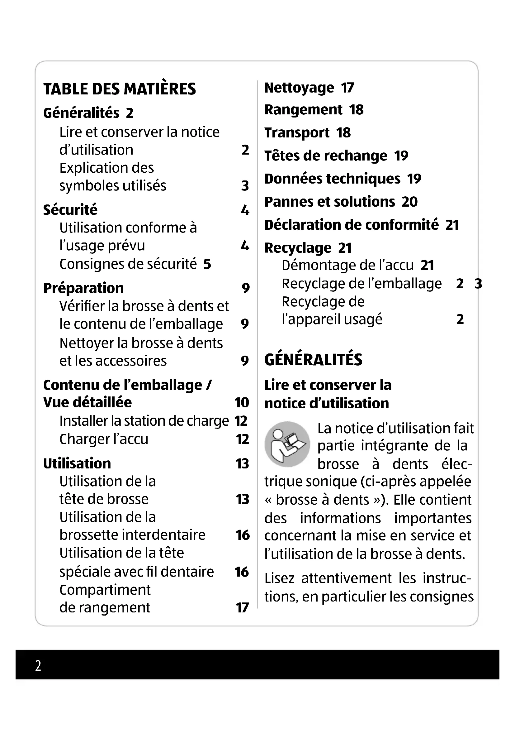 Généralités 2 Lire et conserver la notice d’utilisation 2 Explication des symboles utilisés 3 Sécurité 4 Utilisation conforme à l’usage prévu 4 Consignes de sécurité 5 Préparation 9 Vérifi er la brosse à dents et le contenu de l’emballage 9 Nettoyer la brosse à dents et les accessoires 9 Contenu de l’emballage / Vue détaillée 10 Installer la station de charge 12 Charger l’accu 12 Utilisation 13 Utilisation de la tête de brosse 13 Utilisation de la brossette interdentaire 16 Utilisation de la tête spéciale avec fi l dentaire 16 Compartiment de rangement 173 de sécurité, avant d’utiliser la brosse à dents. Le non respect de la notice d’utilisation risque de provoquer des blessures graves ou d’endommager la brosse à dents. La notice d’utilisation est basée sur les normes et règles en vi- gueur dans l’Union européenne. Respectez également les direc- tives et lois spécifi ques de votre pays. Conservez la notice afi n de pou- voir la relire ultérieurement. Joignez impérativement la no- tice d’utilisation si vous cédez la brosse à dents à une autre per- sonne. Explication des symboles utilisés Les symboles et mots-clés sui- vants sont utilisés dans la notice d’utilisation, sur le produit ou sur l’emballage. AVERTISSEMENT ! Ce symbole / mot-clé indique un risque moyen susceptible d’entraîner la mort ou de provo- quer une blessure grave si le risque n’est pas évité. PRUDENCE! Ce symbole / mot- clé indique un risque faible susceptible d’entraî- ner une blessure légère ou moyen- nement grave s’il n’est pas évité. REMARQUE ! Ce symbole / mot-clé indique un risque de dommages maté- riels éventuels. Ce symbole vous donne des informations supplé- mentaires utiles concernant l’as- semblage ou l’utilisation du pro- duit.4 SÉCURITÉ Utilisation conforme à l’usage prévu La brosse à dents est exclusive- ment conçue pour le brossage des dents. Elle est exclusivement destinée à être utilisée dans le cadre privé et n’est pas adaptée à une utilisation professionnelle. Utilisez toujours la brosse à dents conformément aux instructions de la notice d’utilisation. Toute autre utilisation est consi- dérée comme non conforme à l’usage prévu et peut provoquer des dommages matériels ou cor- porels. La brosse à dents n’est pas un jouet. Le fabricant ou le reven- deur n’assume aucune respon- sabilité pour des dommages qui résultent d’une utilisation incor- recte ou non conforme à l’usage prévu. Déclaration de confor- mité (voir chapitre « Déclaration de confor- mité »). Les produits portant ce symbole sont conformes à toutes les réglementations applicables dans l’Espace écono- mique européen. Le label « Geprüfte Si- cherheit (Sécurité contrôlée) » (label GS) indique que ce produit est conforme aux spécifi cations de la législation sur la sécurité des produits. Protection IP67 : étanche à la poussière et protection inté- grale contre un contact éventuel avec des éléments sous tension. Temporairement étanche (30 minutes à 1 mètre de profondeur d’eau à la pression ambiante). Classe de protection II / (station de charge) : équipement avec une double isolation ou une isolation renfor- cée entre le circuit secteur et la tension de sortie.5 Consignes de sécurité AVERTISSEMENT ! Risque d’électrocution ! Une installation électrique dé- fectueuse ou une tension du sec- teur trop élevée peut provoquer une électrocution. − Branchez la station de charge uniquement si la tension de la prise de courant est conforme aux indications de la plaque signalétique.