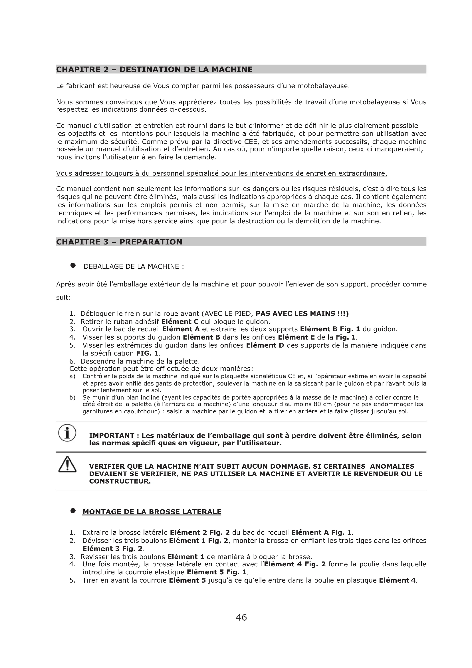 Le fabricant est heureuse de Vous compter parmi les possesseurs d’une motobalayeuse. Nous sommes convaincus que Vous apprécierez toutes les possibilités de travail d’une motobalayeuse si Vous respectez les indications données ci-dessous. Ce manuel d’utilisation et entretien est fourni dans le but d’informer et de dé nir le plus clairement possible les objectifs et les intentions pour lesquels la machine a été fabriquée, et pour permettre son utilisation avec le maximum de sécurité. Comme prévu par la directive CEE, et ses amendements successifs, chaque machine possède un manuel d’utilisation et d’entretien. Au cas où, pour n’importe quelle raison, ceux-ci manqueraient, nous invitons l’utilisateur à en faire la demande. Vous adresser toujours à du personnel spécialisé pour les interventions de entretien extraordinaire. Ce manuel contient non seulement les informations sur les dangers ou les risques résiduels, c’est à dire tous les risques qui ne peuvent être éliminés, mais aussi les indications appropriées à chaque cas. Il contient également les informations sur les emplois permis et non permis, sur la mise en marche de la machine, les données techniques et les performances permises, les indications sur l’emploi de la machine et sur son entretien, les indications pour la mise hors service ainsi que pour la destruction ou la démolition de la machine.