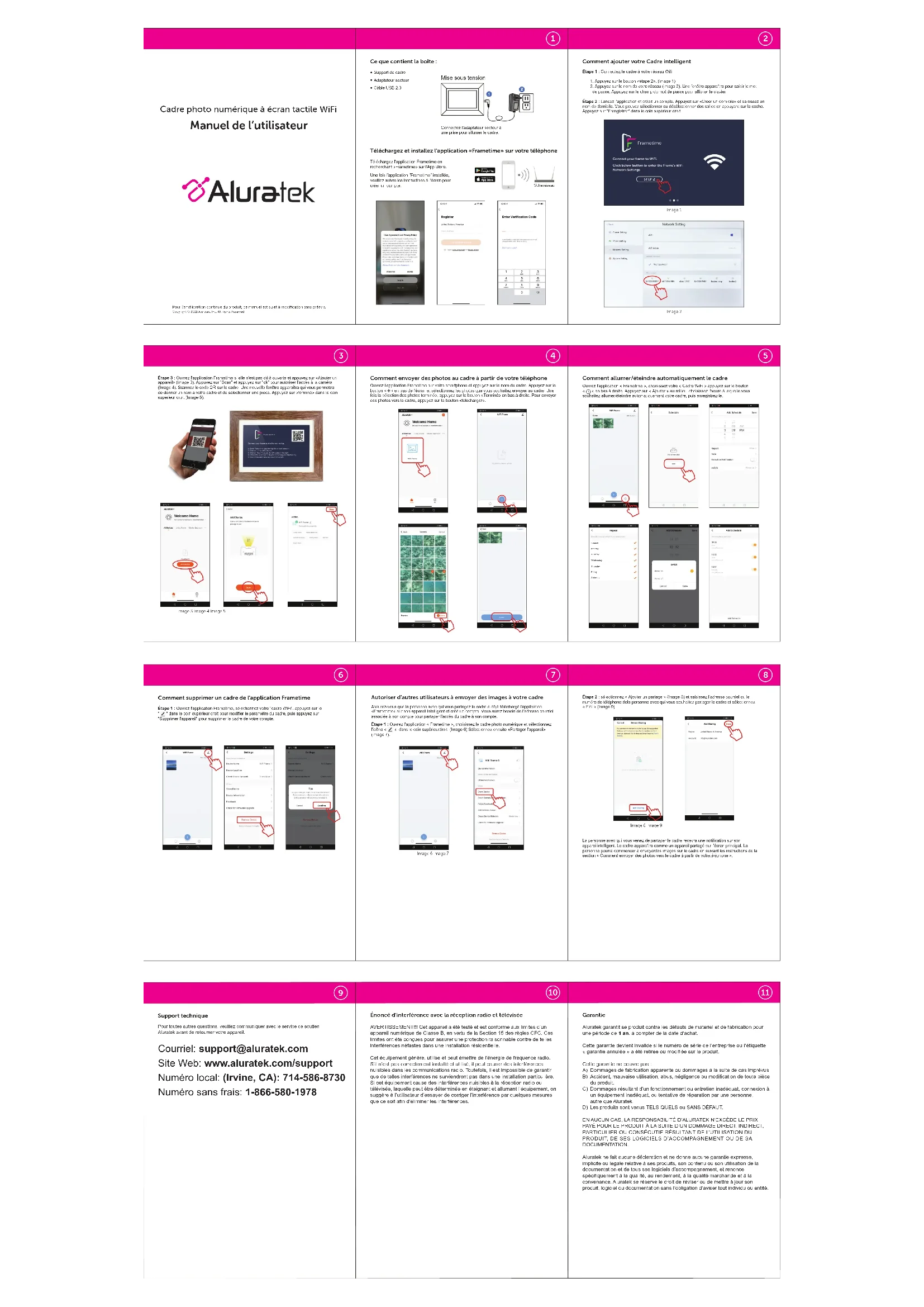 Étape 2 : Lancez l'application et créez un compte. Appuyez sur «Créer un domicile» et saisissez un nom de domicile. Vous pouvez sélectionner ou désélectionner des salles en appuyant sur la coche. Appuyez sur "Enregistrer" dans le coin supérieur droit.Connectez l'adaptateur secteur àune prise pour allumer le cadre. Téléchargez et installez l'application «Frametime» sur votre téléphone Téléchargez l'application Frametime en recherchant «Frametime» sur l'App Store.Une fois l'application "Frametime" installée, veuillez suivre les instructions à l'écran pour créer un compte.Votre réseau Ce que contient la boîte : Mise sous tension Support de cadre Adaptateur secteur Câble USB 2.0Pour l'amélioration continue du produit, ce manuel est sujet à modification sans préavis. Manuel de l’utilisateur Copyright © 2021 Aluratek, Inc. All Rights Reserved. Cadre photo numérique à écran tactile WiFi Comment supprimer un cadre de l'application Frametime Étape 1 : Ouvrez l'application Frametime, sélectionnez votre "cadre WiFi", appuyez sur le " " dans le coin supérieur droit pour modifier le paramètre du cadre, puis appuyez sur "Supprimer l'appareil" pour supprimer le cadre de votre compte.Image 6 Image 7