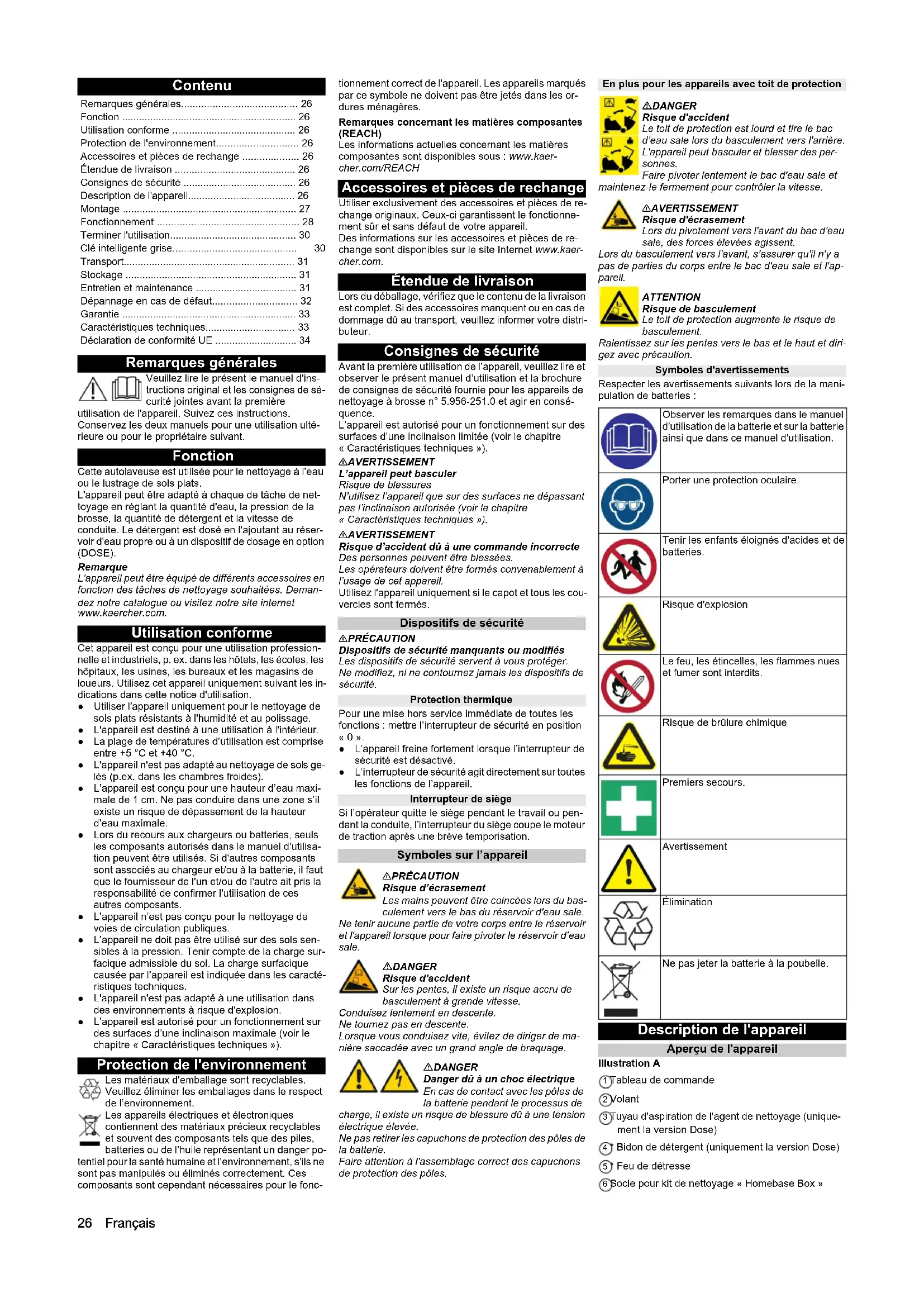 - - - 2943 (30) 2943 (30) - R 75 D 75 R 85 D 90 D 110 EU Declaration of Conformity Declaration of Conformity (UK)26 Français Contenu Remarques générales Veuillez lire le présent le manuel d'ins- tructions original et les consignes de sé- curité jointes avant la première utilisation de l'appareil. Suivez ces instructions. Conservez les deux manuels pour une utilisation ulté- rieure ou pour le propriétaire suivant. Fonction Cette autolaveuse est utilisée pour le nettoyage à l’eau ou le lustrage de sols plats. L'appareil peut être adapté à chaque de tâche de net- toyage en réglant la quantité d'eau, la pression de la brosse, la quantité de détergent et la vitesse de conduite. Le détergent est dosé en l'ajoutant au réser- voir d'eau propre ou à un dispositif de dosage en option (DOSE). Remarque L'appareil peut être équipé de différents accessoires en fonction des tâches de nettoyage souhaitées. Deman- dez notre catalogue ou visitez notre site internet www.kaercher.com. Utilisation conforme Cet appareil est conçu pour une utilisation profession- nelle et industriels, p. ex. dans les hôtels, les écoles, les hôpitaux, les usines, les bureaux et les magasins de loueurs. Utilisez cet appareil uniquement suivant les in- dications dans cette notice d'utilisation. ● Utiliser l'appareil uniquement pour le nettoyage de sols plats résistants à l'humidité et au polissage. ● L'appareil est destiné à une utilisation à l'intérieur. ● La plage de températures d’utilisation est comprise entre +5 °C et +40 °C. ● L'appareil n'est pas adapté au nettoyage de sols ge- lés (p.ex. dans les chambres froides). ● L’appareil est conçu pour une hauteur d’eau maxi- male de 1 cm. Ne pas conduire dans une zone s’il existe un risque de dépassement de la hauteur d’eau maximale. ● Lors du recours aux chargeurs ou batteries, seuls les composants autorisés dans le manuel d'utilisa- tion peuvent être utilisés. Si d'autres composants sont associés au chargeur et/ou à la batterie, il faut que le fournisseur de l'un et/ou de l'autre ait pris la responsabilité de confirmer l'utilisation de ces autres composants. ● L’appareil n’est pas conçu pour le nettoyage de voies de circulation publiques. ● L’appareil ne doit pas être utilisé sur des sols sen- sibles à la pression. Tenir compte de la charge sur- facique admissible du sol. La charge surfacique causée par l’appareil est indiquée dans les caracté- ristiques techniques. ● L'appareil n'est pas adapté à une utilisation dans des environnements à risque d'explosion. ● L’appareil est autorisé pour un fonctionnement sur des surfaces d’une inclinaison maximale (voir le chapitre « Caractéristiques techniques »). Protection de l'environnement Les matériaux d'emballage sont recyclables. Veuillez éliminer les emballages dans le respect de l’environnement. Les appareils électriques et électroniques contiennent des matériaux précieux recyclables et souvent des composants tels que des piles, batteries ou de l’huile représentant un danger po- tentiel pour la santé humaine et l'environnement, s'ils ne sont pas manipulés ou éliminés correctement. Ces composants sont cependant nécessaires pour le fonc- tionnement correct de l'appareil. Les appareils marqués par ce symbole ne doivent pas être jetés dans les or- dures ménagères. Remarques concernant les matières composantes (REACH) Les informations actuelles concernant les matières composantes sont disponibles sous : www.kaer- cher.com/REACH Accessoires et pièces de rechange Utiliser exclusivement des accessoires et pièces de re- change originaux. Ceux-ci garantissent le fonctionne- ment sûr et sans défaut de votre appareil. Des informations sur les accessoires et pièces de re- change sont disponibles sur le site Internet www.kaer- cher.com. Étendue de livraison Lors du déballage, vérifiez que le contenu de la livraison est complet. Si des accessoires manquent ou en cas de dommage dû au transport, veuillez informer votre distri- buteur. Consignes de sécurité Avant la première utilisation de l’appareil, veuillez lire et observer le présent manuel d’utilisation et la brochure de consignes de sécurité fournie pour les appareils de nettoyage à brosse n° 5.956-251.0 et agir en consé- quence. L’appareil est autorisé pour un fonctionnement sur des surfaces d’une inclinaison limitée (voir le chapitre « Caractéristiques techniques »). 몇 AVERTISSEMENT L’appareil peut basculer Risque de blessures N’utilisez l’appareil que sur des surfaces ne dépassant pas l’inclinaison autorisée (voir le chapitre « Caractéristiques techniques »). 몇 AVERTISSEMENT Risque d’accident dû à une commande incorrecte Des personnes peuvent être blessées. Les opérateurs doivent être formés convenablement à l’usage de cet appareil. Utilisez l'appareil uniquement si le capot et tous les cou- vercles sont fermés. Dispositifs de sécurité 몇 PRÉCAUTION Dispositifs de sécurité manquants ou modifiés Les dispositifs de sécurité servent à vous protéger. Ne modifiez, ni ne contournez jamais les dispositifs de sécurité. Protection thermique Pour une mise hors service immédiate de toutes les fonctions : mettre l’interrupteur de sécurité en position « 0 ». ● L’appareil freine fortement lorsque l’interrupteur de sécurité est désactivé. ● L’interrupteur de sécurité agit directement sur toutes les fonctions de l’appareil. Interrupteur de siège Si l’opérateur quitte le siège pendant le travail ou pen- dant la conduite, l’interrupteur du siège coupe le moteur de traction après une brève temporisation. Symboles sur l’appareil 몇PRÉCAUTION Risque d’écrasement Les mains peuvent être coincées lors du bas- culement vers le bas du réservoir d'eau sale. Ne tenir aucune partie de votre corps entre le réservoir et l'appareil lorsque pour faire pivoter le réservoir d