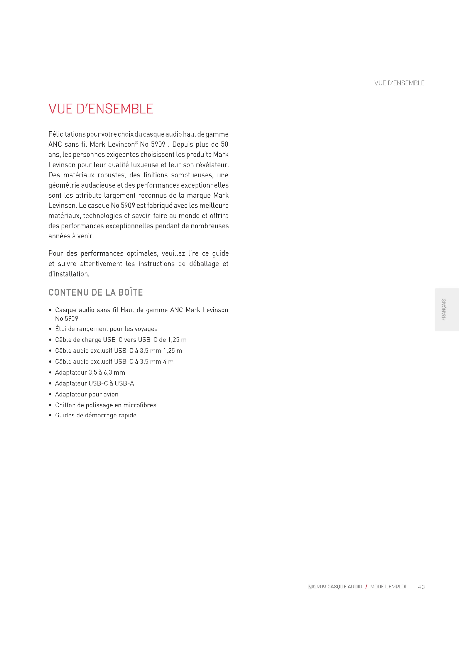 No 5909 . Depuis plus de 50 ans, les personnes exigeantes choisissent les produits Mark Levinson pour leur qualité luxueuse et leur son révélateur. Des matériaux robustes, des finitions somptueuses, une géométrie audacieuse et des performances exceptionnelles sont les attributs largement reconnus de la marque Mark Levinson. Le casque No 5909 est fabriqué avec les meilleurs matériaux, technologies et savoir-faire au monde et offrira des performances exceptionnelles pendant de nombreuses années à venir. Pour des performances optimales, veuillez lire ce guide et suivre attentivement les instructions de déballage et d'installation.