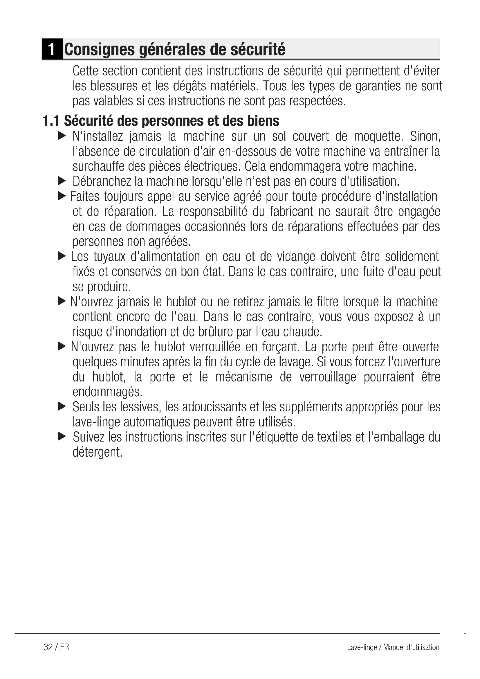 Washing machine32 / FR Lave-linge / Manuel d‘utilisation 1 Consignes générales de sécurité Cette section contient des instructions de sécurité qui permettent d'éviter les blessures et les dégâts matériels. Tous les types de garanties ne sont pas valables si ces instructions ne sont pas respectées.
