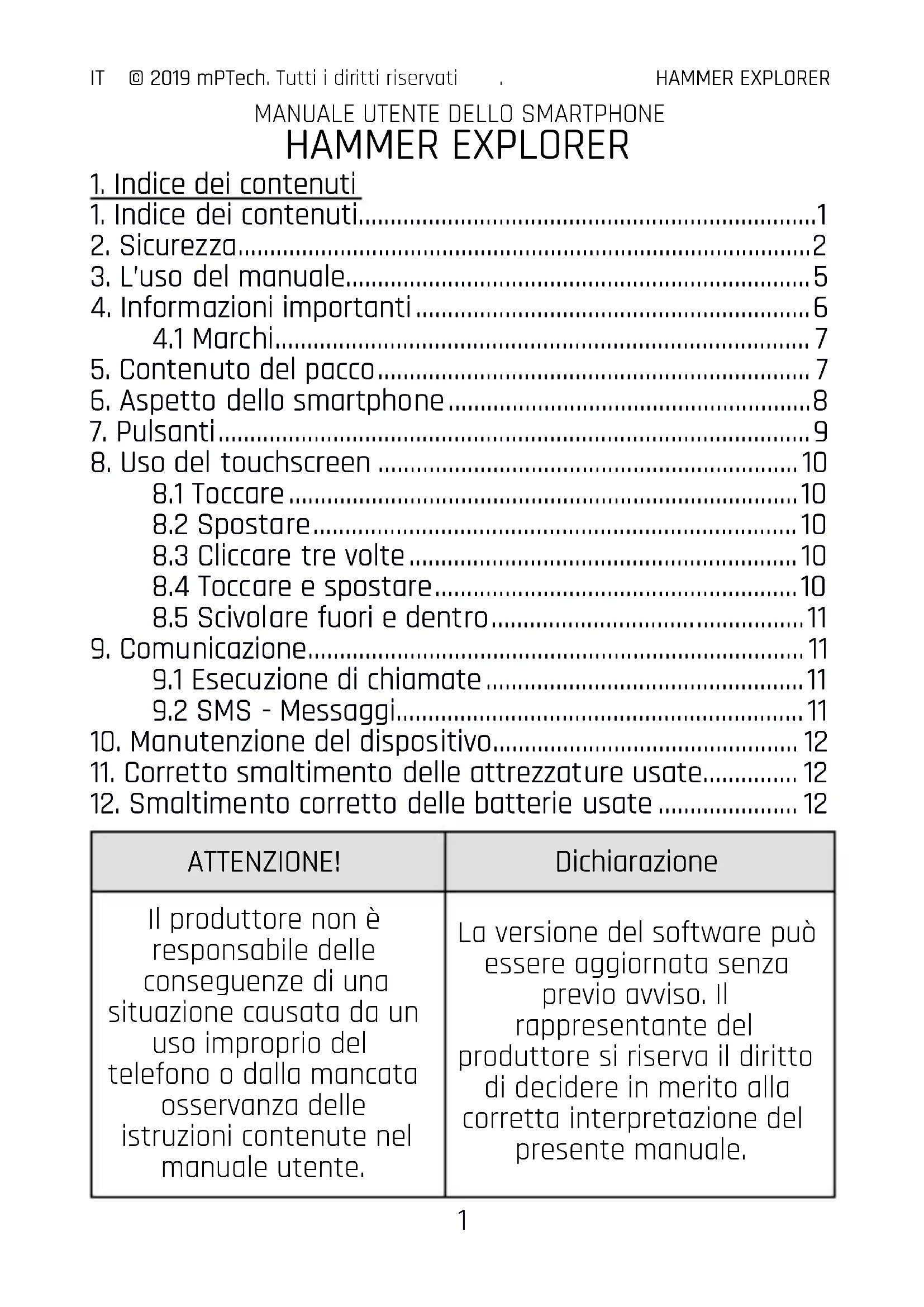 ATTENTION! Déclaration Le fabricant n’est pas responsable des conséquences des situations causées par une mauvaise utilisation de l’appareil ou le non-respect des recommandations ci-dessus. La version du logiciel peut être mise à jour sans préavis. Le représentant du fabricant se réserve le droit de décider de l’interprétation correcte des instructions ci- dessus.FR © 2019 mPTech. Tous droits réservés HAMMER EXPLORER