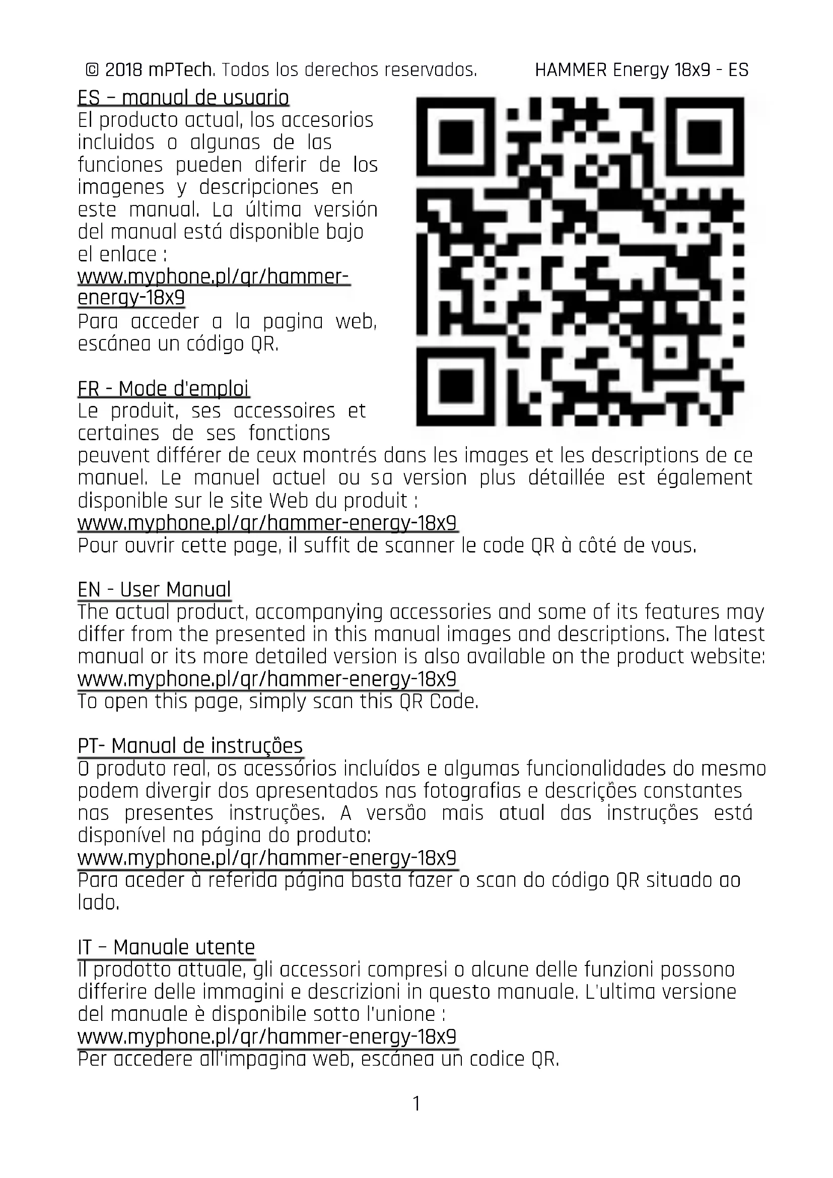 GUIDE DE DÉMARRAGE RAPIDE POUR VOTRE SMARTPHONE HAMMER Energy 18x9 numéro de lot: 201806 Les données du fabricant: mPTech Sp. z o. o. ul. Nowogrodzka 31 00-511 Varsovie Pologne Site Internet: www.myphone-mobile.com Fabriqué en Chine