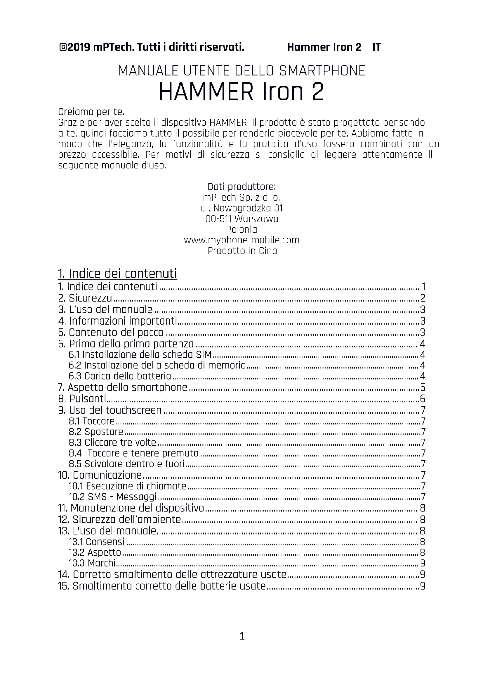 Conformément à la directive 2006/66/CE de l'UE, telle que modifiée par la directive 2013/56/UE sur l'élimination des piles, ce produit est marqué du symbole de la poubelle barrée. Ce symbole indique que les piles ou accumulateurs utilisés dans ce produit ne peuvent pas être jetés avec les déchets ménagers normaux, mais doivent être manipulés conformément à la directive et aux réglementations locales. Il ne faut pas jeter les piles avec les déchets municipaux non triés. Les utilisateurs de piles et d'accumulateurs doivent utiliser un réseau disponible pour la reprise de ces composants, ce qui permet de les restituer, de les recycler et de les éliminer. Au sein de l'UE, la collecte et le recyclage des piles et accumulateurs font l'objet de procédures distinctes. Pour obtenir plus d'informations sur les procédures de recyclage existantes pour les piles et les accumulateurs dans votre région, contactez votre autorité locale, l'autorité de gestion des déchets ou le site d'enfouissement.©2019 mPTech. Tutti i diritti riservati. Hammer Iron 2 IT