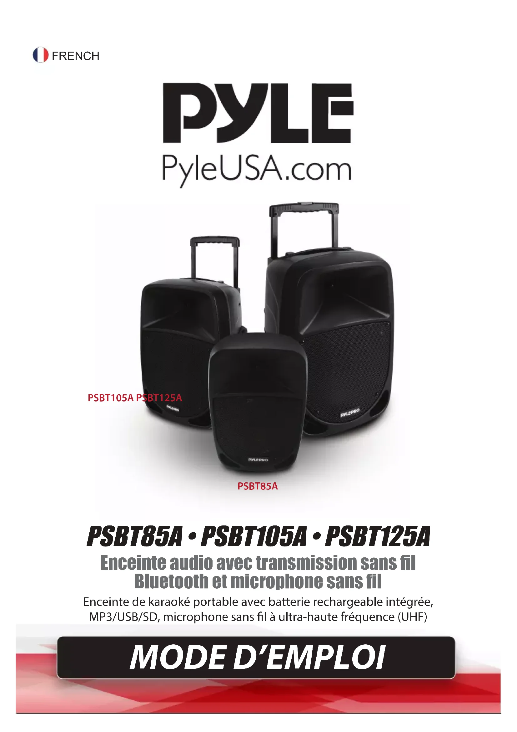 - Utilisé pour le karaoké à domicile et en plein air, les événements publics, les discours devant les foules PSBT85A PSBT105A PSBT125AModèle Pyle PSBT85A Pyle PSBT105A Pyle PSBT125ANom du réseau BT 8" Caissons de basses, 3" Tweeter Caisson de basse de 10 pouces, Tweeter de 3 pouces Caisson de basse de 12 pouces, Tweeter de 3 pouces Système de sonorisation 800 W MAX 1000 W MAX 1200 W MAXPuissance de sortie 10.’’ x 8.1’’ x 15.4’’ pouces 12.4’’ x 10.2’’ x 19.5’’ pouces 15.0’’ x 12.0’’ x 23.0’’ pouces Dimensions de l'enceinte (L x L x H) SPÉCIFICATIONS ET FONCTIONNALITÉSwww.PyleUSA.com 7 Transmission sans l Bluetooth: