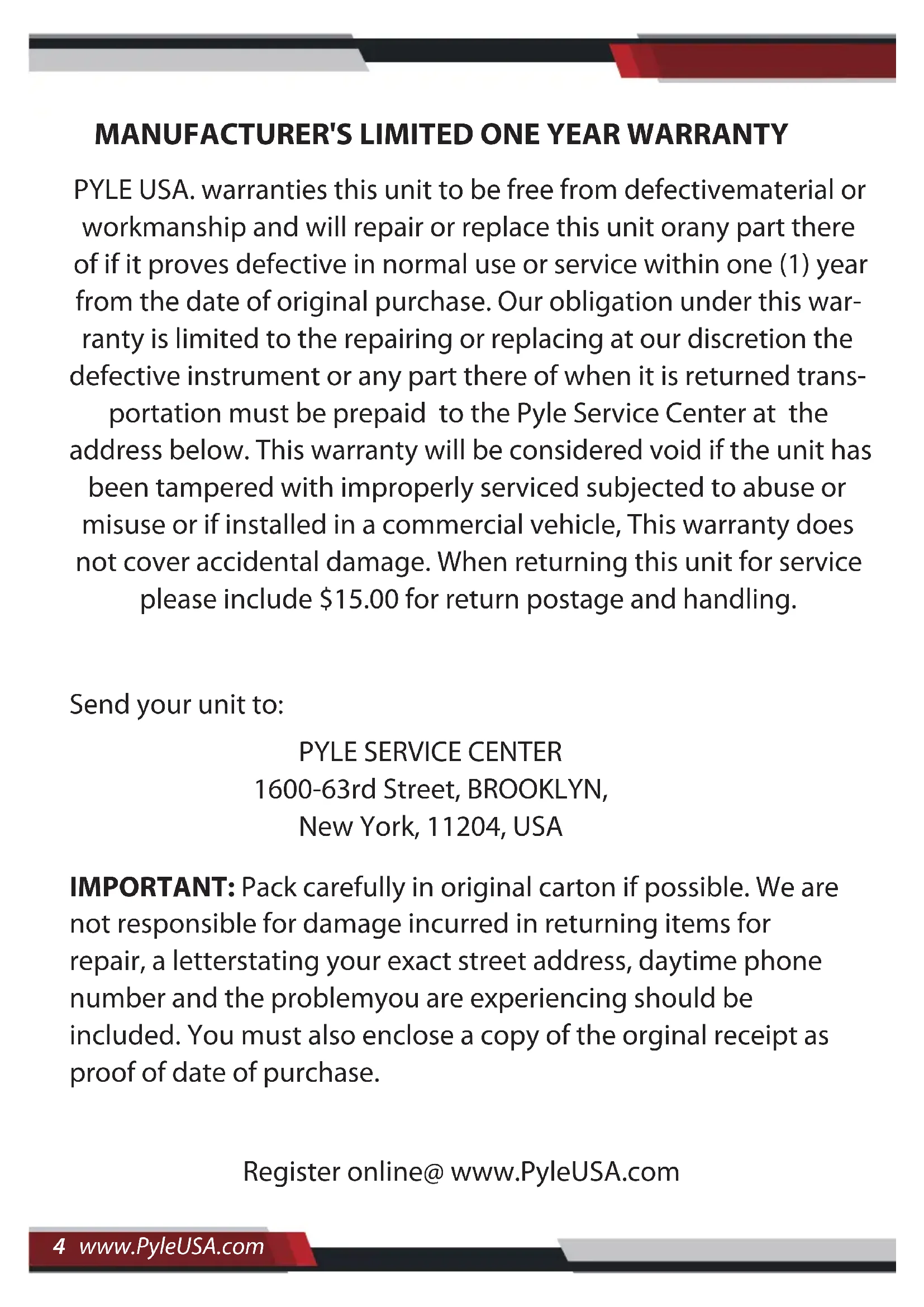 2 in/5 cm 2.5 in/6.3 cm 6.6 x 2.9 in/16.7 x 7.4 cm 8.2 x 3.7 in/20.8 x 9.4 cm 10 x 4.7 in/25.4 x 11.9 cm 12.2 x 5.1 in/30.9 x 12.9 cm15.3 x 6.3 in/38.8 x 16 cmGARANTIE LIMITÉE D'UN AN DU FABRICANT PYLE USA garantit que cet appareil est exempt de tout défaut de matériau ou de fabrication et s’engage à réparer ou à remplacer le produit ou toute partie de celui-ci s'il s'avère défectueux dans le cadre d'une utilisation normale dans un délai de 1 an à compter de la date d'achat initiale. Notre obligation au titre de cette garantie se limite à la réparation ou au remplacement, à notre discrétion, de l'appareil défectueux ou de toute partie de celui-ci lorsqu'il est renvoyé. Le transport devant être prépayé, au centre de service après-vente Pyle à l'adresse indiquée plus bas. Cette garantie sera considérée comme nulle si l'appareil a été modié, mal entretenu, soumis à des abus ou à une mauvaise utilisation ou s'il a été installé dans un véhicule commercial. Cette garantie ne couvre pas les dommages acciden- tels. Lorsque vous renvoyez cet appareil pour un service après-vente, veuillez inclure 15,00 $ pour les frais de port et de manutention. ATTENTION : Veuillez emballer soigneusement le produit dans son carton d'origine si possible. Nous ne sommes pas respons- ables des dommages subis lors du retour des article, une lettre indiquant votre adresse exacte, un numéro de téléphone joign- able dans la journée et une brève description du problème que vous rencontrez doivent être inclus, vous devez également joindre une copie du reçu original comme preuve d'achat. Envoyez votre appareil à: