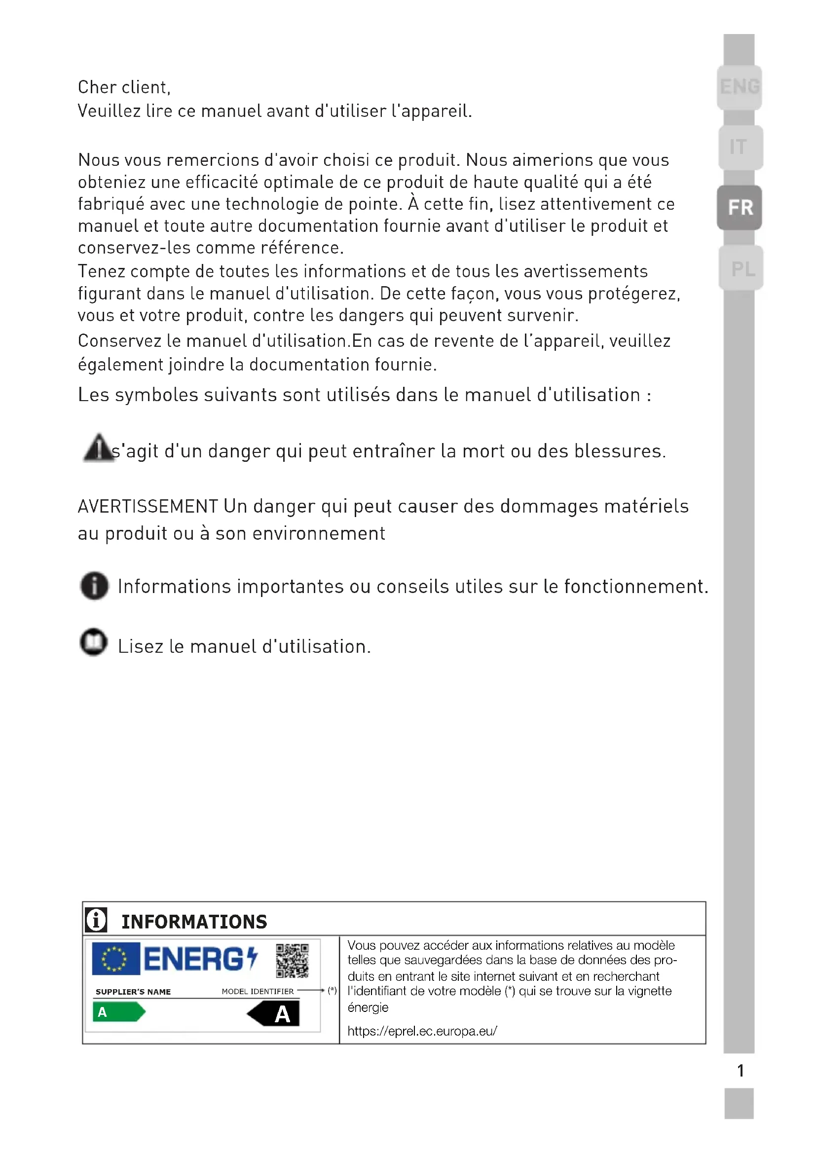 Cher client, Veuillez lire ce manuel avant d'utiliser l'appareil. Nous vous remercions d'avoir choisi ce produit. Nous aimerions que vous obteniez une efficacité optimale de ce produit de haute qualité qui a été fabriqué avec une technologie de pointe. À cette fin, lisez attentivement ce manuel et toute autre documentation fournie avant d'utiliser le produit et conservez-les comme référence. Tenez compte de toutes les informations et de tous les avertissements figurant dans le manuel d'utilisation. De cette façon, vous vous protégerez, vous et votre produit, contre les dangers qui peuvent survenir. Conservez le manuel d'utilisation.En cas de revente de l’appareil, veuillez également joindre la documentation fournie. Les symboles suivants sont utilisés dans le manuel d'utilisation : Il s'agit d'un danger qui peut entraîner la mort ou des blessures. AVERTISSEMENT Un danger qui peut causer des dommages matériels au produit ou à son environnement Informations importantes ou conseils utiles sur le fonctionnement. Lisez le manuel d'utilisation.2