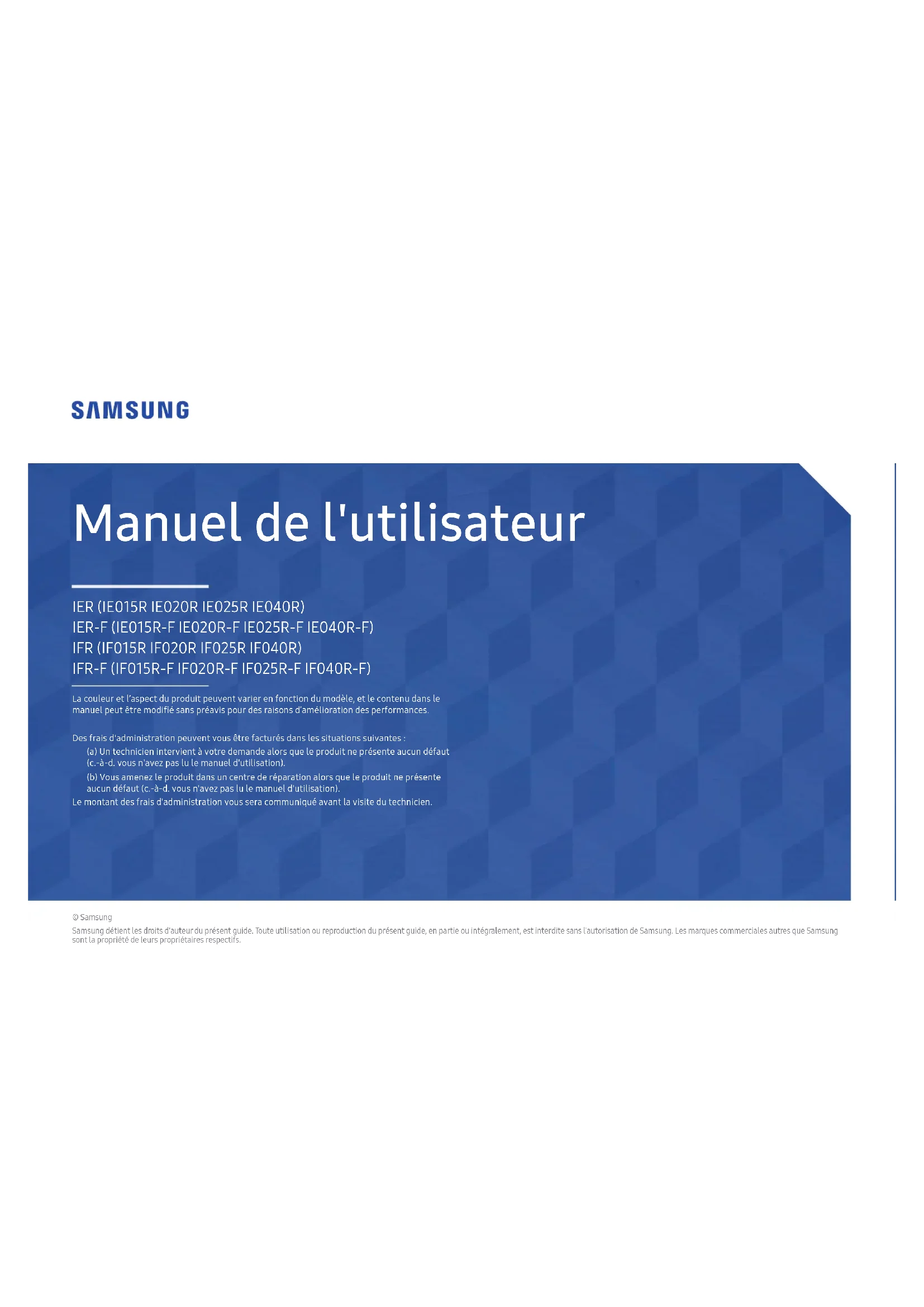 Manuel de l'utilisateur © Samsung Samsung détient les droits d'auteur du présent guide. Toute utilisation ou reproduction du présent guide, en partie ou intégralement, est interdite sans l'autorisation de Samsung. Les marques commerciales autres que Samsung sont la propriété de leurs propriétaires respectifs. IER (IE015R IE020R IE025R IE040R) IER-F (IE015R-F IE020R-F IE025R-F IE040R-F) IFR (IF015R IF020R IF025R IF040R) IFR-F (IF015R-F IF020R-F IF025R-F IF040R-F) La couleur et l’aspect du produit peuvent varier en fonction du modèle, et le contenu dans le manuel peut être modié sans préavis pour des raisons d’amélioration des performances. Des frais d'administration peuvent vous être facturés dans les situations suivantes: (a) Un technicien intervient à votre demande alors que le produit ne présente aucun défaut (c.-à-d. vous n'avez pas lu le manuel d'utilisation). (b) Vous amenez le produit dans un centre de réparation alors que le produit ne présente aucun défaut (c.-à-d. vous n'avez pas lu le manuel d'utilisation). Le montant des frais d'administration vous sera communiqué avant la visite du technicien.Table des matières Avant utilisation du produit Consignes de sécurité 3 Symboles de sécurité 3 Électricité et sécurité 4 Installation 5 Fonctionnement 6 Nettoyage 7 Préparatifs Ports 8 IER IFR 8 IER-F IFR-F 9 Connexion des appareils Précautions lors de la manipulation des boîtiers 10 Installation des boîtiers 11 Retirer les protections 11 Connexions à des boîtiers 12 Résolution prise en charge par installation 13 Connexion du câble d’alimentation 14 Connexion EN CHAÎNE maximale 14