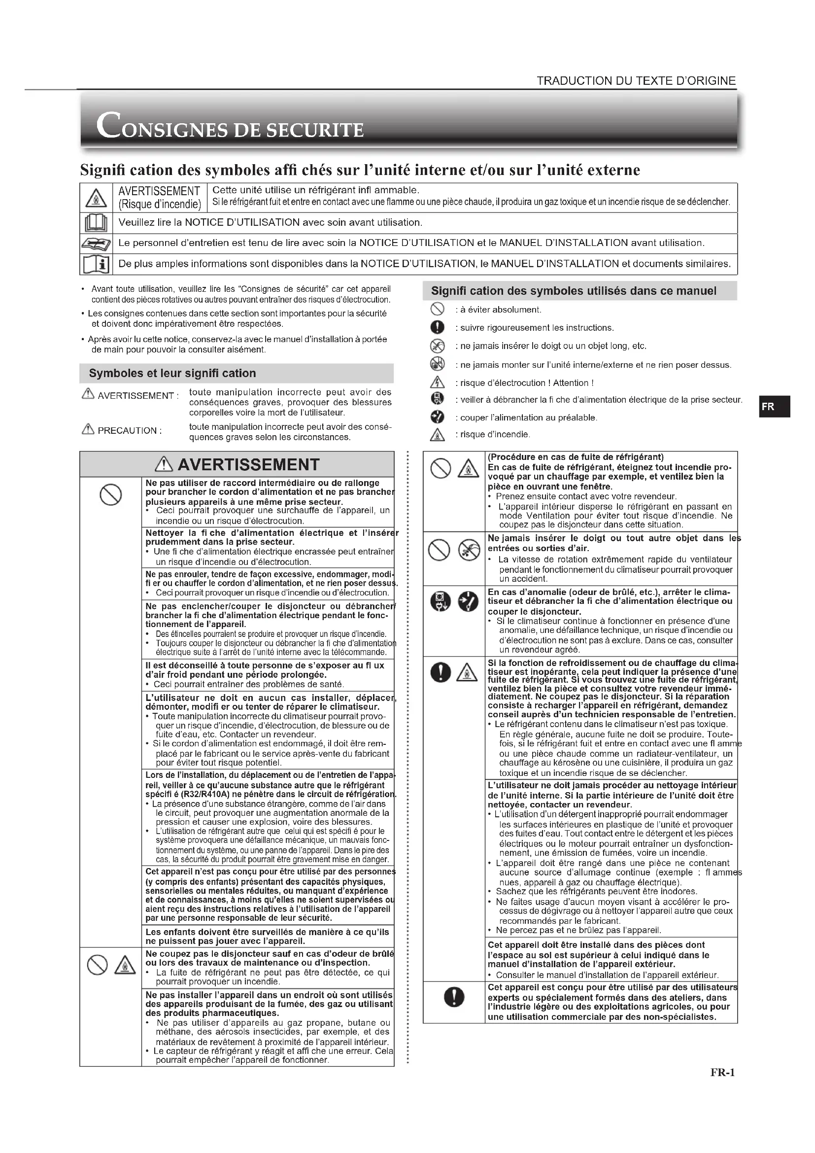 | A | AVERTISSEMENT (Risque d'incendie) | Cette unité utilise un réfrigerant infil ammable. Si le réfrigerant fuit et entre en contact avec une flamme ou une piece chaude, il produit un gaz toxique et un incendie risque de se déclenger. |