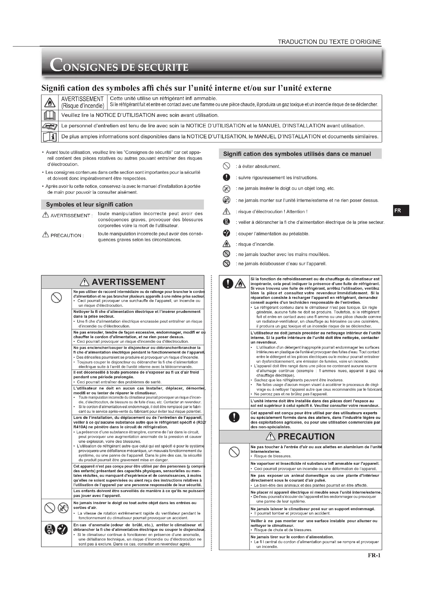 - Avant toute utilisation, veuillez lire les “Consignes de sécurité” car cet appa-reil contient des pièces rotatives ou autres pouvant entraîner des risques d’électrocution.• Les consignes contenues dans cette section sont importantes pour la sécurité et doivent donc impérativement être respectées.• Après avoir lu cette notice, conservez-la avec le manuel d’installation à portée de main pour pouvoir la consulter aisément. Symboles et leur signifi cation AVERTISSEMENT :toute manipulation incorrecte peut avoir des conséquences graves, provoquer des blessures corporelles voire la mort de l’utilisateur. PRECAUTION :toute manipulation incorrecte peut avoir des consé-quences graves selon les circonstances. Signifi cation des symboles utilisés dans ce manuel : à éviter absolument. : suivre rigoureusement les instructions. : ne jamais insérer le doigt ou un objet long, etc. : ne jamais monter sur l’unité interne/externe et ne rien poser dessus. : risque d’électrocution ! Attention ! veiller à débrancher la fi che d’alimentation électrique de la prise secteur. : couper l’alimentation au préalable. : risque d’incendie. : ne jamais toucher avec les mains mouillées. : ne jamais éclabousser d’eau sur l’appareil. Signifi cation des symboles affi chés sur l’unité interne et/ou sur l’unité externe AVERTISSEMENT (Risque d’incendie) Cette unité utilise un réfrigérant infl ammable. Si le réfrigérant fuit et entre en contact avec une fl amme ou une pièce chaude, il produira un gaz toxique et un incendie risque de se déclencher. Veuillez lire la NOTICE D’UTILISATION avec soin avant utilisation. Le personnel d’entretien est tenu de lire avec soin la NOTICE D’UTILISATION et le MANUEL D’INSTALLATION avant utilisation. De plus amples informations sont disponibles dans la NOTICE D’UTILISATION, le MANUEL D’INSTALLATION et documents similaires. AVERTISSEMENT Ne pas utiliser de raccord intermédiaire ou de rallonge pour brancher le cordon d’alimentation et ne pas brancher plusieurs appareils à une même prise secteur.• Ceci pourrait provoquer une surchauffe de l’appareil, un incendie ou un risque d’électrocution.Nettoyer la fi che d’alimentation électrique et l’insérer prudemment dans la prise secteur.• Une fi che d’alimentation électrique encrassée peut entraîner un risque d’incendie ou d’électrocution.Ne pas enrouler, tendre de façon excessive, endommager, modifi er ou chauffer le cordon d’alimentation, et ne rien poser dessus.• Ceci pourrait provoquer un risque d’incendie ou d’électrocution.Ne pas enclencher/couper le disjoncteur ou débrancher/brancher la fi che d’alimentation électrique pendant le fonctionnement de l’appareil.• Des étincelles pourraient se produire et provoquer un risque d’incendie.• Toujours couper le disjoncteur ou débrancher la fi che d’alimentation électrique suite à l’arrêt de l’unité interne avec la télécommande. Il est déconseillé à toute personne de s’exposer au fl ux d’air froid pendant une période prolongée.• Ceci pourrait entraîner des problèmes de santé.L’utilisateur ne doit en aucun cas installer, déplacer, démonter, modifi er ou tenter de réparer le climatiseur. Toute manipulation incorrecte du climatiseur pourrait provoquer un risque d’incen-die, d’électrocution, de blessure ou de fuite d’eau, etc. Contacter un revendeur. Si le cordon d’alimentation est endommagé, il doit être remplacé par le fabri-cant ou le service après-vente du fabricant pour éviter tout risque potentiel.Lors de l’installation, du déplacement ou de l’entretien de l’appareil, veiller à ce qu’aucune substance autre que le réfrigérant spécifi é (R32/R410A) ne pénètre dans le circuit de réfrigération.• La présence d’une substance étrangère, comme de l’air dans le circuit, peut provoquer une augmentation anormale de la pression et causer une explosion, voire des blessures. • L’utilisation de réfrigérant autre que celui qui est spécifi é pour le système provoquera une défaillance mécanique, un mauvais fonctionnement du système, ou une panne de l’appareil. Dans le pire des cas, la sécurité du produit pourrait être gravement mise en danger.Cet appareil n’est pas conçu pour être utilisé par des personnes (y compris des enfants) présentant des capacités physiques, sensorielles ou men-tales réduites, ou manquant d’expérience et de connaissances, à moins qu’elles ne soient supervisées ou aient reçu des instructions relatives à l’utilisation de l’appareil par une personne responsable de leur sécurité.Les enfants doivent être surveillés de manière à ce qu’ils ne puissent pas jouer avec l’appareil. Ne jamais insérer le doigt ou tout autre objet dans les entrées ou sorties d’air.• La vitesse de rotation extrêmement rapide du ventilateur pendant le fonctionnement du climatiseur pourrait provoquer un accident. En cas d’anomalie (odeur de brûlé, etc.), arrêter le climatiseur et débrancher la fi che d’alimentation électrique ou couper le disjoncteur.• Si le climatiseur continue à fonctionner en présence d’une anomalie, une défaillance technique, un risque d’incendie ou d’électrocution ne sont pas à exclure. Dans ce cas, consulter un revendeur agréé. Si la fonction de refroidissement ou de chauffage du climatiseur est inopérante, cela peut indiquer la présence d’une fuite de réfrigérant. Si vous trouvez une fuite de réfrigérant, arrêtez l’utilisation, ventilez bien la pièce et consultez votre revendeur immédiatement. Si la réparation consiste à recharger l’appareil en réfrigérant, demandez conseil auprès d’un technicien responsable de l’entretien.• Le réfrigérant contenu dans le climatiseur n’est pas toxique. En règle générale, aucune fuite ne doit se produire. Toutefois, si le réfrigérant fuit et entre en contact 