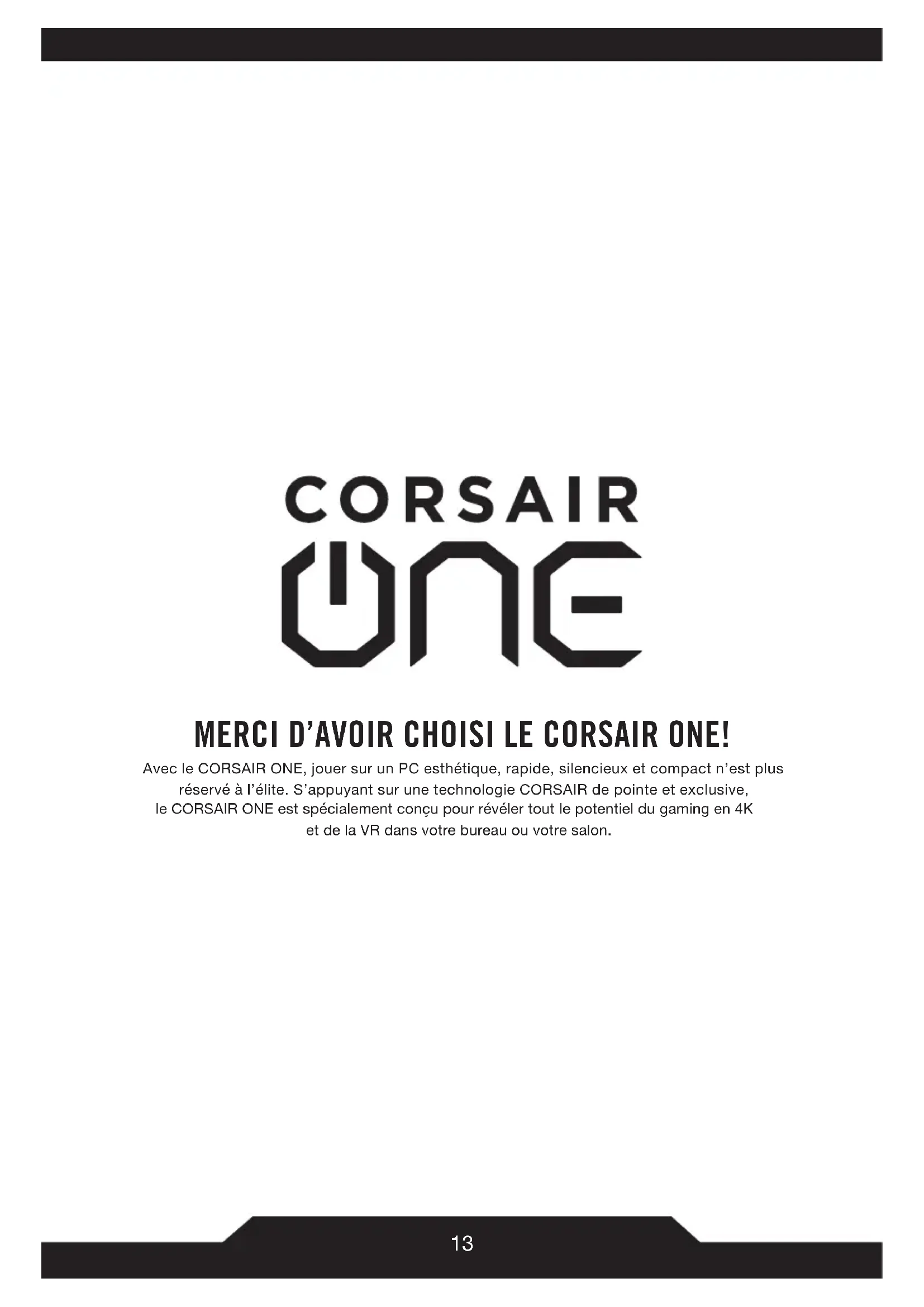 MERCI D’AVOIR CHOISI LE CORSAIR ONE! Avec le CORSAIR ONE, jouer sur un PC esthétique, rapide, silencieux et compact n’est plus réservé à l’élite. S’appuyant sur une technologie CORSAIR de pointe et exclusive, le CORSAIR ONE est spécialement conçu pour révéler tout le potentiel du gaming en 4K et de la VR dans votre bureau ou votre salon.14