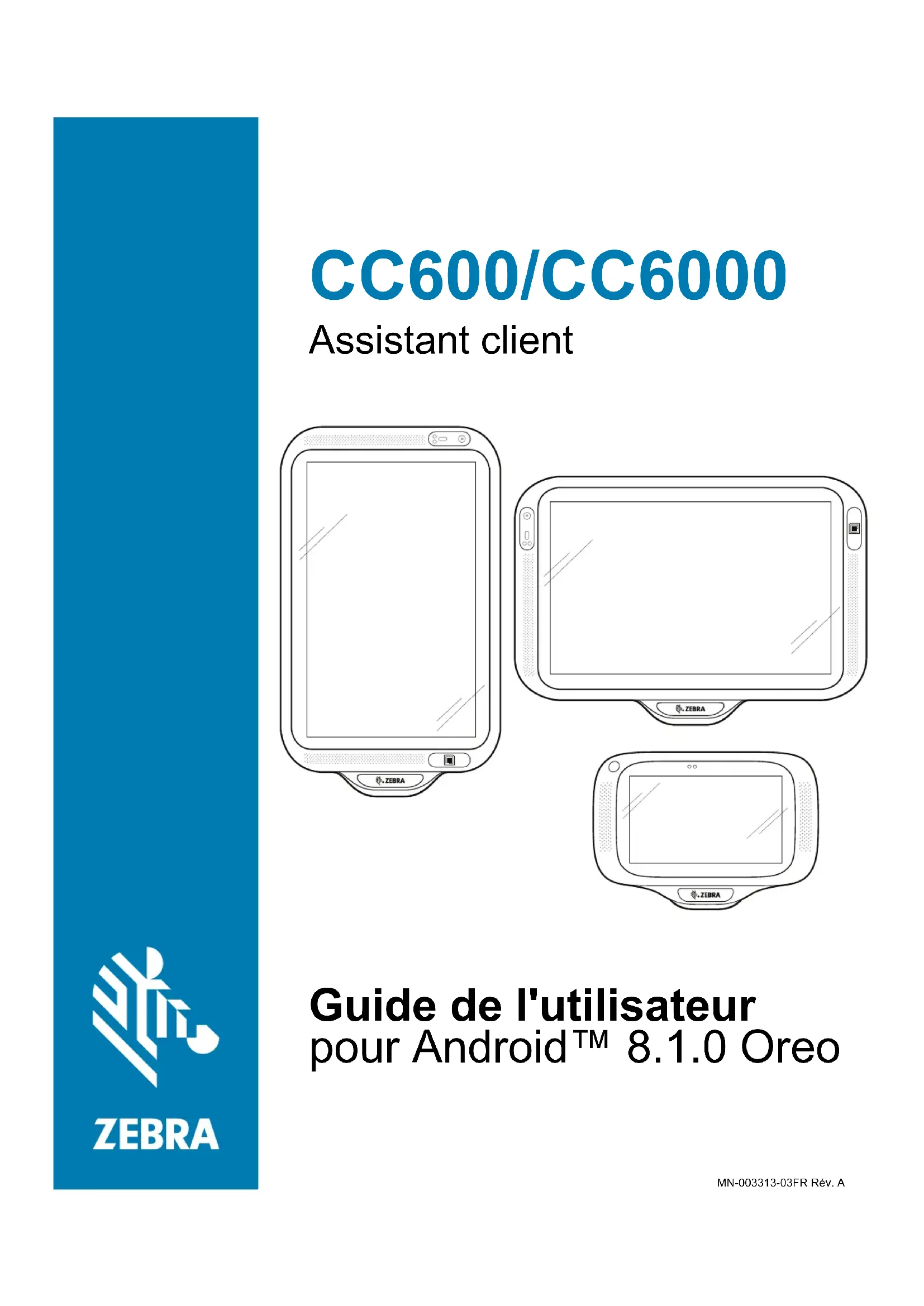 Assistant client CC600/CC6000 MN-003313-03FR Rév. A Guide de l'utilisateur pour Android™ 8.1.0 Oreo2 Copyright ZEBRA et l'illustration de la tête de zèbre sont des marques commerciales de Zebra Technologies Corporation, déposées dans de nombreuses juridictions dans le monde entier. Toutes les autres marques commerciales appartiennent à leurs propriétaires respectifs. ©2019-2021 Zebra Technologies Corporation et/ou ses filiales. Tous droits réservés. Google™, Android, Google Play™ et les autres marques sont des marques commerciales de Google LLC ; Oreo est une marque commerciale du groupe Mondelez International, Inc. Toutes les autres marques commerciales appartiennent à leurs propriétaires respectifs. DROITS D'AUTEUR ET MARQUES COMMERCIALES : pour des informations complètes sur le copyright et les marques commerciales, rendez-vous à l'adresse : www.zebra.com/copyright