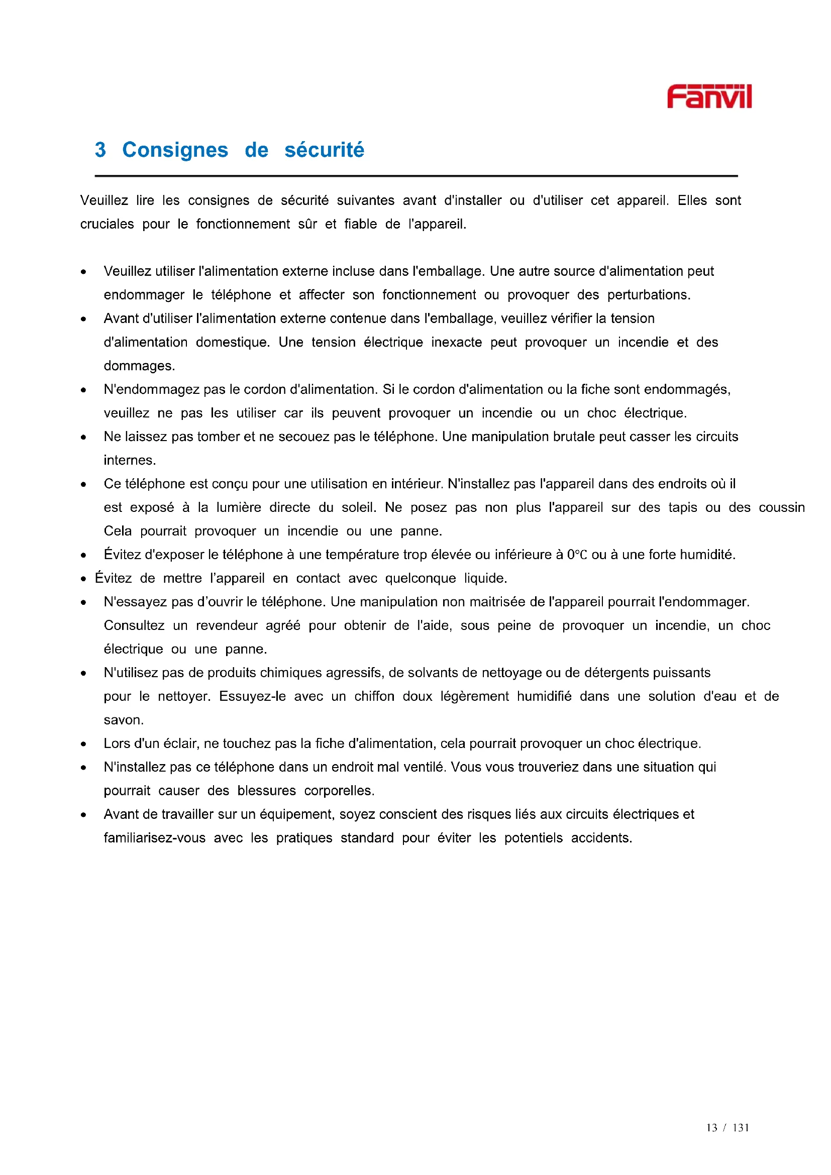 13 Résolution de problèmes Lorsque le téléphone n'est pas utilisé normalement, l'utilisateur peut essayer les méthodes suivantes pour rétablir le fonctionnement normal du téléphone ou collecter les informations pertinentes et envoyer un rapport de problème à la boîte aux lettres du support technique de Fanvil.