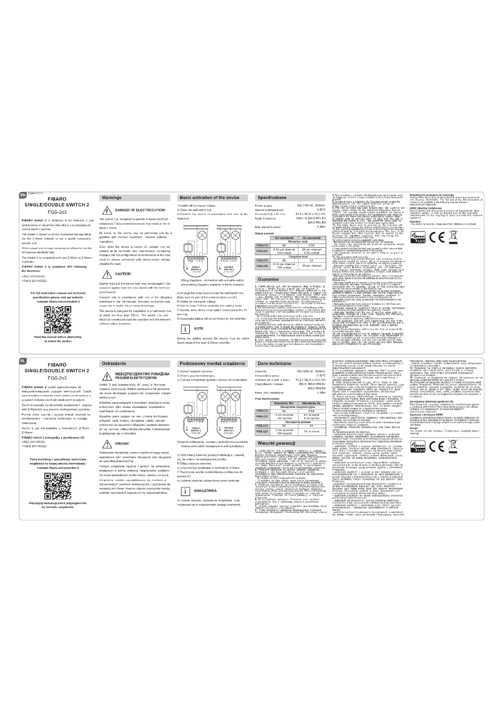 sur le territoire polonais seront couverts par le Fabricant. Dans le cas du transport d'autres pays, les frais de transport seront à la charge du Client. Dans le cas d'une notification de la demande de réclamation injustifiée, le SGA a le droit de charger le Client des frais concernant l'explication de la question.12. SGA refuse d'accepter une réclamation en cas de : - constatation de l’utilisation abusive et non conforme au mode d’emploi de l’Appareil,- mettre à disposition l’Appareil incomplet, sans accessoires, sans plaque signalétique de la part du Client, - déterminer la cause du défaut autre que le vice de matériau ou de production de l’Appareil, - du document de garantie non valable et l'absence de preuve d'achat.13. La garantie de qualité ne couvre pas :- des dommages mécaniques (fissures, fractures, coupures, écorchures, déformation physique due à l'impact, la chute ou causée en laissant tomber sur l'Appareil un autre objet ou par l’utilisation abusive de l’Appareil par rapport de celle prévue dans le mode d’emploi); - des dommages causés par des causes externes telles que: inondation, tempête, feu, foudre, catastrophes naturelles, tremblements de terre, guerre, troubles civils, cas de force majeure, accidents imprévus, vol, versement de liquide, fuite de la batterie, conditions météorologiques; lumière du soleil, sable, humidité, température élevée ou faible, pollution de l'air;- des dommages causés par un logiciel défectueux en raison d'une attaque de virus ou de ne pas mettre à jour du logiciel, l’opération recommandée par le fabricant; - des dommages résultant de : surtensions dans le réseau électrique et/ou de télécommunication ou de se connecter au réseau énergétique d'une manière incompatible avec les instructions ou à cause de la connexion d'autres produits dont la connexion n’est pas recommandée par le fabricant; - des dommages causés par le fonctionnement ou le stockage dans des conditions extrêmement défavorables, soit humidité élevée, poussière, température ambiante trop basse (gel) ou trop haute. Les conditions détaillées dans lesquelles il est possible d'utiliser l'appareil détermine le mode d’emploi ;- les dommages causés par l'utilisation d'accessoires non recommandés par le Fabricant; - des dommages causés par réseau électrique défectueux de l’utilisateur, y compris l'utilisation de fusibles incorrects ;- des dommages causés par négligence de maintenance et d'entretien prévus dans le mode d’emploi de la part du Client ; Garantiebedingungen Conditions de la garantie 6.5A je Kanal10A Gesamtstrom6A je Kanal9.5A Gesamtstrom8A 6.5AFGS-223FGS-213FGS-223FGS-213Widerstand-LastGlühlampen-Last6.5A je Kanal10A Gesamtstrom3A je Kanal8A 5AUL normenIEC normenNennlaststrom:6,5A per canal10A total6A per canal9,5A total8A 6,5AFGS-223FGS-213FGS-223FGS-213Charge résistiveCharge incandescente6,5A per canal10A total3A per canal8A 5ANormes ULNormes IECCourant de charge:S-v2.5Vereinfachte EU-konformitätserklärung:Hiermit erklärt Fibar Group S.A., dass sich das Gerät Radiolan in Übereinstimmung mit den grundlegenden Anforderungen und den übrigen einschlägigen Bestimmungen der Richtlinie 2014/53/EU befindet. Der vollständige Text der EU-Konformitätserklärung ist unter der folgenden Internetadresse verfügbar: www.manuals.fibaro.comWEEE-Richtlinie: Das mit diesem Symbol gekennzeichnete Gerät darf nicht mit anderen Haushaltsabfällen entsorgt werden. Das Gerät muss stattdessen bei einer Recyclingstelle für Elektro- und Elektronik-Alt-geräte abgegeben werden.Achtung! Der Artikel ist kein Spielzeug. Halten Sie Kinder und Tiere fern!Declaration UE de conformite simplifiee: Par la présente Fibar Group S.A. déclare que cet appareil est conforme aux exigences essentielles et aux autres dispositions pertinentes de la directive 2014/53/EU. Le texte complet de la déclaration UE de conformité est disponible à l'adresse internet suivante: www.manuals.fibaro.comConformité à la directive DEEE:Le dispositif étiqueté avec ce symbole ne doit pas être éliminé avec d'autres déchets ménagers. Il doit être remis au point de collecte applicable pour le recyclage des déchets d'équipements électriques et électroniques.Attention! L’article n’est pas un jouet. Tenez les enfants et les animaux éloignés!PT EspecificaçõesAtivação básica do dispositivo PERIGO DE ELECTROCUSSÃO! PERIGO!A carga aplicada e o próprio dispositivo pode ser danificados se o tipo e valores da carga aplicada sejam inconsistentes com as especificações técnicas!Ligue apenas de acordo com um dos diagramas apresentados no manual. Ligações incorretas podem causar riscos à saúde, vida ou danificar os materiais.O dispositivo está desenhado para instalação em caixas de aparelhagem com profundidade não inferior a 60mm. A caixa e os conectores devem cumprir com os standards nacionais de segurança.O Switch 2 foi desenhado para operar em instalações eléctricas domésticas. Ligações incorretas podem resultar em fogo ou choque elétrico.Todos os trabalhos no aparelho devem ser executadas por um eletricista qualificado e licenciado. Observe os regulamentos nacionais.Mesmo quando o dispositivo esteja desligado, pode estar presente tensão nos seus terminais. Qualquer manutenção introduzindo alterações na configuração de ligações ou da carga deve ser sempre realizadas com a tensão desligada (desativar o fusível/disjuntor). Avisos