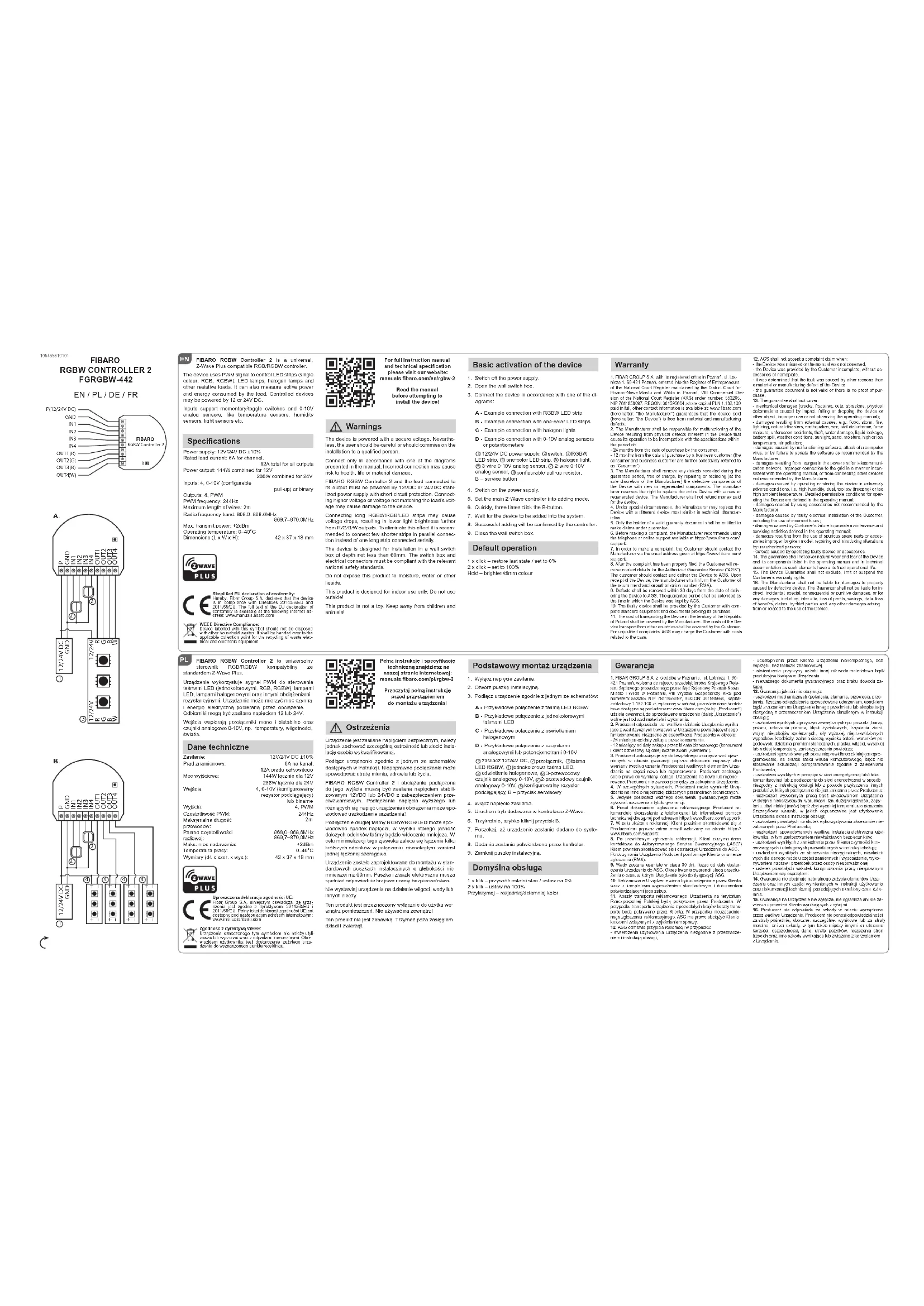tion sur le territoire polonais seront couverts par le Fabricant. Dans le cas du transport d’autres pays, les frais de transport seront à la charge du Client. Dans le cas d’une notication de la demande de réclamation injustiée, le SGA a le droit de charger le Client des frais concernant l’explication de la question.12. SGA refuse d’accepter une réclamation en cas de : - constatation de l’utilisation abusive et non conforme au mode d’em-ploi de l’Appareil,- mettre à disposition l’Appareil incomplet, sans accessoires, sans plaque signalétique de la part du Client, - déterminer la cause du défaut autre que le vice de matériau ou de production de l’Appareil, - du document de garantie non valable et l’absence de preuve d’achat.13. La garantie de qualité ne couvre pas :- des dommages mécaniques (ssures, fractures, coupures, écor-chures, déformation physique due à l’impact, la chute ou causée en laissant tomber sur l’Appareil un autre objet ou par l’utilisation abusive de l’Appareil par rapport de celle prévue dans le mode d’emploi);- des dommages causés par des causes externes telles que: inon-dation, tempête, feu, foudre, catastrophes naturelles, tremblements de terre, guerre, troubles civils, cas de force majeure, accidents im-prévus, vol, versement de liquide, fuite de la batterie, conditions mé-téorologiques; lumière du soleil, sable, humidité, température élevée ou faible, pollution de l’air;- des dommages causés par un logiciel défectueux en raison d’une attaque de virus ou de ne pas mettre à jour du logiciel, l’opération recommandée par le fabricant;- des dommages résultant de : surtensions dans le réseau électrique et/ou de télécommunication ou de se connecter au réseau énergé-tique d’une manière incompatible avec les instructions ou à cause de la connexion d’autres produits dont la connexion n’est pas recom-mandée par le fabricant;- des dommages causés par le fonctionnement ou le stockage dans des conditions extrêmement défavorables, soit humidité élevée, poussière, température ambiante trop basse (gel) ou trop haute. Les conditions détaillées dans lesquelles il est possible d’utiliser l’appa-reil détermine le mode d’emploi ;- les dommages causés par l’utilisation d’accessoires non recom-mandés par le Fabricant;- des dommages causés par réseau électrique défectueux de l’utili-sateur, y compris l’utilisation de fusibles incorrects ;- des dommages causés par négligence de maintenance et d’entre-tien prévus dans le mode d’emploi de la part du Client ;- des dommages résultant de l’utilisation des pièces de rechange et des accessoires non originaux, incorrects pour le présent modèle, d’eectuer des réparations et des modications par des personnes non autorisées ;- les défauts causés par la poursuite des travaux avec un Appareil ou un équipement défectueux.14. La garantie ne couvre pas l’usure normale des composants de l’Appareil et d’autres dispositifs mentionnés dans le manuel d’utili-sateur et la documentation technique avec un temps spécique de fonctionnement.15. La garantie de l’Appareil n’exclut pas, ne limite ni suspend les droits du Client découlant de la garantie légale.16. Le Fabricant décline toute responsabilité en cas de dommages matériels causés par un Appareil défectueux. Le Fabricant n’est pas responsable des dommages indirects, accessoires, spéciaux, consécutifs ou le préjudice moral ni des dommages, y compris mais sans s’y limiter les pertes de prots, d’économies, de données, la perte des prestations, des sinistres par des tiers et d’autres dom-mages découlant de ou liés à l’utilisation de l’Appareil. FIBARO RGBW Controller 2 ist ein universeller, mit Z-Wave Plus-Standard kompatibles, RGB/ RGBW Kontroller. Das Gerät verwendet PWM-Signal zur Steuerung von LED-Streifen (einfarbig, RGB, RGBW), LED-Lampen, Halogenlampen und anderen ohmschen Lasten. Es kann auch die Leistung und die von den angeschlossenen Geräten verbrauchte Energie messen. Die von dem Kontroller gesteuerten Geräte können mit 12V oder 24V Gleichstrom (DC) versorgt werden. Die Eingänge unterstützen Moment- und Kippschalter als auch analoge 0 bis 10V-Sensoren wie Temperatursensoren, Feuchtigkeitssensoren, Lichtsensoren usw. Technische Daten Stromversorgung: 12V/24V DC ±10% Nennlaststrom: 6A für einzelnen Kanal, 12A gesamt für alle Ausgänge Ausgangsleistung: 144W gesamt für 12V 288W gesamt für 24V Eingänge: 4 mal 0 bis 10V (kongurier- bares Pull-Up) oder binärer Ausgänge: 4, PWM PWM Frequenz: 244Hz Maximale Kabellänge: 2m Funk-Frequenzband: 868.0–868.6MHz 869.7–870.0MHz Sendeleistung: +2dBm Betriebstemperatur: 0–40°C Größe (L x B x H): 42 x 37 x 18 mm