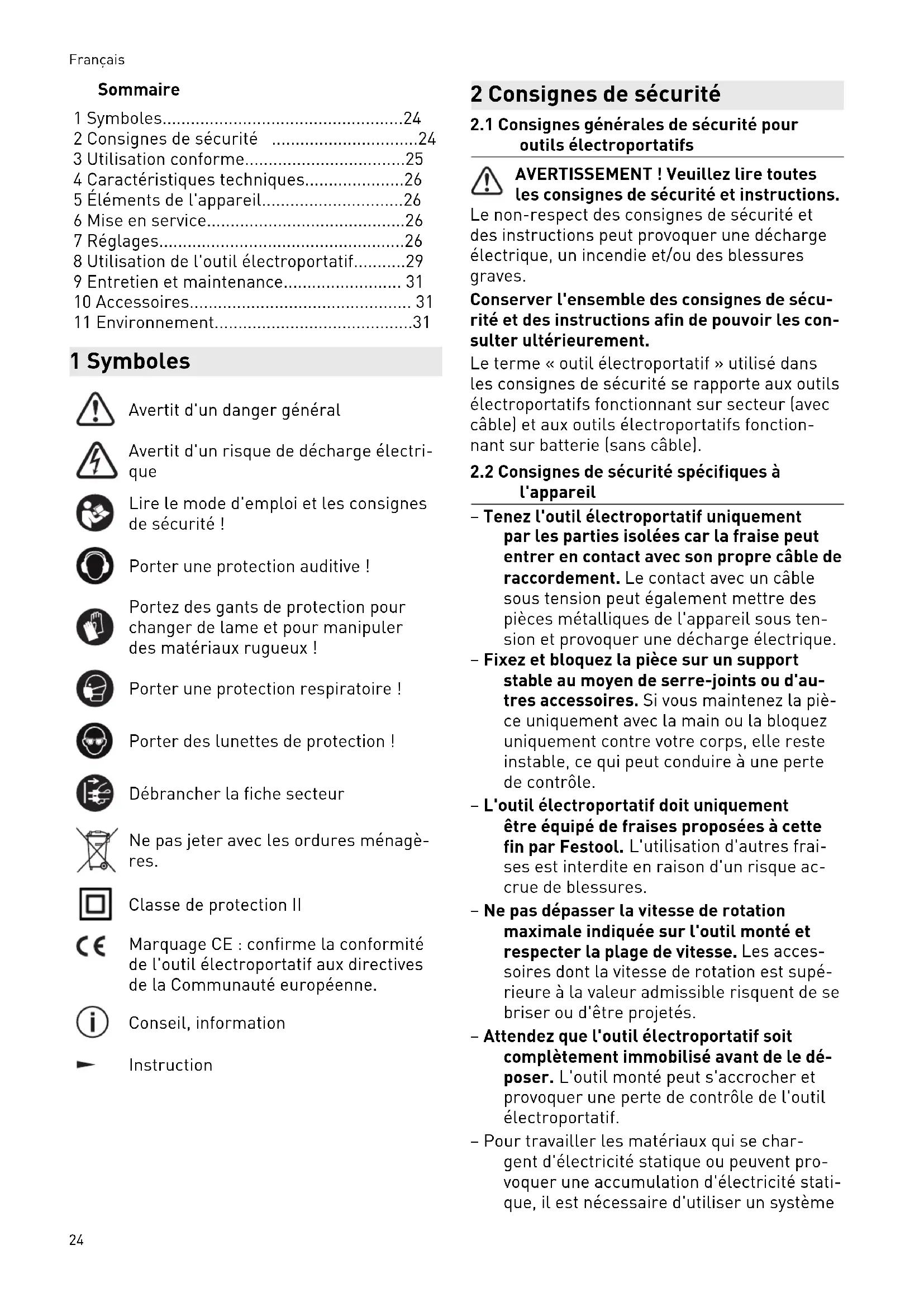 l'appareil – Tenez l'outil électroportatif uniquement par les parties isolées car la fraise peut entrer en contact avec son propre câble de raccordement. Le contact avec un câble sous tension peut également mettre des pièces métalliques de l'appareil sous ten sion et provoquer une décharge électrique. – Fixez et bloquez la pièce sur un support stable au moyen de serre-joints ou d'au tres accessoires. Si vous maintenez la piè ce uniquement avec la main ou la bloquez uniquement contre votre corps, elle reste instable, ce qui peut conduire à une perte de contrôle. – L'outil électroportatif doit uniquement être équipé de fraises proposées à cette fin par Festool. L'utilisation d'autres frai ses est interdite en raison d'un risque ac crue de blessures. – Ne pas dépasser la vitesse de rotation maximale indiquée sur l'outil monté et respecter la plage de vitesse. Les acces soires dont la vitesse de rotation est supé rieure à la valeur admissible risquent de se briser ou d'être projetés. – Attendez que l'outil électroportatif soit complètement immobilisé avant de le dé poser. L'outil monté peut s'accrocher et provoquer une perte de contrôle de l'outil électroportatif. – Pour travailler les matériaux qui se char gent d'électricité statique ou peuvent pro voquer une accumulation d'électricité stati que, il est nécessaire d'utiliser un système Français 24global limitant la formation d'électricité statique. Celui-ci se compose d'un tuyau d'aspiration antistatique (AS) et d'un aspi rateur. – Pour le serrage des outils, utiliser unique ment le diamètre de tige pour lequel la pin ce de serrage est conçue. – Employez exclusivement des outils confor mes à EN 847-1. Toutes les fraises de Fes tool remplissent les exigences de ce stan dard. – Veiller à bien fixer la fraise et s'assurer qu'elle fonctionne parfaitement. – La pince de serrage et l'écrou-raccord ne doivent présenter aucun dommage. – L'utilisation de fraises fissurées ou défor mées est interdite.