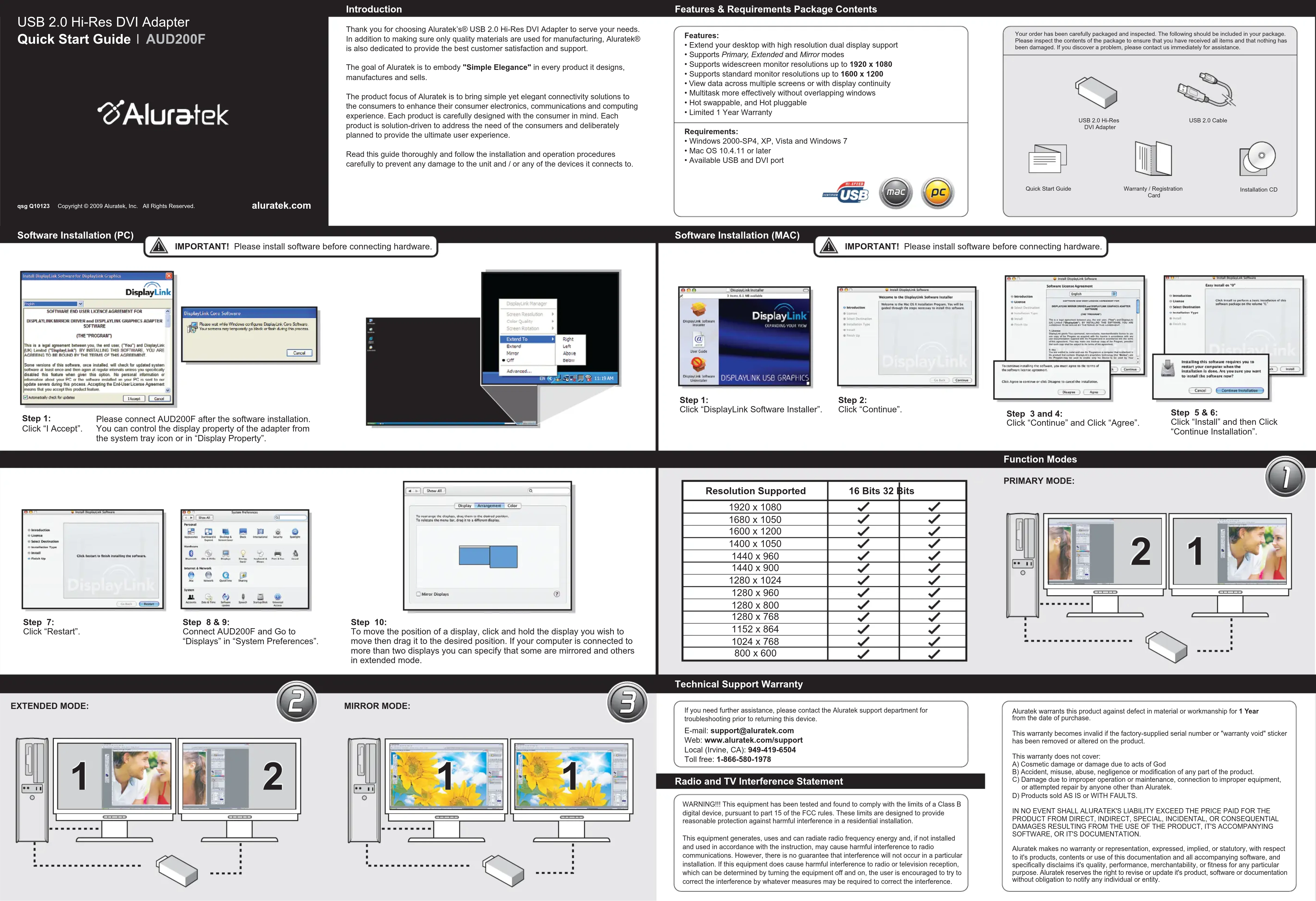 - Supports widescreen monitor resolutions up to 1920 x 1080• Supports standard monitor resolutions up to 1600 x 1200• View data across multiple screens or with display continuity• Multitask more effectively without overlapping windows• Hot swappable, and Hot pluggable• Limited 1 Year WarrantyRequirements:• Windows 2000-SP4, XP, Vista and Windows 7• Mac OS 10.4.11 or later• Available USB and DVI port Features & Requirements Package Contents Function Modes Installation CD Radio and TV Interference Statement Technical Support Warranty Software Installation (PC) Introduction USB 2.0 Hi-Res DVI Adapter Your order has been carefully packaged and inspected. The following should be included in your package. Please inspect the contents of the package to ensure that you have received all items and that nothing has been damaged. If you discover a problem, please contact us immediately for assistance.Quick Start GuideWarranty / Registration Card WARNING!!! This equipment has been tested and found to comply with the limits of a Class B digital device, pursuant to part 15 of the FCC rules. These limits are designed to provide reasonable protection against harmful interference in a residential installation.This equipment generates, uses and can radiate radio frequency energy and, if not installed and used in accordance with the instruction, may cause harmful interference to radio communications. However, there is no guarantee that interference will not occur in a particular installation. If this equipment does cause harmful interference to radio or television reception, which can be determined by turning the equipment off and on, the user is encouraged to try to correct the interference by whatever measures may be required to correct the interference. Aluratek warrants this product against defect in material or workmanship for 1 Year from the date of purchase.This warranty becomes invalid if the factory-supplied serial number or "warranty void" sticker has been removed or altered on the product. This warranty does not cover:A) Cosmetic damage or damage due to acts of GodB) Accident, misuse, abuse, negligence or modification of any part of the product. C) Damage due to improper operation or maintenance, connection to improper equipment, or attempted repair by anyone other than Aluratek. D) Products sold AS IS or WITH FAULTS.IN NO EVENT SHALL ALURATEK'S LIABILITY EXCEED THE PRICE PAID FOR THE PRODUCT FROM DIRECT, INDIRECT, SPECIAL, INCIDENTAL, OR CONSEQUENTIAL DAMAGES RESULTING FROM THE USE OF THE PRODUCT, IT'S ACCOMPANYING SOFTWARE, OR IT'S DOCUMENTATION.Aluratek makes no warranty or representation, expressed, implied, or statutory, with respect to it's products, contents or use of this documentation and all accompanying software, and specifically disclaims it's quality, performance, merchantability, or fitness for any particular purpose. Aluratek reserves the right to revise or update it's product, software or documentation without obligation to notify any individual or entity.If you need further assistance, please contact the Aluratek support department for troubleshooting prior to returning this device.E-mail: support@aluratek.comWeb: www.aluratek.com/supportLocal (Irvine, CA): 949-419-6504Toll free: 1-866-580-1978PRIMARY MODE: EXTENDED MODE: USB 2.0 Hi-Res DVI AdapterIMPORTANT! Please install software before connecting hardware. Step 1: Click “I Accept”.Please connect AUD200F after the software installation. You can control the display property of the adapter from the system tray icon or in “Display Property”.Step 3 and 4: Click “Continue” and Click “Agree”.MIRROR MODE: Nous vous remercions d’avoir choisi Aluratek’s® Adaptateur USB 2.0 DVI de Salut- Résolution pour servir vos besoins. En plus de veiller à utiliser uniquement des matériaux de qualité pour la fabrication, Aluratek® est dévoué à offrir la meilleure satisfaction du client et le meilleur soutien. Aluratek a pour objectif de donner forme à « l’élégance simple » pour chaque produit conçu, fabriqué et vendu. Les produits d’Aluratek sont conçus pour unir des solutions de connectivité simples et élégantes aux clients de sorte à améliorer leur expérience électronique, de communi- cation et informatique. Chaque produit est fabriqué avec soin, tout en pensant au client. Chacun des produits est axé vers la solution afin d’aborder les besoins des consommateurs et conçu pour offrir à l’utilisateur une expérience ultime. Veuille lire attentivement ce guide et suivez les procédures d’installation et d’opération afin de prévenir tout dommage à l’appareil ou à tous les appareils qui y sont branchés. Caractéristiques:
