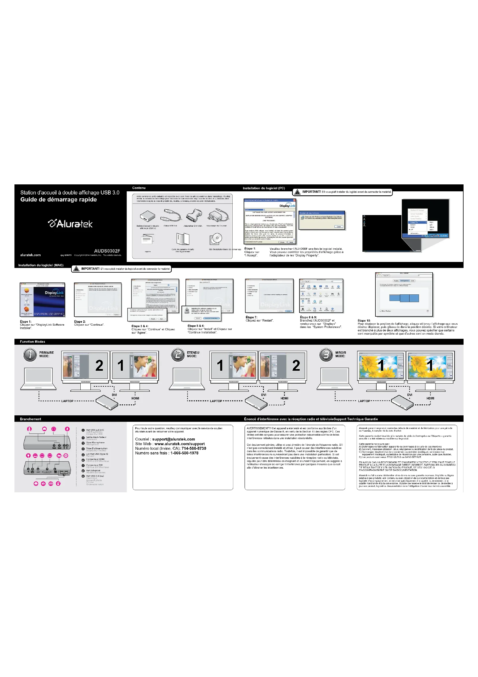 Station d’accueil à double affichage USB 3.0 qsg Q10373 Copyright © 2014 Aluratek, Inc. Tous droits réservés.aluratek.com Guide de démarrage rapide AUDS0302F Énoncé d’interférence avec la réception radio et téléviséeSupport Technique GarantieAVERTISSEMENT!!! Cet appareil a été testé et est conforme aux limites d’un appareil numérique de Classe B, en vertu de la Section 15 des règles CFC. Ces limites ont été conçues pour assurer une protection raisonnable contre de telles interférences néfastes dans une installation résidentielle.Cet équipement génère, utilise et peut émettre de l’énergie de fréquence radio. S’il n’est pas correctement installé et utilisé, il peut causer des interférences nuisibles dans les communications radio. Toutefois, il est impossible de garantir que de telles interférences ne surviendront pas dans une installation particulière. Si cet équipement cause des interférences nuisibles à la réception radio ou télévisée, laquelle peut être déterminée en éteignant et allumant l’équipement, on suggère à l’utilisateur d’essayer de corriger l’interférence par quelques mesures que ce soit afin d’éliminer les interférences.Aluratek garantit se produit contre les défauts de matériel et de fabrication pour une période de 1 année, à compter de la date d’achat.Cette garantie devient invalide si le numéro de série de l’entreprise ou l’étiquette « garantie annulée » a été retirée ou modifiée sur le produit. Cette garantie ne couvre pas :A) Dommages de fabrication apparente ou dommages à la suite de cas imprévusB) Accident, mauvaise utilisation, abus, négligence ou modification de toute pièce du produit. C) Dommages résultant d’un fonctionnement ou entretien inadéquat, connexion à un équipement inadéquat, ou tentative de réparation par une personne, autre que Aluratek. D) Les produits sont venus TELS QUELS ou SANS DÉFAUT.EN AUCUN CAS, LA RESPONSABILITÉ D’ALURATEK N’EXCÈDE LE PRIX PAYÉ POUR LE PRODUIT À LA SUITE D’UN DOMMAGE DIRECT, INDIRECT, PARTICULIER OU CONSÉCU-TIF RÉSULTANT DE L’UTILISATION DU PRODUIT, DE SES LOGICIELS D’ACCOMPAGNEMENT OU DE SA DOCUMENTATION.Aluratek ne fait aucune déclaration et ne donne aucune garantie expresse, implicite ou légale relative à ses produits, son contenu ou son utilisation de la documentation et de tous ses logiciels d’accompagnement, et renonce spécifiquement à la qualité, au rendement, à la qualité marchande et à la convenance. Aluratek se réserve le droit de réviser ou de mettre à jour son produit, logiciel ou documentation sans l’obligation d’aviser tout individu ou entité.Pour toute autre question, veuillez communiquer avec le service de soutien Aluratek avant de retourner votre appareil. Courriel : support@aluratek.com Site Web : www.aluratek.com/support Numéro local (Irvine, CA): 714-586-8730 Numéro sans frais : 1-866-580-1978 Station d’accueil à double affichage USB 3.0 Câble USB 3.0 Adaptateur DVI-VGA Adaptateur de Courant BranchementFunction ModesPRIMAIREMODE: ÉTENDU MODE: MIROIR MODE: