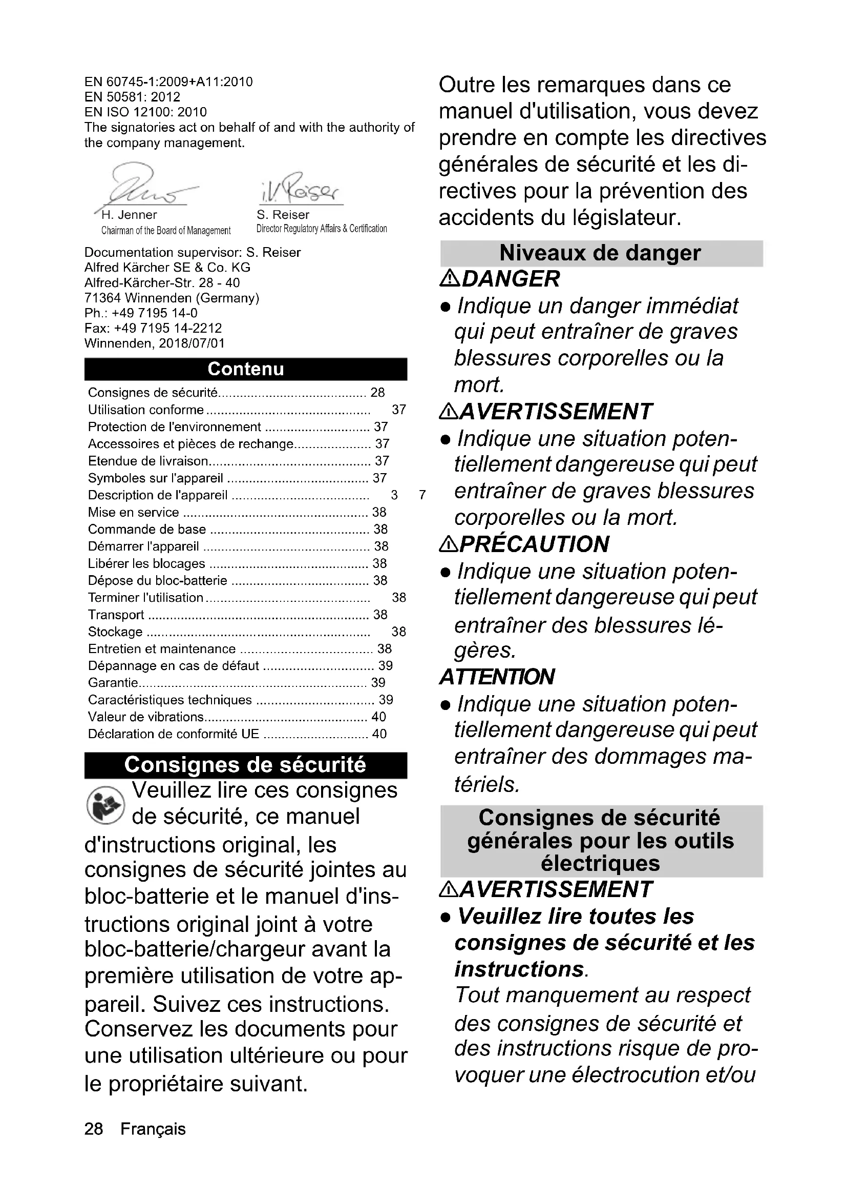• 1,5 Dimensions and weights Length x width x height mm 911 x 96 x 212 Weight (without battery pack) kg 2,428 Français EN 60745-1:2009+A11:2010 EN 50581: 2012 EN ISO 12100: 2010 The signatories act on behalf of and with the authority of the company management. Documentation supervisor: S. Reiser Alfred Kärcher SE & Co. KG Alfred-Kärcher-Str. 28 - 40 71364 Winnenden (Germany) Ph.: +49 7195 14-0 Fax: +49 7195 14-2212 Winnenden, 2018/07/01 Contenu Consignes de sécurité Veuillez lire ces consignes de sécurité, ce manuel d'instructions original, les consignes de sécurité jointes au bloc-batterie et le manuel d'ins- tructions original joint à votre bloc-batterie/chargeur avant la première utilisation de votre ap- pareil. Suivez ces instructions. Conservez les documents pour une utilisation ultérieure ou pour le propriétaire suivant. Outre les remarques dans ce manuel d'utilisation, vous devez prendre en compte les directives générales de sécurité et les di- rectives pour la prévention des accidents du législateur. Niveaux de danger DANGER ● Indique un danger immédiat qui peut entraîner de graves blessures corporelles ou la mort. 몇 AVERTISSEMENT ● Indique une situation poten- tiellement dangereuse qui peut entraîner de graves blessures corporelles ou la mort. 몇 PRÉCAUTION ● Indique une situation poten- tiellement dangereuse qui peut entraîner des blessures lé- gères. ATTENTION ● Indique une situation poten- tiellement dangereuse qui peut entraîner des dommages ma- tériels. Consignes de sécurité générales pour les outils électriques 몇 AVERTISSEMENT ● Veuillez lire toutes les consignes de sécurité et les instructions. Tout manquement au respect des consignes de sécurité et des instructions risque de pro- voquer une électrocution et/ou Consignes de sécurité p. 28