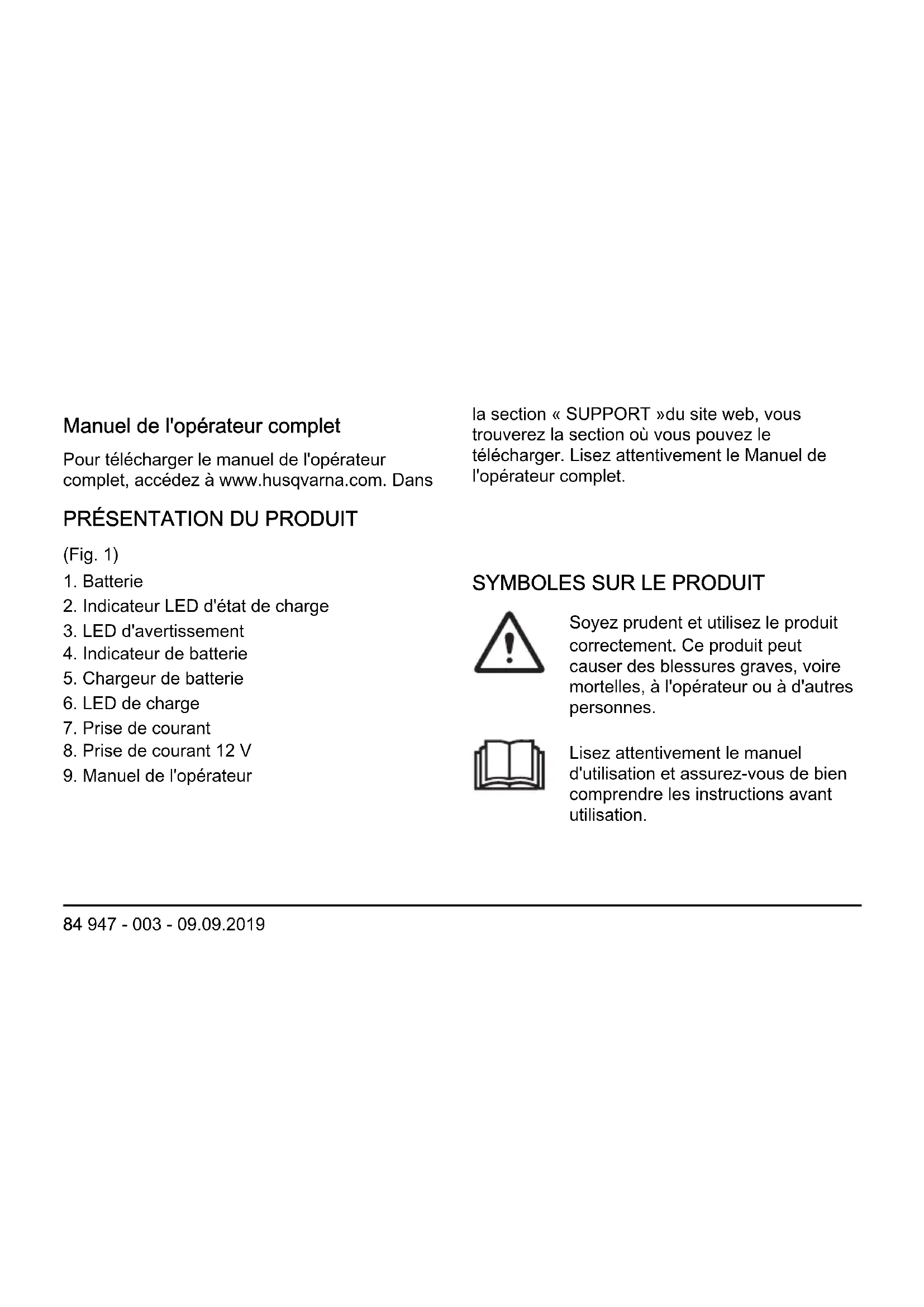 Soyez prudent et utilisez le produit correctement. Ce produit peut causer des blessures graves, voire mortelles, à l'opérateur ou à d'autres personnes. Lisez attentivement le manuel d'utilisation et assurez-vous de bien comprendre les instructions avant utilisation. 84 947 - 003 - 09.09.2019Le produit est conforme aux directives CE en vigueur. Le produit ou son emballage ne font pas partie des ordures ménagères. Déposez-le dans un site de recyclage approprié pour équipements électriques et électroniques. Maintenez l'appareil à l'abri de l'eau et de la pluie. Utilisez et stockez le chargeur de batterie en intérieur uniquement. Remarque: Les autres symboles/autocollants présents sur le produit concernent des exigences de certification spécifiques à certaines zones commerciales.