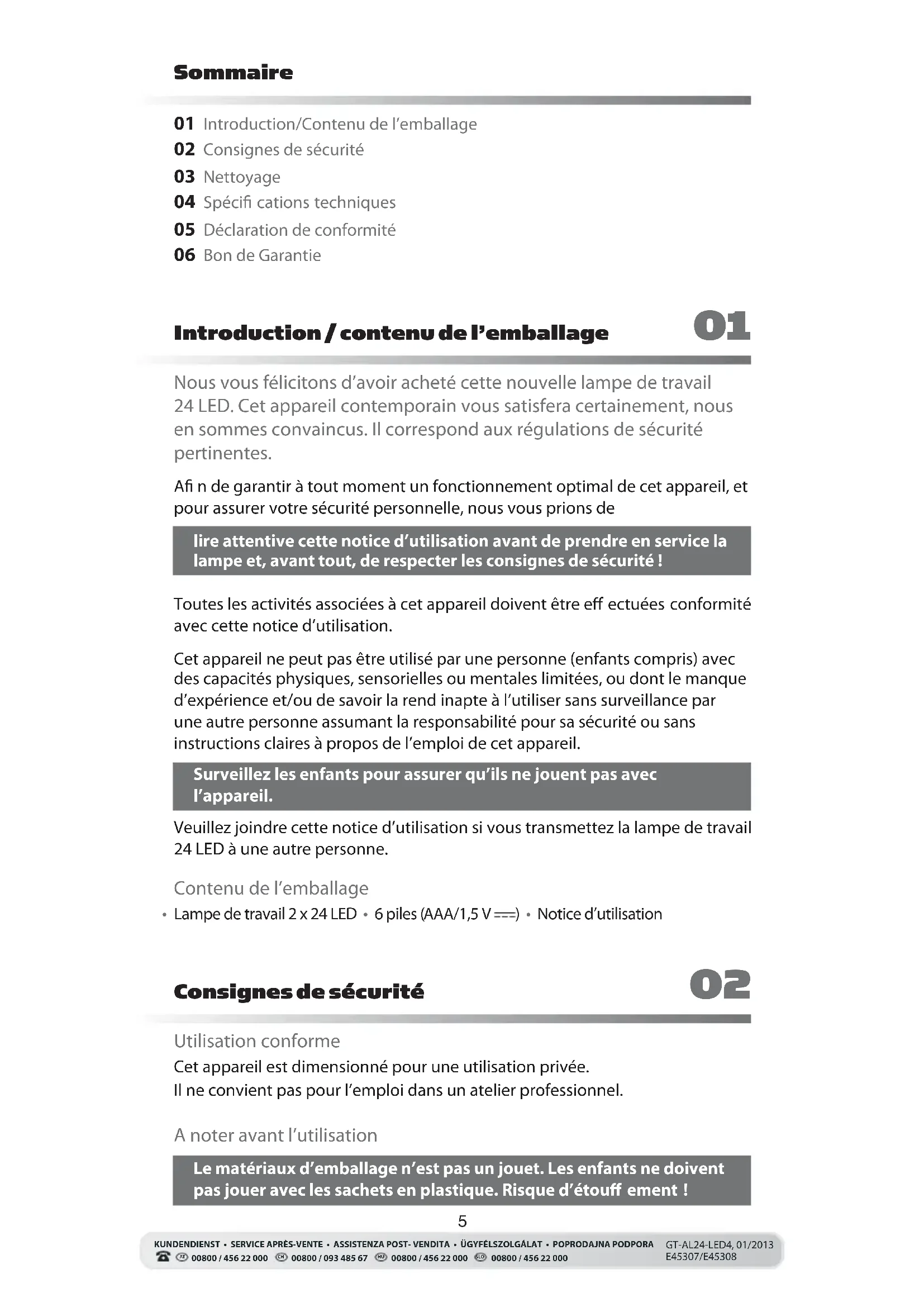 01 Introduction/Contenu de l’emballage 02 Consignes de sécurité 03 Nettoyage 04 Spéci cations techniques 05 Déclaration de conformité 06 Bon de Garantie Sommaire Introduction / contenu de l’emballage