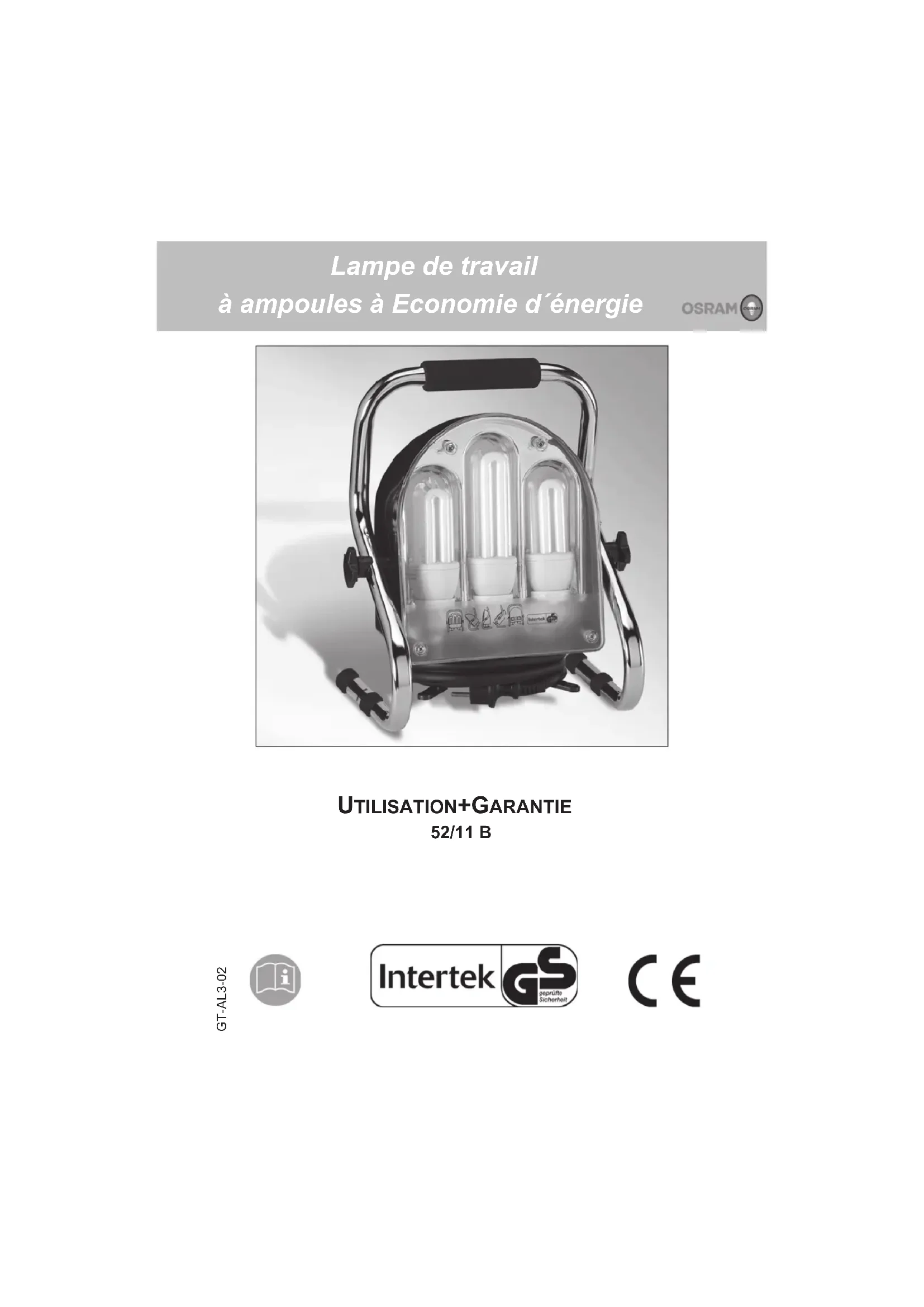 - UTILISATION + GARANTIE 52/11 B GT-AL3-02 Lampe de travail à ampoules à Economie d´énergie2 Veuillez lire attentivement des informations ci-après et conserver cette notice d'utilisation afin de pouvoir le consulter plus tard si vous en avez besoin. Veuillez joindre cette notice d'utilisation quand vous transmettez cet appareil à une autre personne. Utilisation conforme ! Le luminaire de travail est destiné à l'éclairage à l'intérieur et l'extérieur. Il est possible de raccorder d'autres appareils grâce aux prises au dos (par exemple un fer à souder ou un pistolet à colle,