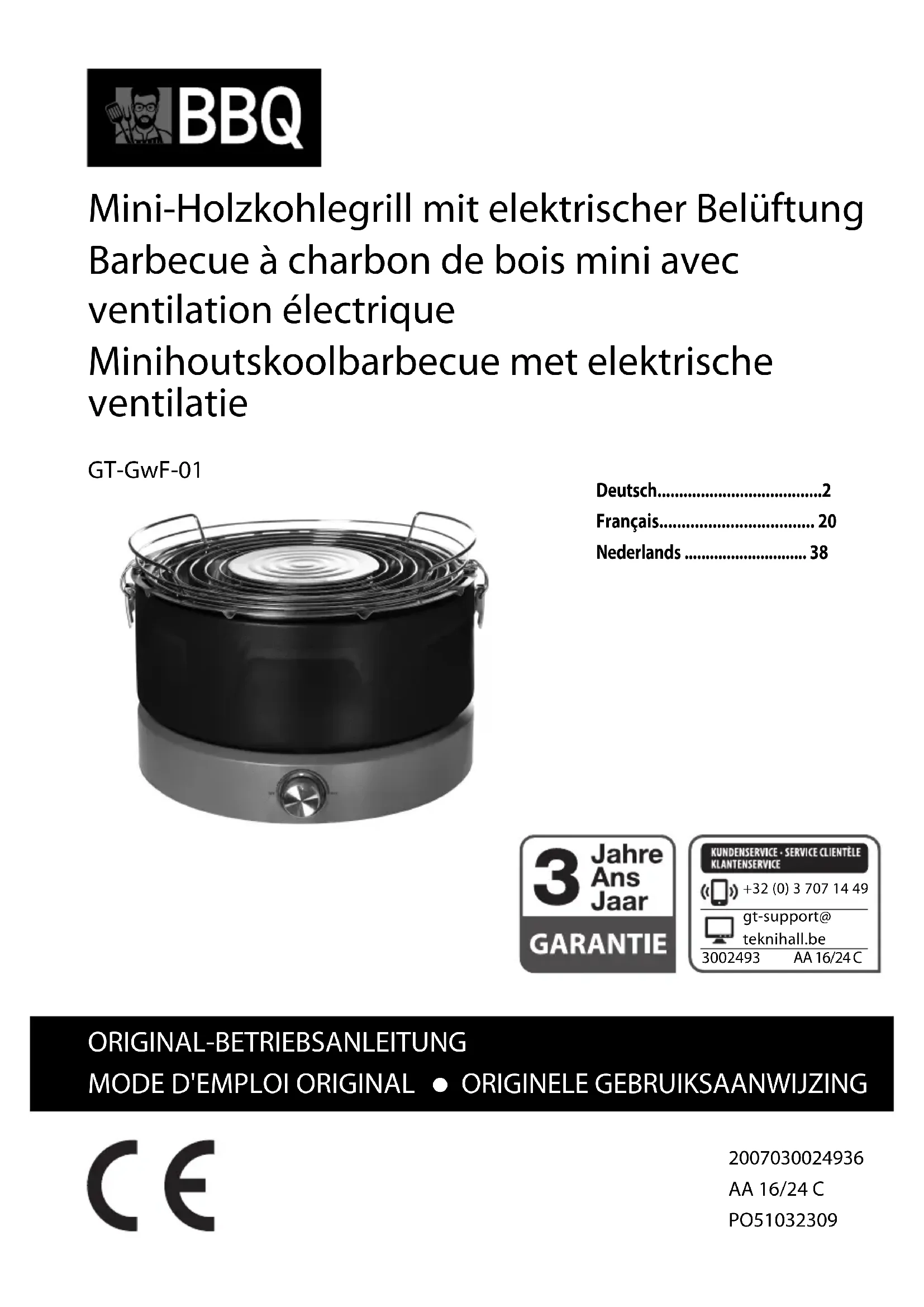 Retirez les piles du compartiment à piles si vous n’utilisez pas le barbe- cue pendant une durée prolongée.34 Pannes et solutions Panne Causes possibles et solution Il est difficile ou impossible d’obtenir des braises correctes. Vous utilisez trop peu de gel allume-feu. -Utilisez plus de gel allume-feu. Vous utilisez du charbon de bois humide ou de mauvaise qualité. -Utilisez du charbon de bois sec et de qualité supérieure, de préférence du charbon de bois de hêtre. Le ventilateur ne fournit pas assez de puis- sance. -Tournez le bouton marche / arrêt dans le sens des aiguilles d'une montre, jusqu'à la butée (MAX). Les piles sont usagées sont usées. -Installez des piles neuves. Une forte fumée se dégage au moment de l'allumage. Le ventilateur ne fournit pas assez d'air. -Tournez le bouton marche / arrêt dans le sens des aiguilles d'une montre, jusqu'à la butée (MAX). Vous utilisez du charbon de bois humide ou de mauvaise qualité. -Utilisez du charbon de bois sec et de qualité supérieure, de préférence du charbon de bois de hêtre. Le charbon de bois est rapide- ment consommé. Pas assez de charbon dans le réservoir à char- bon de bois. -Remplissez le conteneur jusqu'au bord de charbon de bois. Ne pas surcharger, le cou- vercle doit pouvoir être bien posé. Si néces- saire, cassez en deux les morceaux trop gros, afin de pouvoir bien remplir le réservoir à charbon de bois. Le ventilateur a tout le temps tourné à plein régime. -Lorsque le charbon de bois est incandescent, tournez le bouton marche / arrêt pour baisser le régime du ventilateur. Cela vous permettra de cuisiner plus facilement et le charbon de bois durera plus longtemps.35 Données techniques Modèle : GT-GwF-01 Alimentation électrique : 4x LR6 (AA) / 1,5 V , 6 V , 250 mA Numéro de révision : 2024_01 Des modifications techniques et visuelles sont possibles, nos produits étant en permanence développés et améliorés. Cette notice d'utilisation peut être téléchargée en format PDF sur notre site Inter- net www.gt-support.de. Déclaration de conformité Ce produit est certifié conforme aux normes prévues par la loi. Vous trouverez la déclaration de conformité intégrale sur Internet à l'adresse www.gt-support.de. Recyclage Élimination de l’emballage Éliminez l’emballage selon les sortes. Mettez le carton dans la collecte de vieux papier, les films dans la collecte de recyclage. Élimination de l’appareil Les appareils usagés ne doivent pas être jetés avec les déchets ménagers! Le symbole de la poubelle barrée signifie que les appareils électriques et électroniques ne doivent jamais être jetés dans la poubelle des ordures ménagères. Les consommateurs sont contraints par la loi de jeter les appareils électriques et électroniques arrivés en fin de vie, séparément des déchets ména- gers non triés. Cela permettra de garantir une valorisation des déchets respec- tueuse de l’environnement et des ressources. La chaleur n'est plus suffisante pour faire cuire des aliments. Il y a trop de vent ou il n'y a plus de charbon de bois. -Installez le barbecue dans un endroit abrité du vent ou rajoutez du charbon de bois (voir " Rajouter du charbon de bois ").36 Les batteries et accumulateurs qui ne sont pas fixés dans l’appareil électrique ou électronique et qui peuvent être extraits sans dommage, doivent être retirés de l’appareil avant de l’emmener dans un point de collecte et éliminés de manière appropriée. Cela s’applique également aux ampoules qui peuvent être extraites de l’appareil sans dommage. Les propriétaires privés d’appareils électriques et électroniques peuvent les dépo- ser dans des déchetteries municipales ou les déposer dans les points de collecte mis en place par les fabricants ou les revendeurs. Le dépôt d’appareils usagés est gratuit. D’une manière générale, les revendeurs sont tenus de proposer un service gratuit de reprise des appareils usagés, en mettant à disposition des points de collecte appropriés, à une distance raisonnable. Les consommateurs ont la possibilité de déposer gratuitement un appareil usagé auprès d’un revendeur soumis à l’obligation de reprendre ces appareils, lorsqu’ils achètent un appareil neuf équivalent, offrant globalement les mêmes fonctions. Cette possibilité est aussi offerte pour les livraisons à un ménage privé. Ne jetez pas les piles et batteries dans les ordures ménagères ! La loi oblige les consommateurs à déposer les piles et batteries, qu’elles contiennent des substances nocives ou non, dans un point de collecte de leur commune ou chez un commerçant, afin de les éliminer de manière écologique et de recycler les matières premières qui les composent. Les batteries et accumulateurs qui ne sont pas fixés dans l’appareil électrique ou électronique et qui peuvent être extraits sans dommage, doivent être retirés de l’appareil avant de l’emmener dans un point de collecte et éliminés de manière appropriée. Avant de jeter les piles et batteries au lithium, collez les bornes pour éviter un court-circuit externe. Jetez uniquement les piles et batteries déchargées.Carte de garantie Article: Barbecue à charbon de bois mini avec ventilation électrique (Art. 3002493) Conditions de la garantie Le produit que vous venez d’acheter a été fabriqué soigneusement et sous surveillance constante. La période de garantie a une durée de 3 ans à compter de la date d’achat.