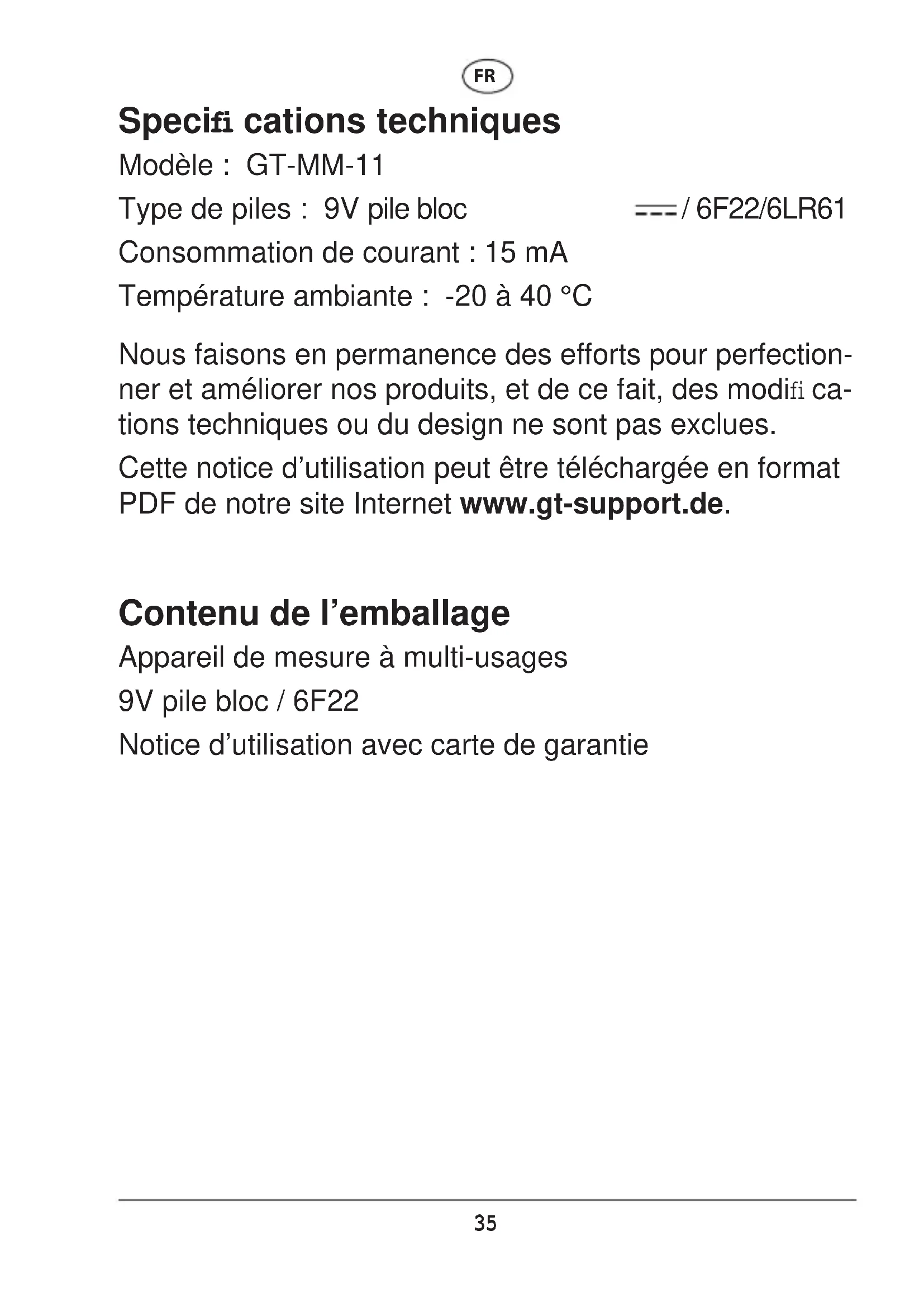 - Garantie Carte de la garantie La protection prévue peut être compromise si appareil n’est pas utilisé conformément à ce mode d’emploi. Conservez ce mode d’emploi et transmettez-le aux autres utilisateurs. FR35 Specifi cations techniques Modèle : GT-MM-11 Type de piles : 9V pile bloc / 6F22/6LR61 Consommation de courant : 15 mA Température ambiante : -20 à 40 °C Nous faisons en permanence des efforts pour perfection- ner et améliorer nos produits, et de ce fait, des modifi ca- tions techniques ou du design ne sont pas exclues. Cette notice d’utilisation peut être téléchargée en format PDF de notre site Internet www.gt-support.de. Contenu de l’emballage Appareil de mesure à multi-usages 9V pile bloc / 6F22 Notice d’utilisation avec carte de garantie FR36 Consignes de sécurité Lisez attentivement les informations suivantes et conservez cette notice d’utilisation afi n de pouvoir relire plus tard encore. Joignez cette notice quand vous transmettez l’appareil à une autre personnemit. Mise en garde ! Veuillez observer les mesures de sécurité essentielles y compris les consignes sui- vantes relatives à la sécurité contre les incendies lors de l’utilisation des appareils actionnés par piles afi n d’écarter le risque de dommages personnels et matériels. Maintenez votre zone de travail en ordre ! p. 67