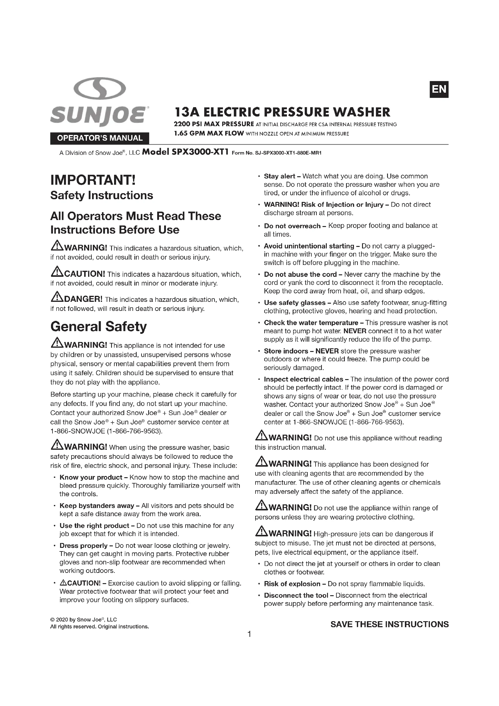 Retrouvez gratuitement la notice de l'appareil SPX3000XT1MP4 Sun Joe au format PDF.