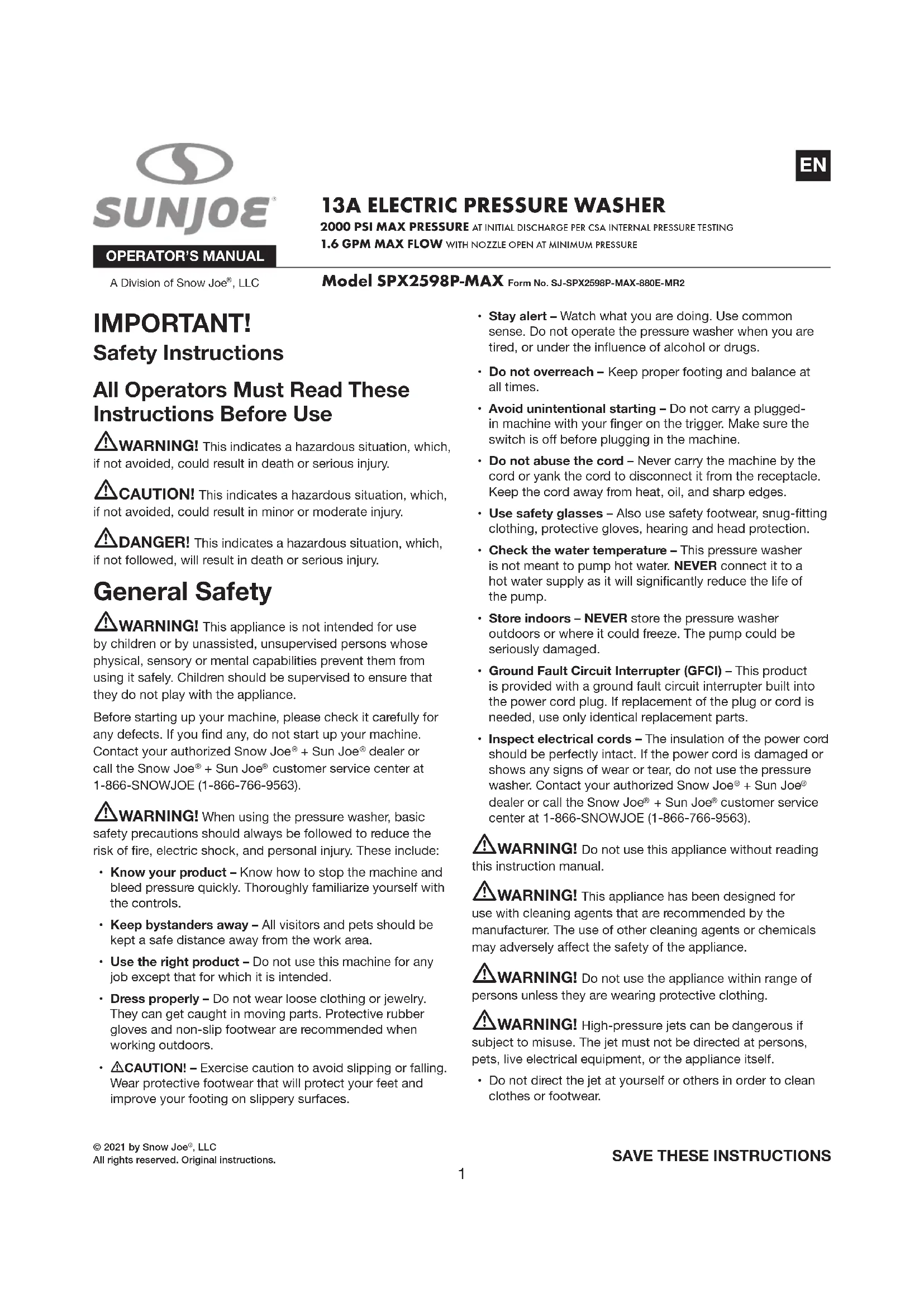 Retrouvez gratuitement la notice de l'appareil SPX2598PMAX Sun Joe au format PDF.