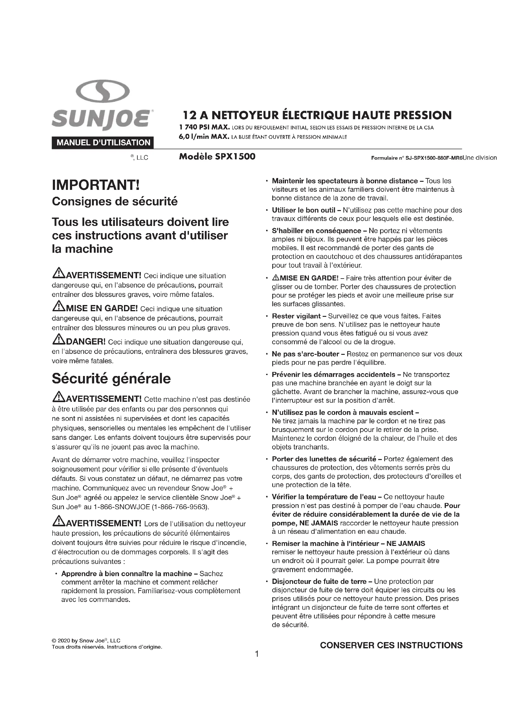 Modèle SPX1500 © 2020 by Snow Joe , LLCTous droits réservés. Instructions d’origine.