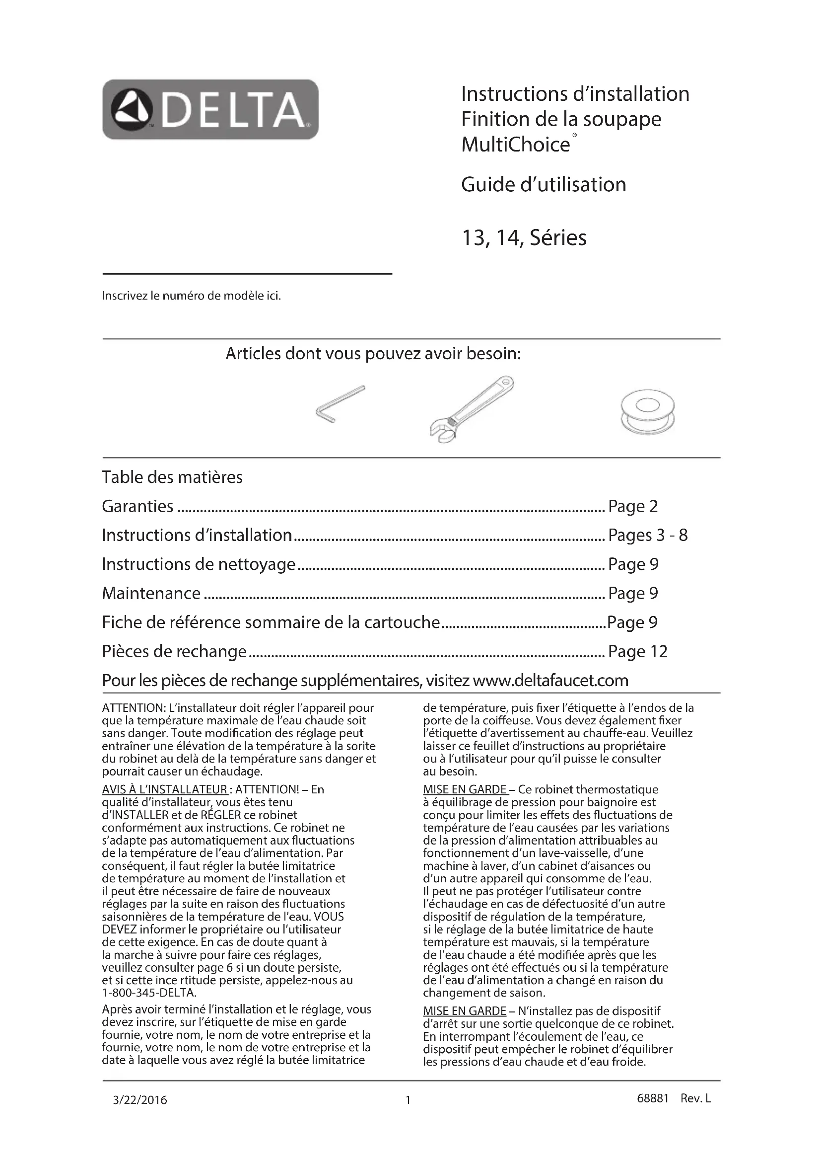 Guide d’utilisation 13, 14, Séries Inscrivez le numéro de modèle ici. Articles dont vous pouvez avoir besoin: Table des matières Garanties .................................................................................................................. Page 2 Instructions d’installation ................................................................................... Pages 3 - 8 Instructions de nettoyage .................................................................................. Page 9 Maintenance ........................................................................................................... Page 9 Fiche de référence sommaire de la cartouche ............................................ Page 9 Pièces de rechange ............................................................................................... Page 12 Pour les pièces de rechange supplémentaires, visitez www.deltafaucet.com de température, puis xer l’étiquette à l’endos de la porte de la coieuse. Vous devez également xer l’étiquette d’avertissement au chaue-eau. Veuillez laisser ce feuillet d’instructions au propriétaire ou à l’utilisateur pour qu’il puisse le consulter au besoin. MISE EN GARDE – Ce robinet thermostatique à équilibrage de pression pour baignoire est conçu pour limiter les eets des uctuations de température de l’eau causées par les variations de la pression d’alimentation attribuables au fonctionnement d’un lave-vaisselle, d’une machine à laver, d’un cabinet d’aisances ou d’un autre appareil qui consomme de l’eau. Il peut ne pas protéger l’utilisateur contre l’échaudage en cas de défectuosité d’un autre dispositif de régulation de la température, si le réglage de la butée limitatrice de haute température est mauvais, si la température de l’eau chaude a été modiée après que les réglages ont été eectués ou si la température de l’eau d’alimentation a changé en raison du changement de saison. MISE EN GARDE – N’installez pas de dispositif d’arrêt sur une sortie quelconque de ce robinet. En interrompant l’écoulement de l’eau, ce dispositif peut empêcher le robinet d’équilibrer les pressions d’eau chaude et d’eau froide. ATTENTION: L’installateur doit régler l’appareil pour que la température maximale de l’eau chaude soit sans danger. Toute modication des réglage peut entraîner une élévation de la température à la sorite du robinet au delà de la température sans danger et pourrait causer un échaudage. AVIS À L’INSTALLATEUR : ATTENTION!–En qualité d’installateur, vous êtes tenu d’INSTALLER et de RÉGLER ce robinet conformément aux instructions. Ce robinet ne s’adapte pas automatiquement aux uctuations de la température de l’eau d’alimentation. Par conséquent, il faut régler la butée limitatrice de température au moment de l’installation et il peut être nécessaire de faire de nouveaux réglages par la suite en raison des uctuations saisonnières de la température de l’eau. VOUS DEVEZ informer le propriétaire ou l’utilisateur de cette exigence. En cas de doute quant à la marche à suivre pour faire ces réglages, veuillez consulter page 6 si un doute persiste, et si cette ince rtitude persiste, appelez-nous au 1-800-345-DELTA. Après avoir terminé l’installation et le réglage, vous devez inscrire, sur l’étiquette de mise en garde fournie, votre nom, le nom de votre entreprise et la fournie, votre nom, le nom de votre entreprise et la date à laquelle vous avez réglé la butée limitatrice