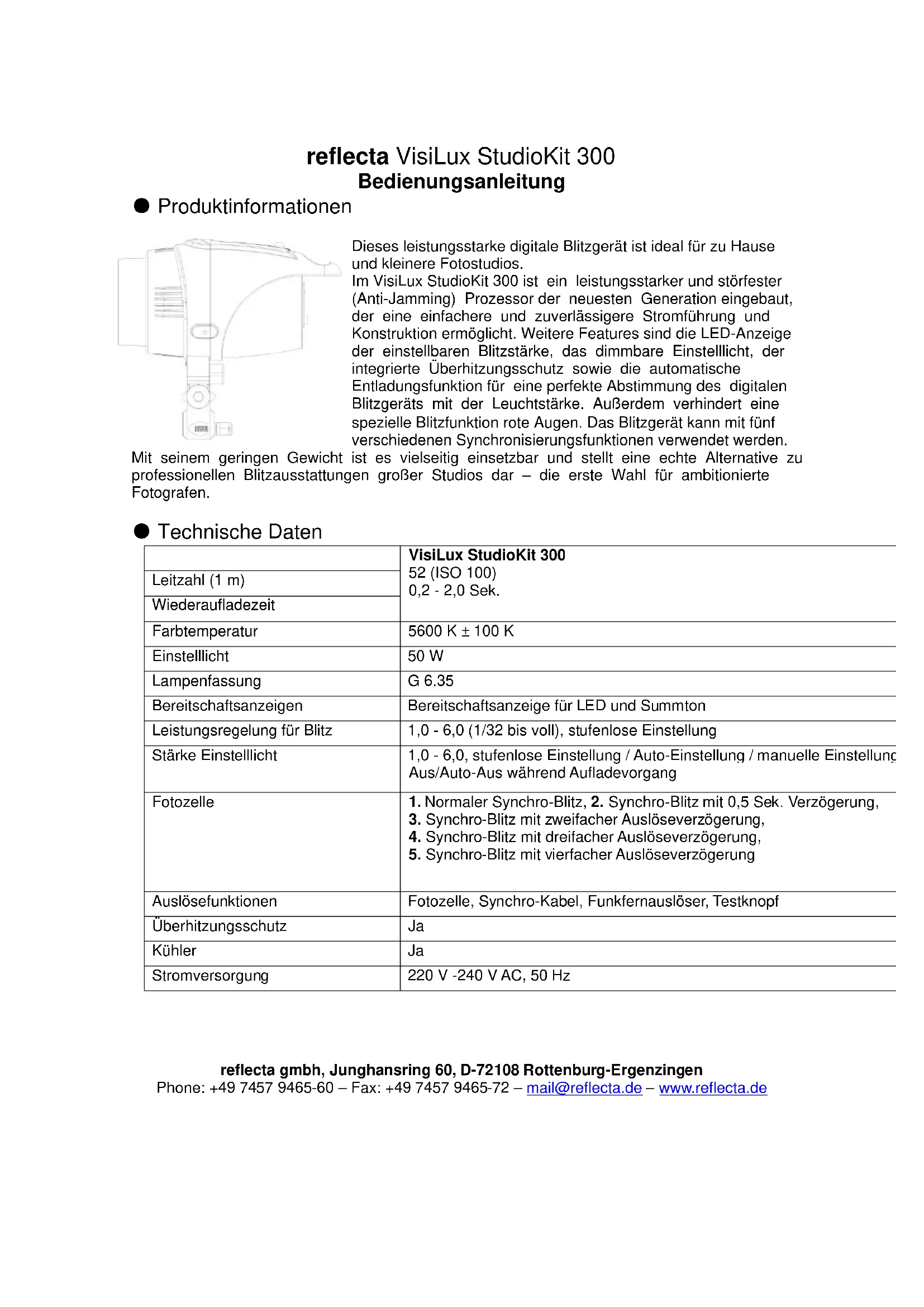 reflecta gmbh, Junghansring 60, D-72108 Rottenburg-Ergenzingen Phone: +49 7457 9465-60 – Fax: +49 7457 9465-72 – mail@reflecta.de – www.reflecta.deVisiLux StudioKit 300 de reflecta Mode d’emploi ● Informations sur le produit Ce flash digital puissant est idéal pour l’usage domestique et dans des petits studios photo. Le VisiLux StudioKit 300 est doté d’un processeur puissant et résistant aux interférences (anti-jamming) de la plus nouvelle génération, qui permet une alimentation en courant et une construction plus simples et fiables. L’affichage LED de la puissance flash réglable, la lumière de mise au point gradable, la protection surchauffe intégrée ainsi que la fonction décharge automatique représentent des caractéristiques additionnelles pour une syntonisation parfaite du flash digital à la puissance d’éclairage. En plus, une fonction flash spéciale empêche les yeux rouges. Le flash se peut utiliser avec cinq fonctions synchro différentes. Grâce à son poids réduit, il offre un usage polyvalent représentant une véritable alternative à l’équipement flash professionnel des grands studios photo – le premier choix pour les photographes ambitieux. ● Caractéristiques techniques VisiLux StudioKit 300