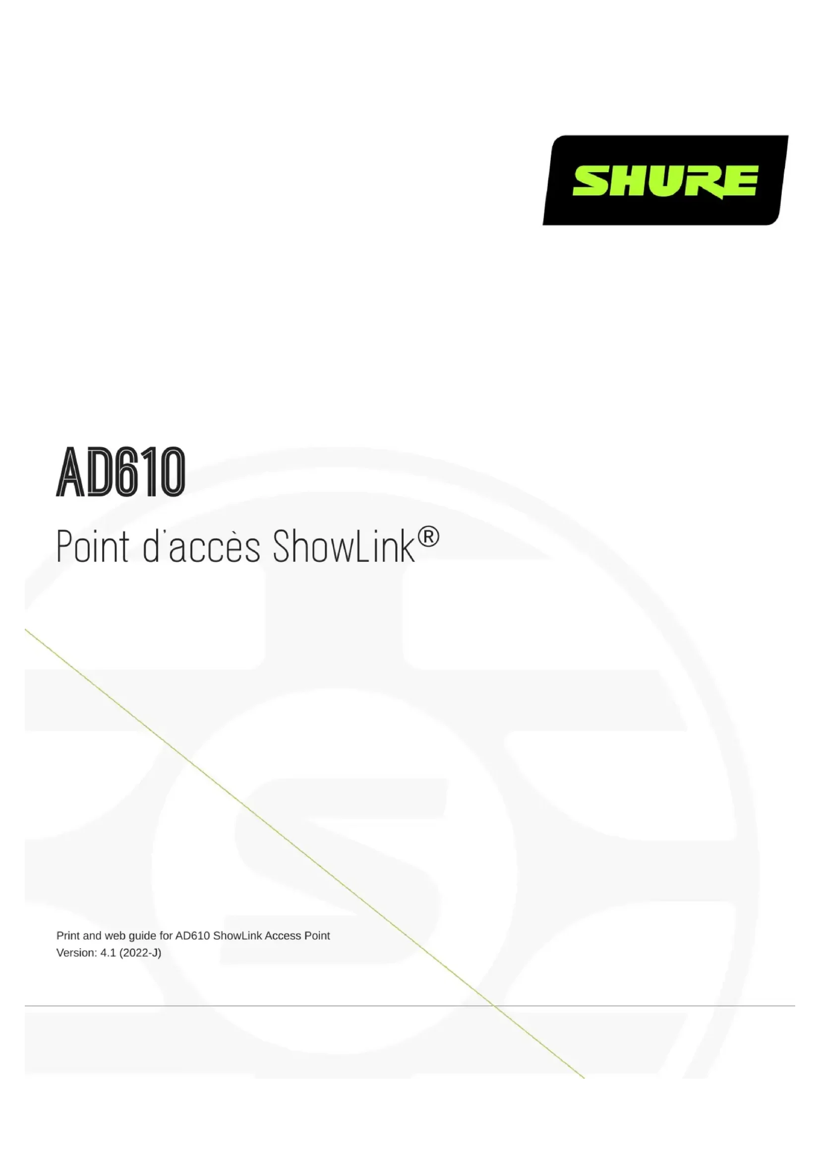 Print and web guide for AD610 ShowLink Access Point Version: 4.1 (2022-J)Shure Incorporated 2/16 Table of Contents AD610 Point d’accès ShowLink® 3 Point d’accès ShowLink AD610 3 Caractéristiques 3 Présentation du point d’accès ShowLink 3 Accessoires fournis 5 Accessoires en option 5 Principes de base du ShowLink 5 Les canaux ShowLink et le spectre 2,4 GHz 5 Zone de couverture 6 Capacité de l’appareil 6 Commande de l’appareil 6 Agilité en fréquence 2,4 GHz pour éviter les interférences 6 Icône ShowLink 6 Alimentation 6 Alimentation via Ethernet 7 Alimentation externe (en option) 7 Mise en réseau 7 Option de réinitialisation 7 Positionnement du point d’accès 8 Mode Réseau 9 Commande et configuration du point d’accès avec Wire less Workbench 9 Réglage des niveaux de puissance 10 Contacter le service client 10 Caractéristiques 10 Homologations 12