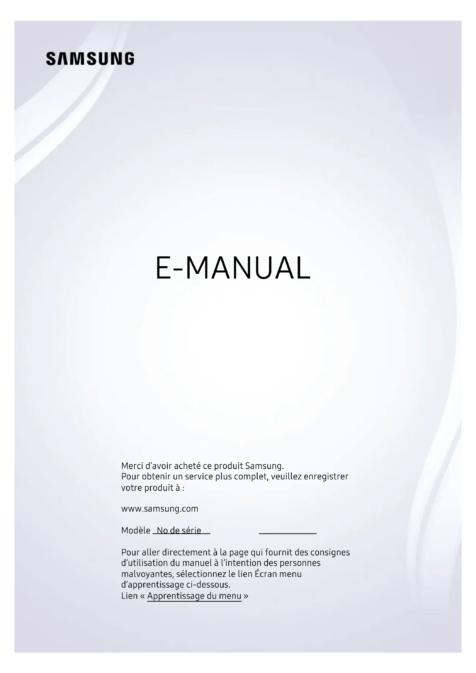 E-MANUAL Merci d’avoir acheté ce produit Samsung. Pour obtenir un service plus complet, veuillez enregistrer votre produit à : www.samsung.com Modèle No de série Pour aller directement à la page qui fournit des consignes d’utilisation du manuel à l’intention des personnes malvoyantes, sélectionnez le lien Écran menu d’apprentissage ci-dessous. Lien « Apprentissage du menu »Table des matières Guide Connexions