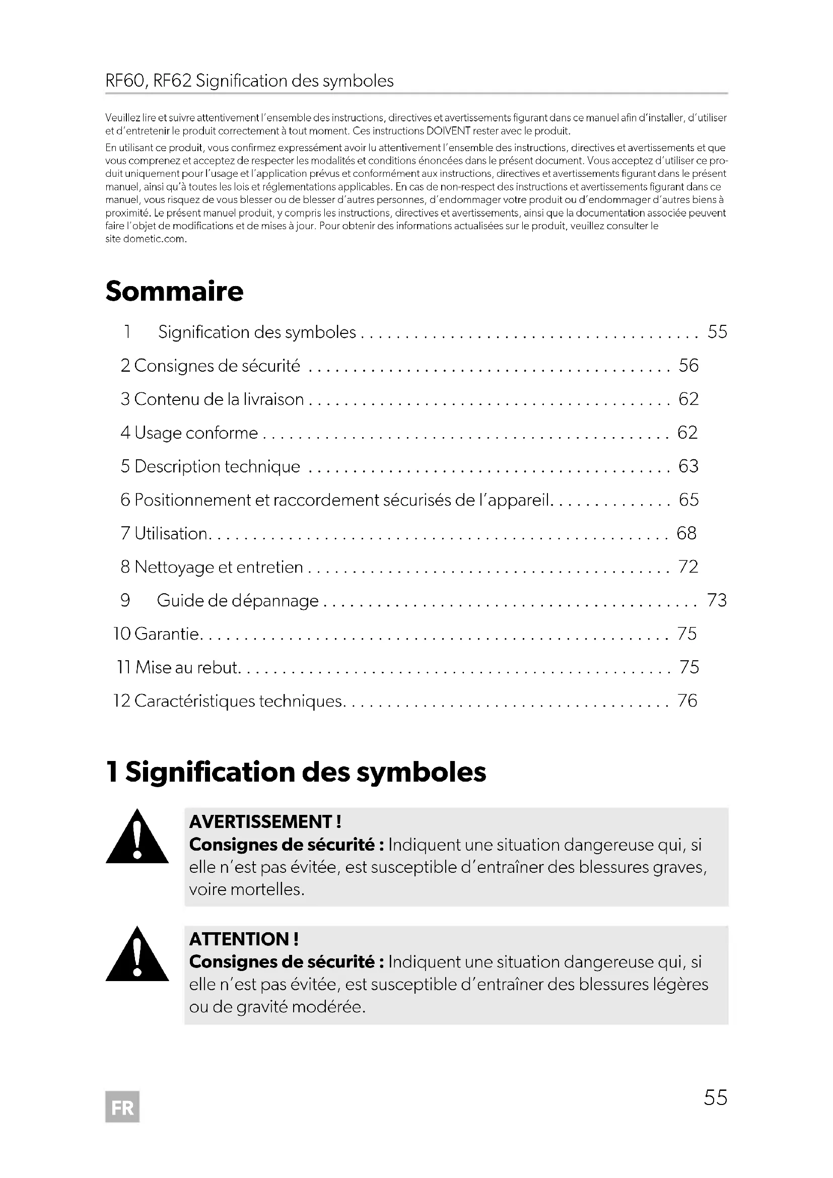- Veuillez lire et suivre attentivement l’ensemble des instructions, directives et avertissements figurant dans ce manuel afin d’installer, d’utiliser et d’entretenir le produit correctement à tout moment. Ces instructions DOIVENT rester avec le produit. En utilisant ce produit, vous confirmez expressément avoir lu attentivement l’ensemble des instructions, directives et avertissements et que vous comprenez et acceptez de respecter les modalités et conditions énoncées dans le présent document. Vous acceptez d’utiliser ce pro- duit uniquement pour l’usage et l’application prévus et conformément aux instructions, directives et avertissements figurant dans le présent manuel, ainsi qu’à toutes les lois et réglementations applicables. En cas de non-respect des instructions et avertissements figurant dans ce manuel, vous risquez de vous blesser ou de blesser d’autres personnes, d’endommager votre produit ou d’endommager d’autres biens à proximité. Le présent manuel produit, y compris les instructions, directives et avertissements, ainsi que la documentation associée peuvent faire l’objet de modifications et de mises à jour. Pour obtenir des informations actualisées sur le produit, veuillez consulter le site dometic.com. Sommaire 1 Signification des symboles p. 55