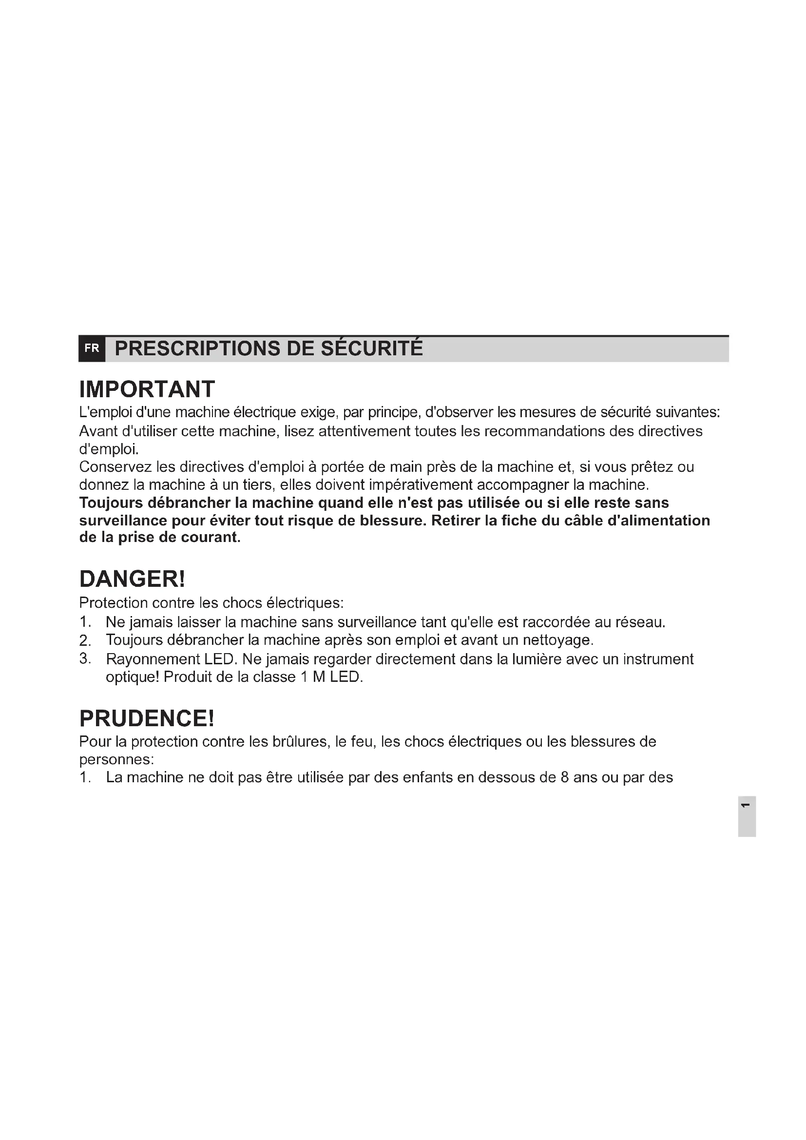 IMPORTANT DANGER! L'emploi d'une machine électrique exige, par principe, d'observer les mesures de sécurité suivantes: Avant d'utiliser cette machine, lisez attentivement toutes les recommandations des directives d'emploi. Conservez les directives d'emploi à portée de main près de la machine et, si vous prêtez ou donnez la machine à un tiers, elles doivent impérativement accompagner la machine. Protection contre les chocs électriques: Ne jamais laisser la machine sans surveillance tant qu'elle est raccordée au réseau. Toujours débrancher la machine après son emploi et avant un nettoyage. Rayonnement LED. Ne jamais regarder directement dans la lumière avec un instrument optique! Produit de la classe 1 M LED. Toujours débrancher la machine quand elle n'est pas utilisée ou si elle reste sans surveillance pour éviter tout risque de blessure. Retirer la fiche du câble d'alimentation de la prise de courant.