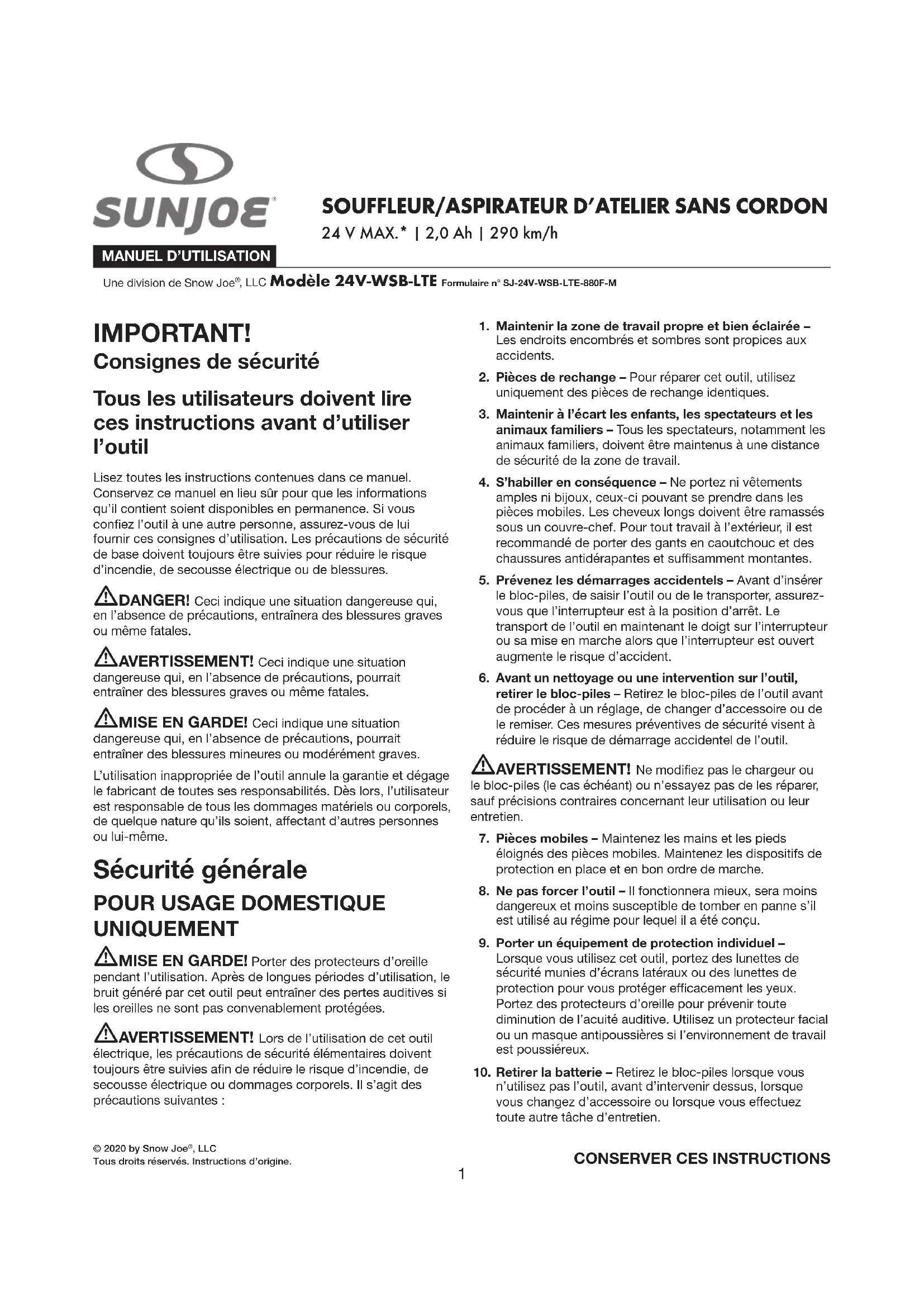 MODE D'EMPLOI 24VWSBLTE Sun Joe